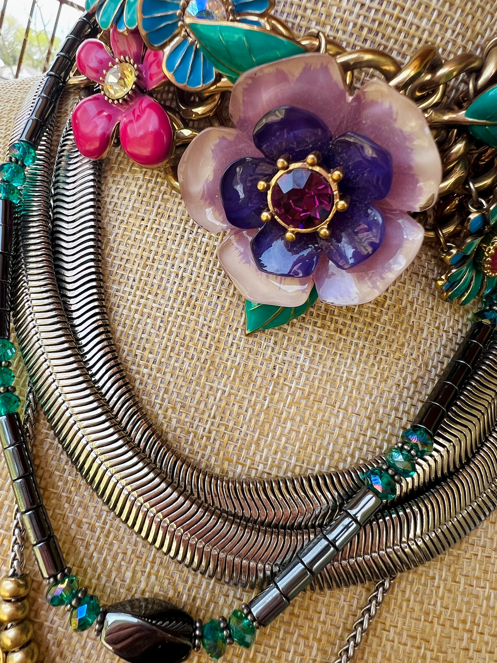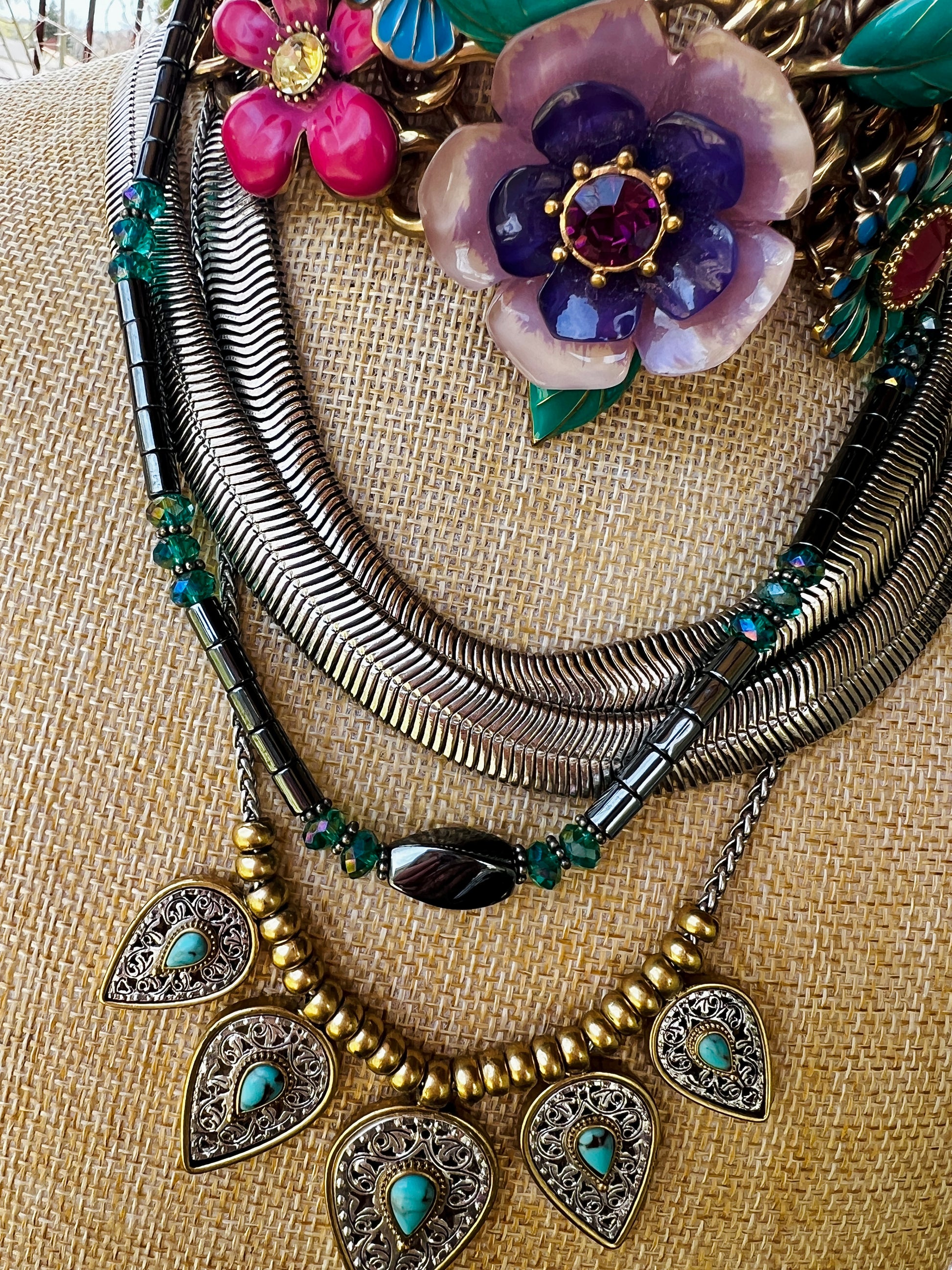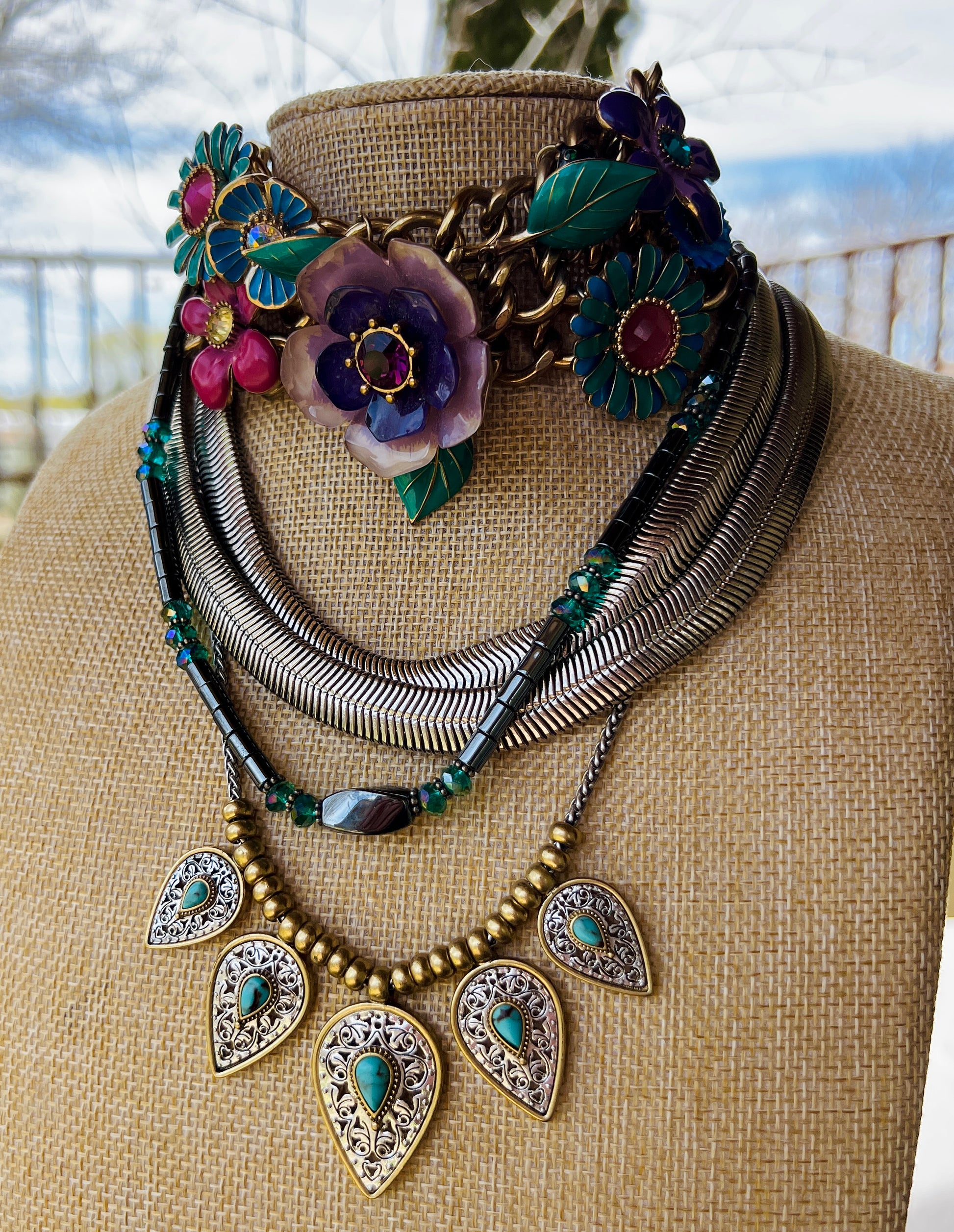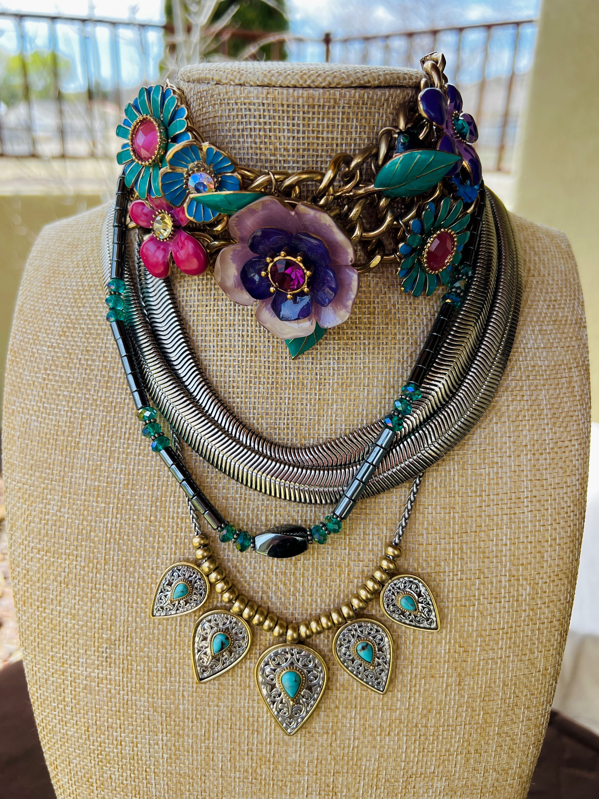 - 14-18 inches - includes 4 pieces - reclaimed beads - reclaimed charms and pendants - mixed metal chains - reclaimed vintage Betsy Johnson flowers - real turquoise