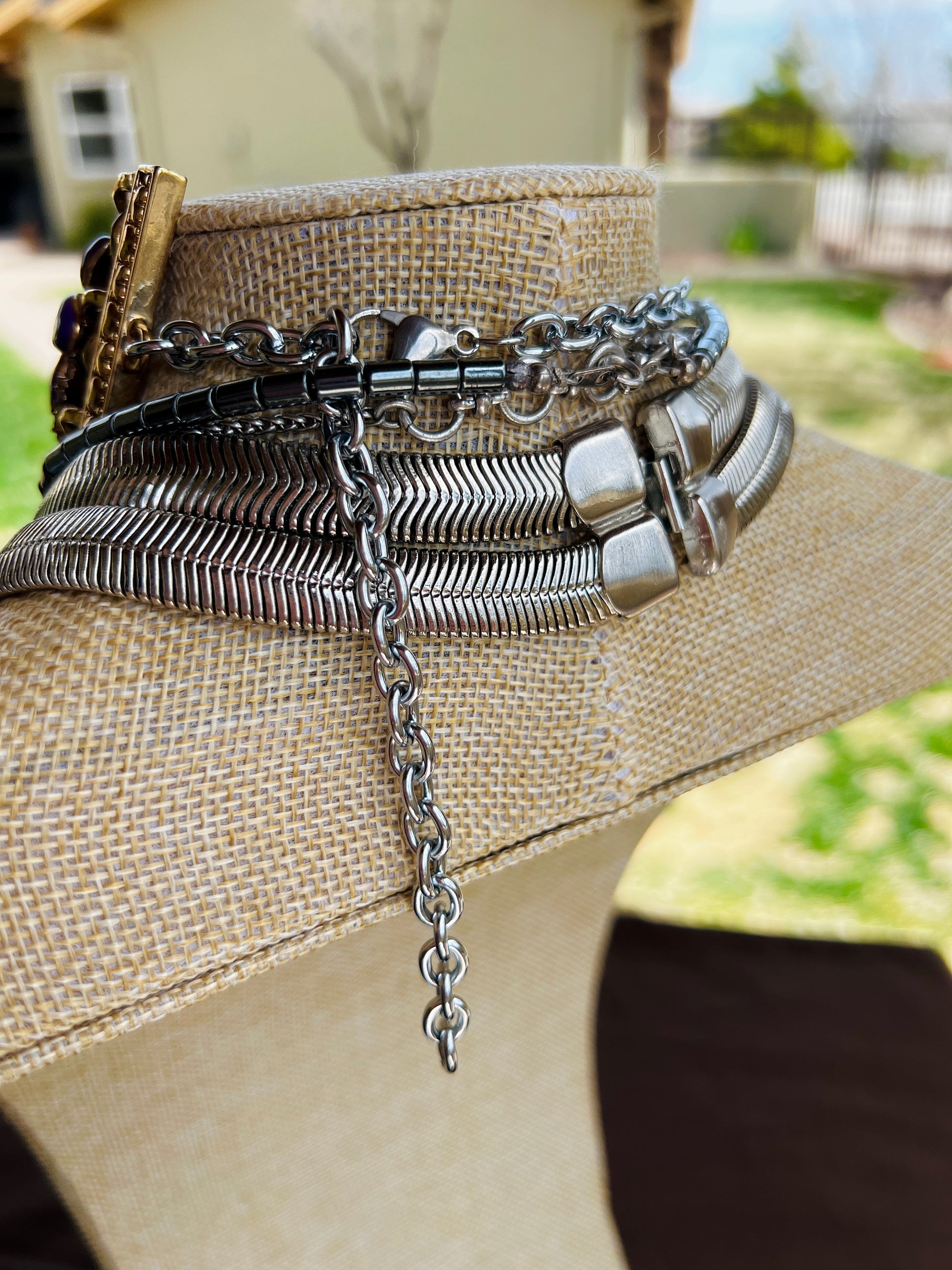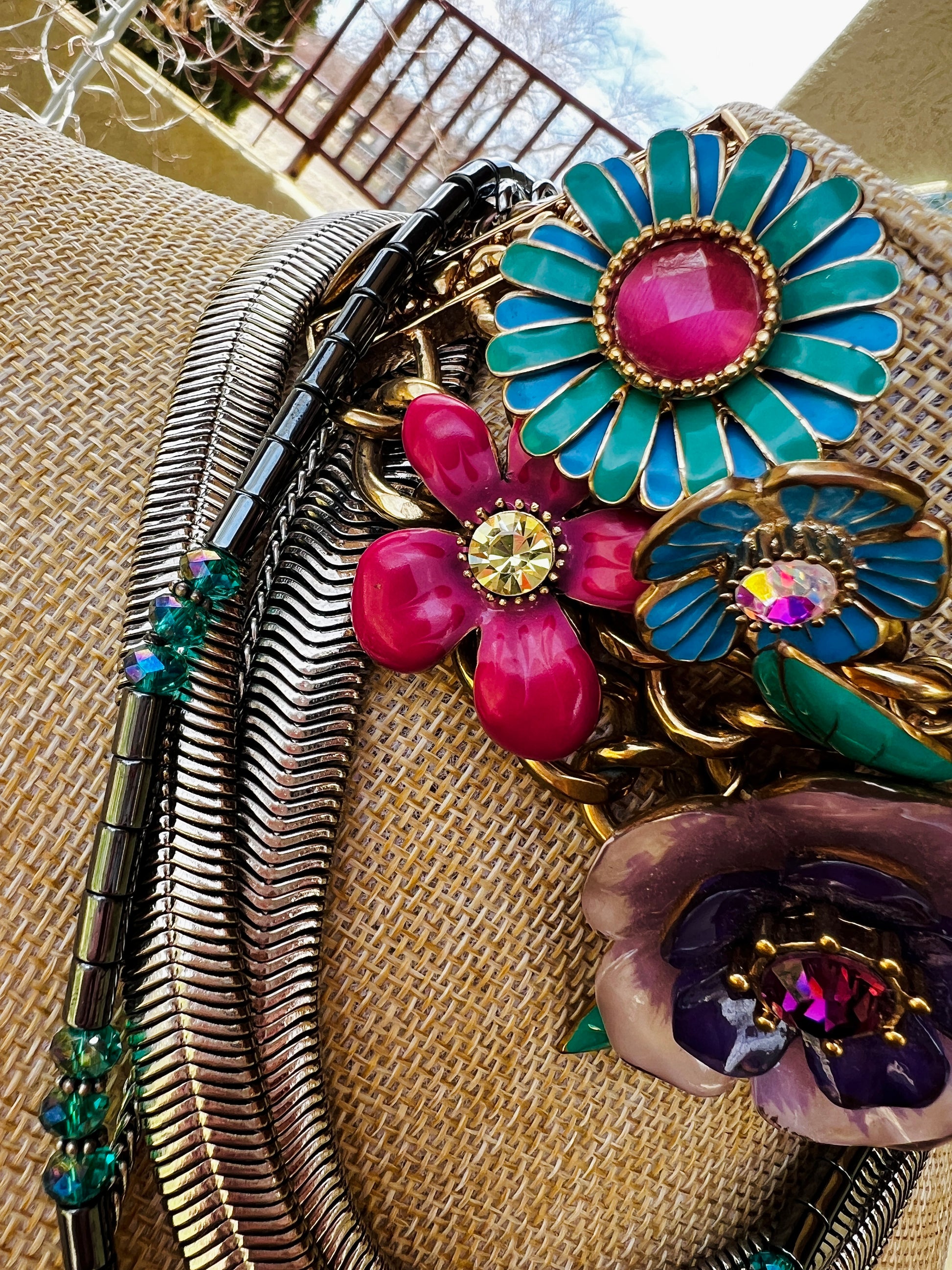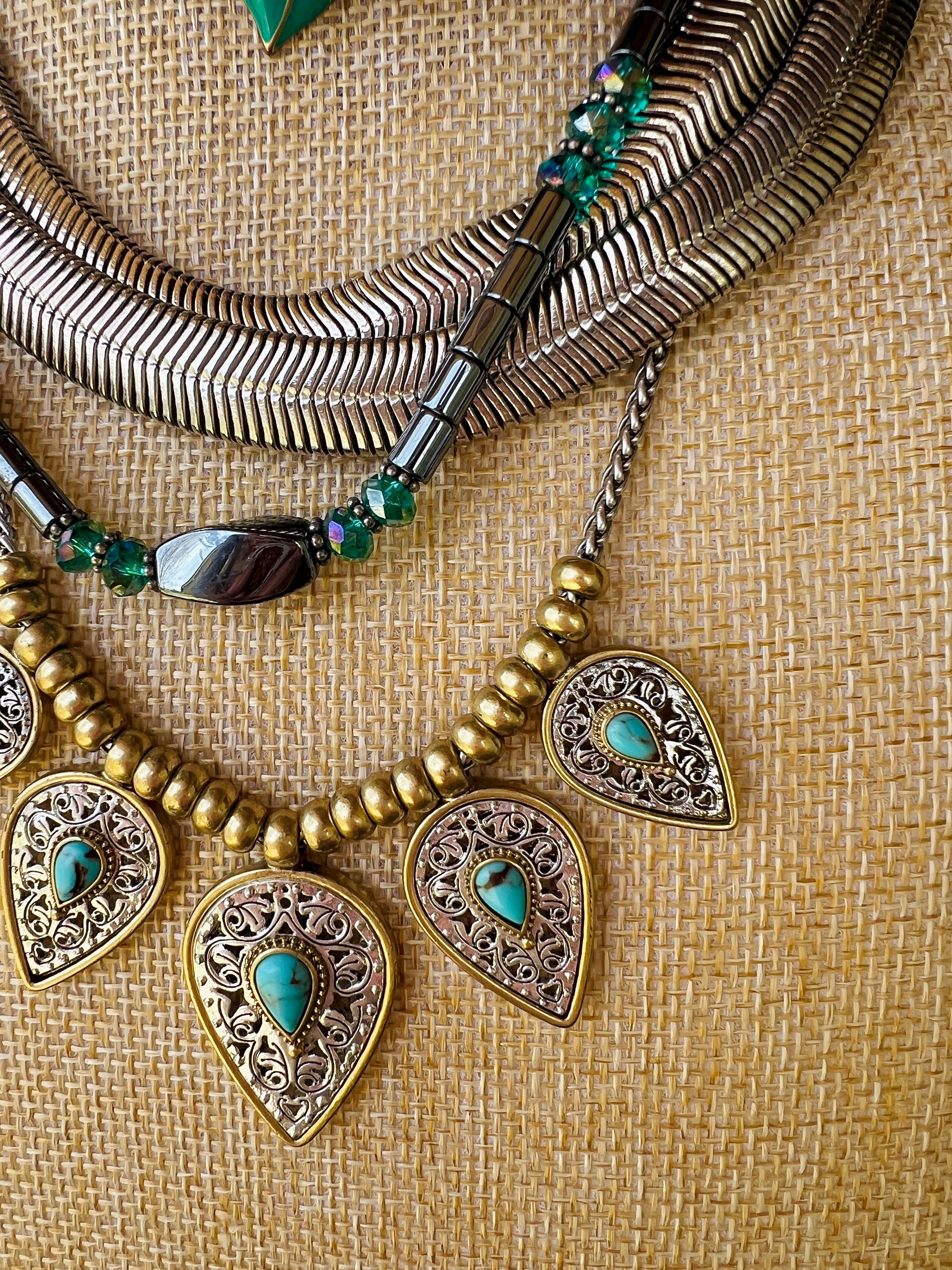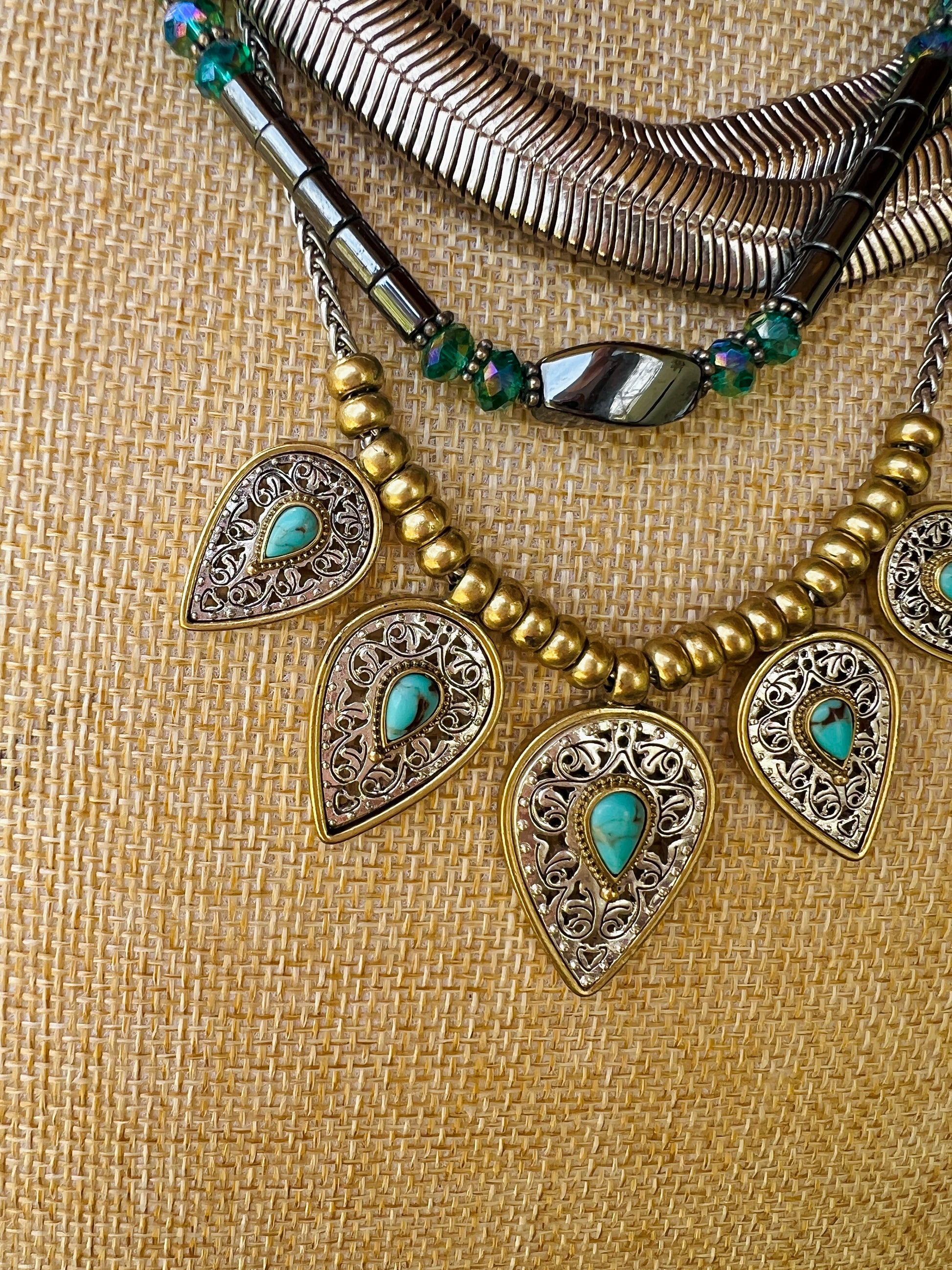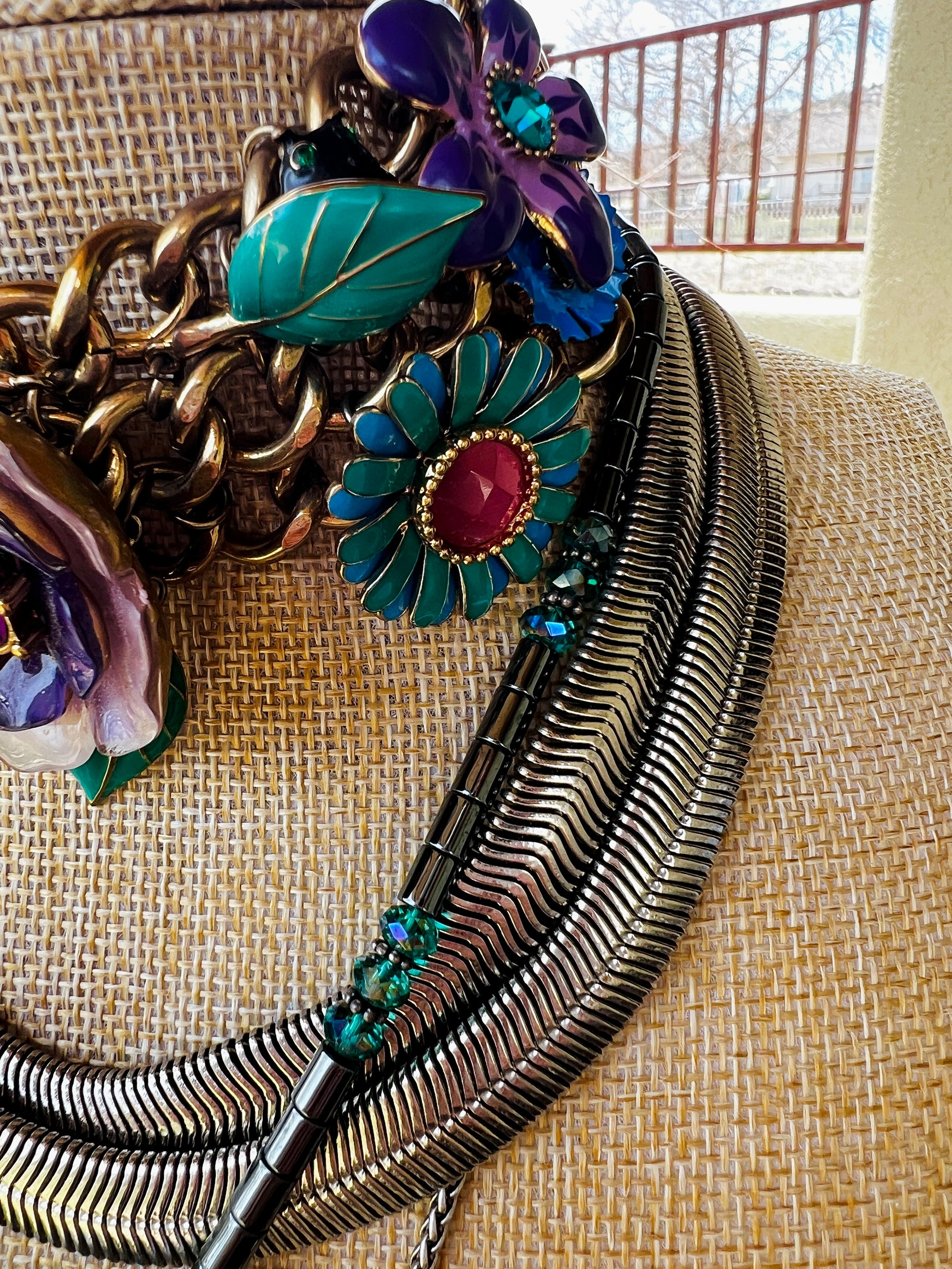 - 14-18 inches - includes 4 pieces - reclaimed beads - reclaimed charms and pendants - mixed metal chains - reclaimed vintage Betsy Johnson flowers - real turquoise