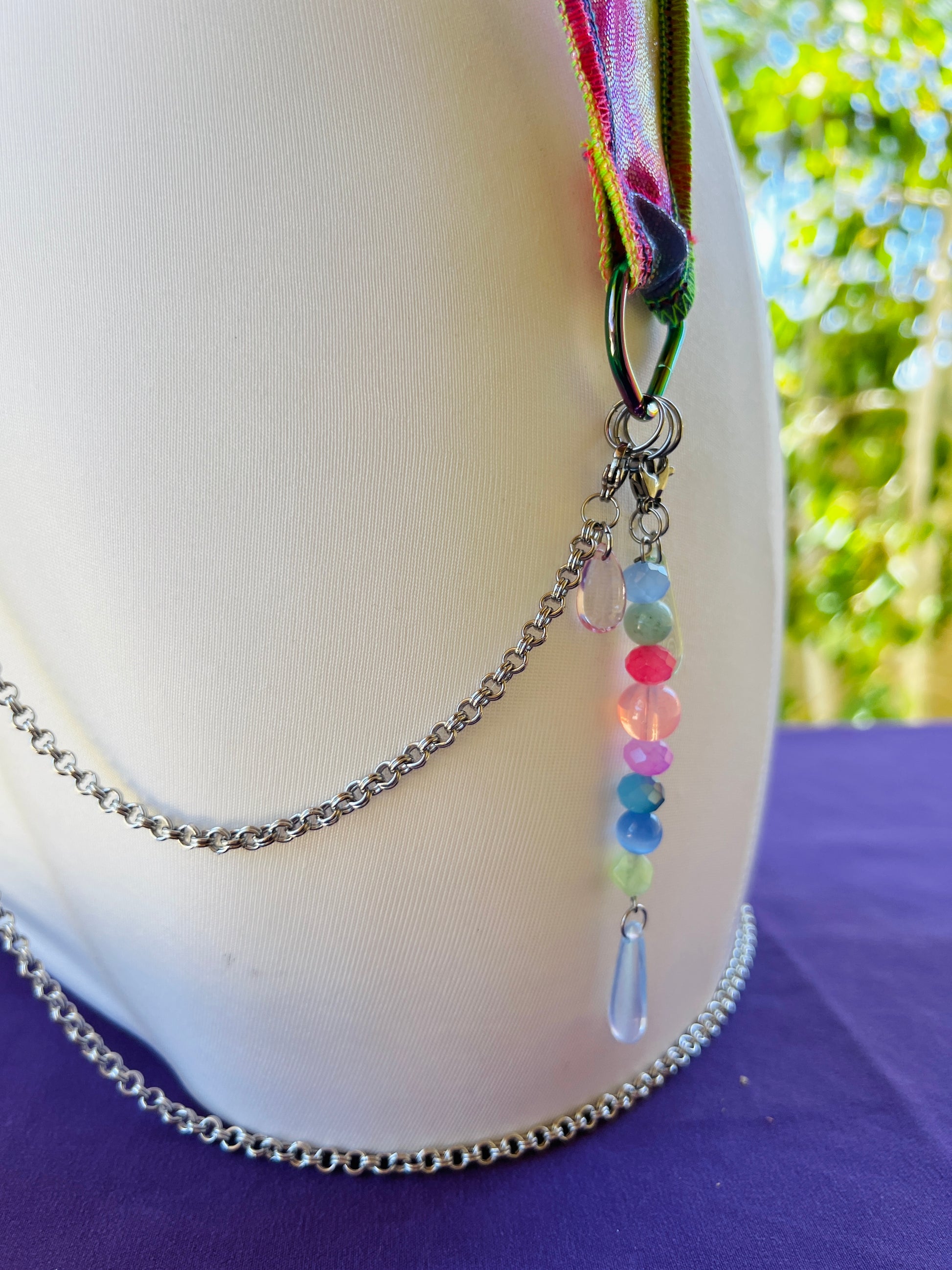 - in collaboration with Mr.WackoLuvsYou - halter top is a medium, best fit 34-37 bust, handwash only - made of quality soft spandex, sensitivity friendly - 100% handmade and one of a kind - beads are glass, stone and ceramic - glass, steel and plated charms - stainless steel chains and hardware - chains, beads & charms can be removed for washing or restyling - dancer friendly