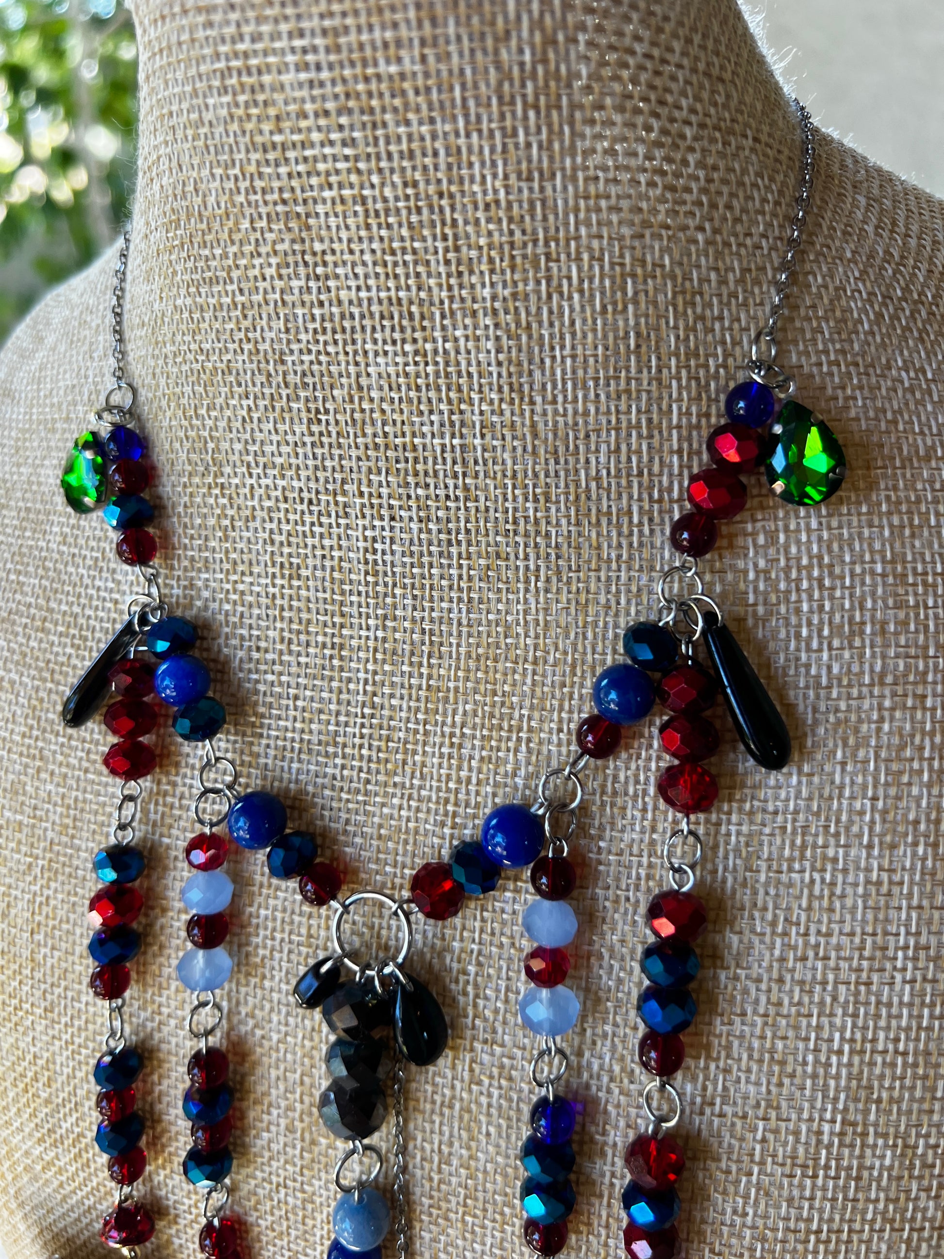 - 18 inches - glass and stone beads - stainless steel chain and hardware - glass and steel charms - aura quartz crystals - reclaimed safety pins