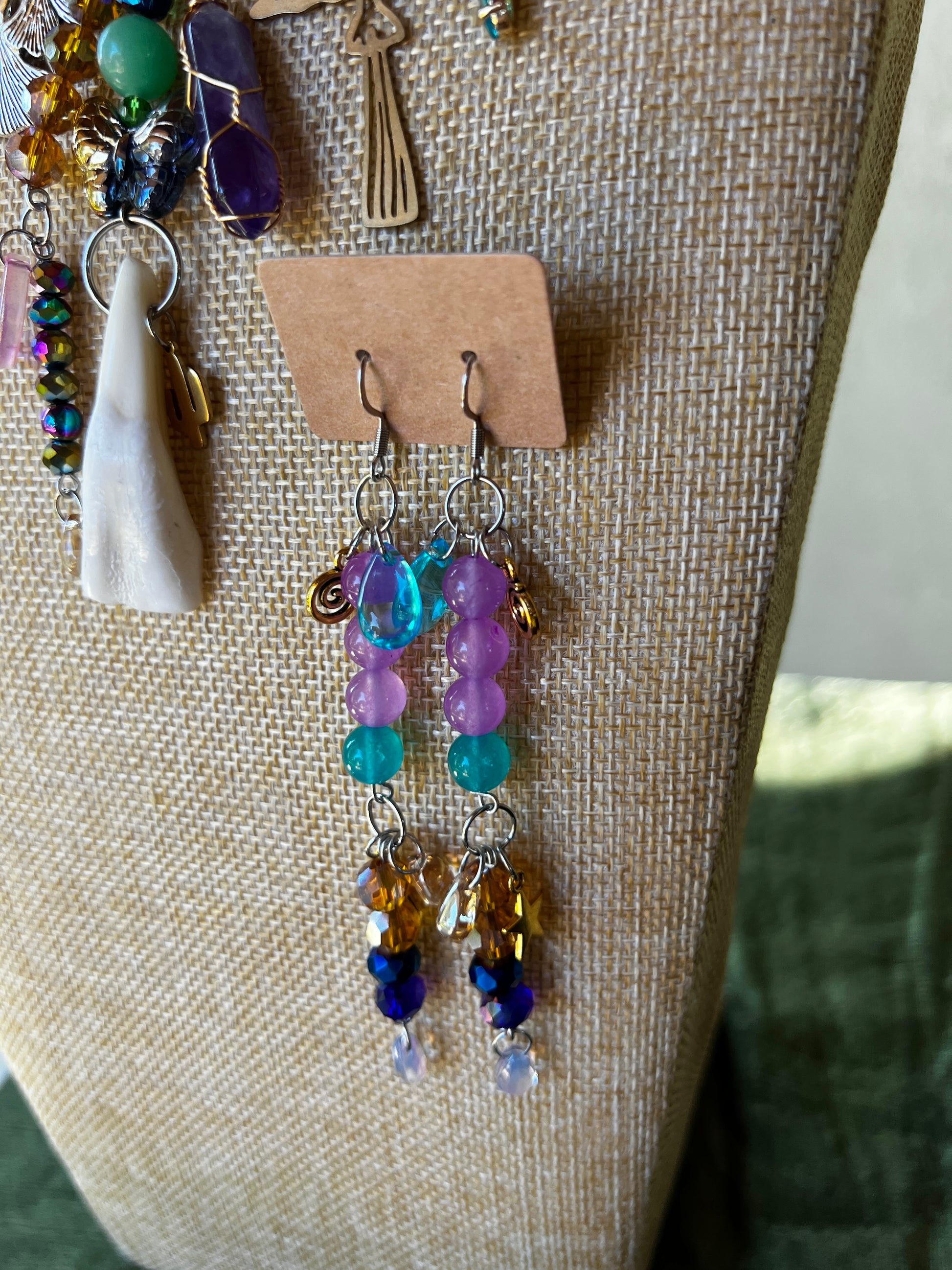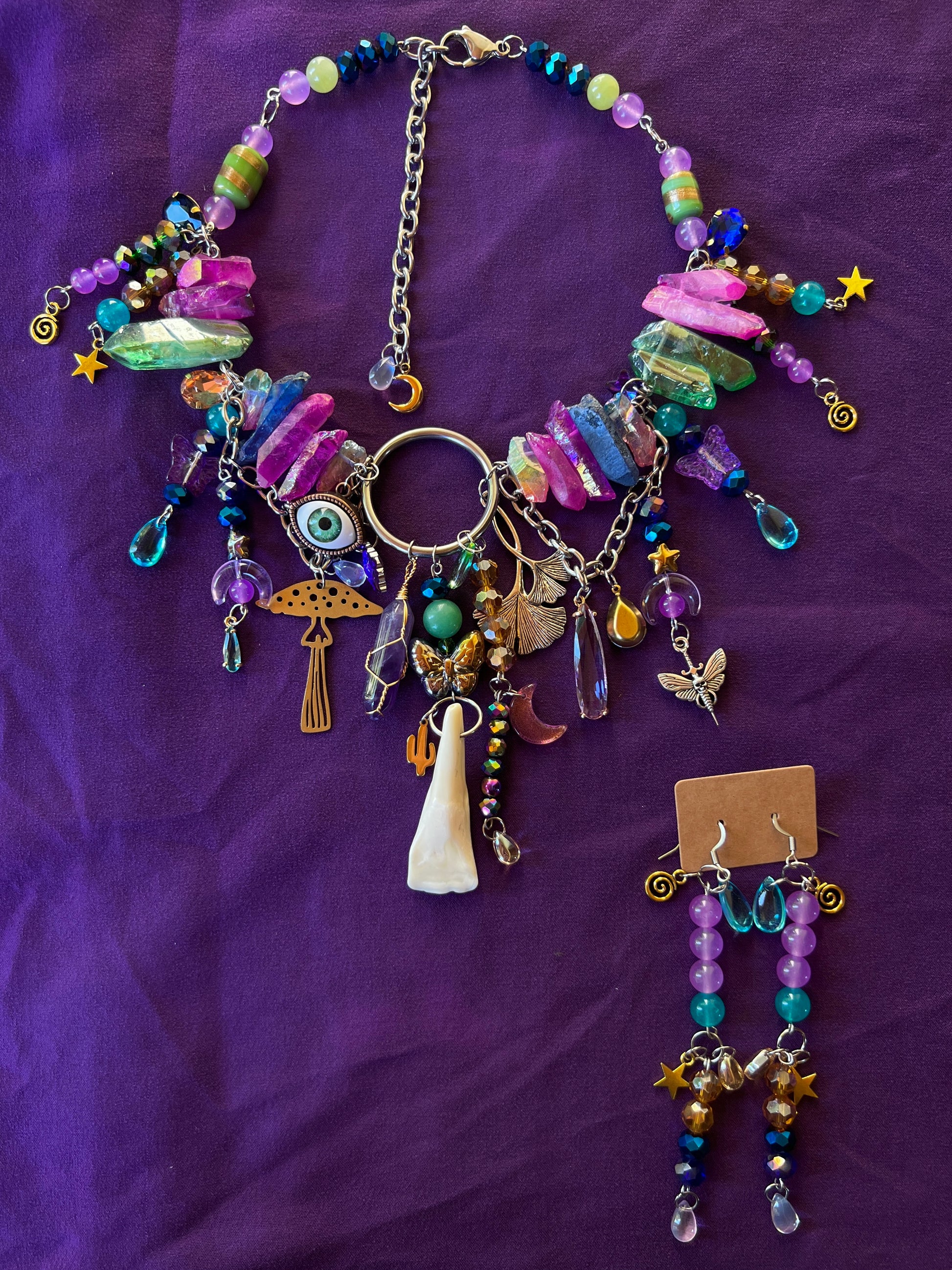 - 16-19 inches - glass and stone beads - stainless steel chain and hardware - adjustable sizing - glass and steel charms - ethically sourced buffalo tooth - aura quartz crystals
