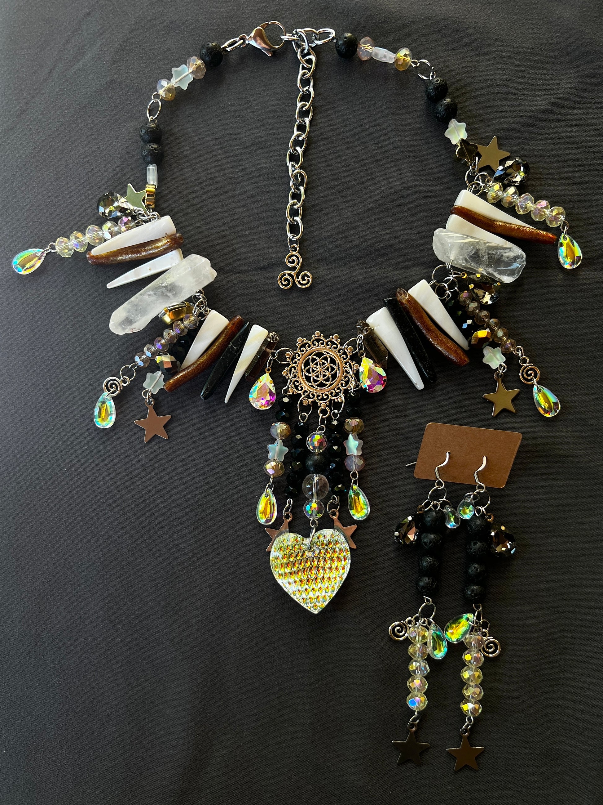 - 16-19 inches - glass and stone beads - stainless steel chain and hardware - adjustable sizing - glass and steel charms - aura quartz crystals