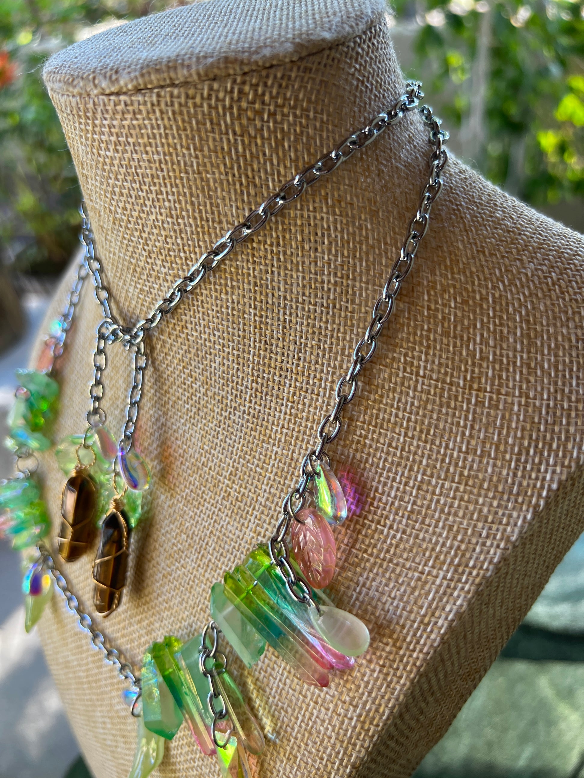 - 25+ inches - glass and stone beads - stainless steel chain and hardware - one size fits all - sturdy across the nose and behind the ears - comfortable - glass charms - aura quartz crystals