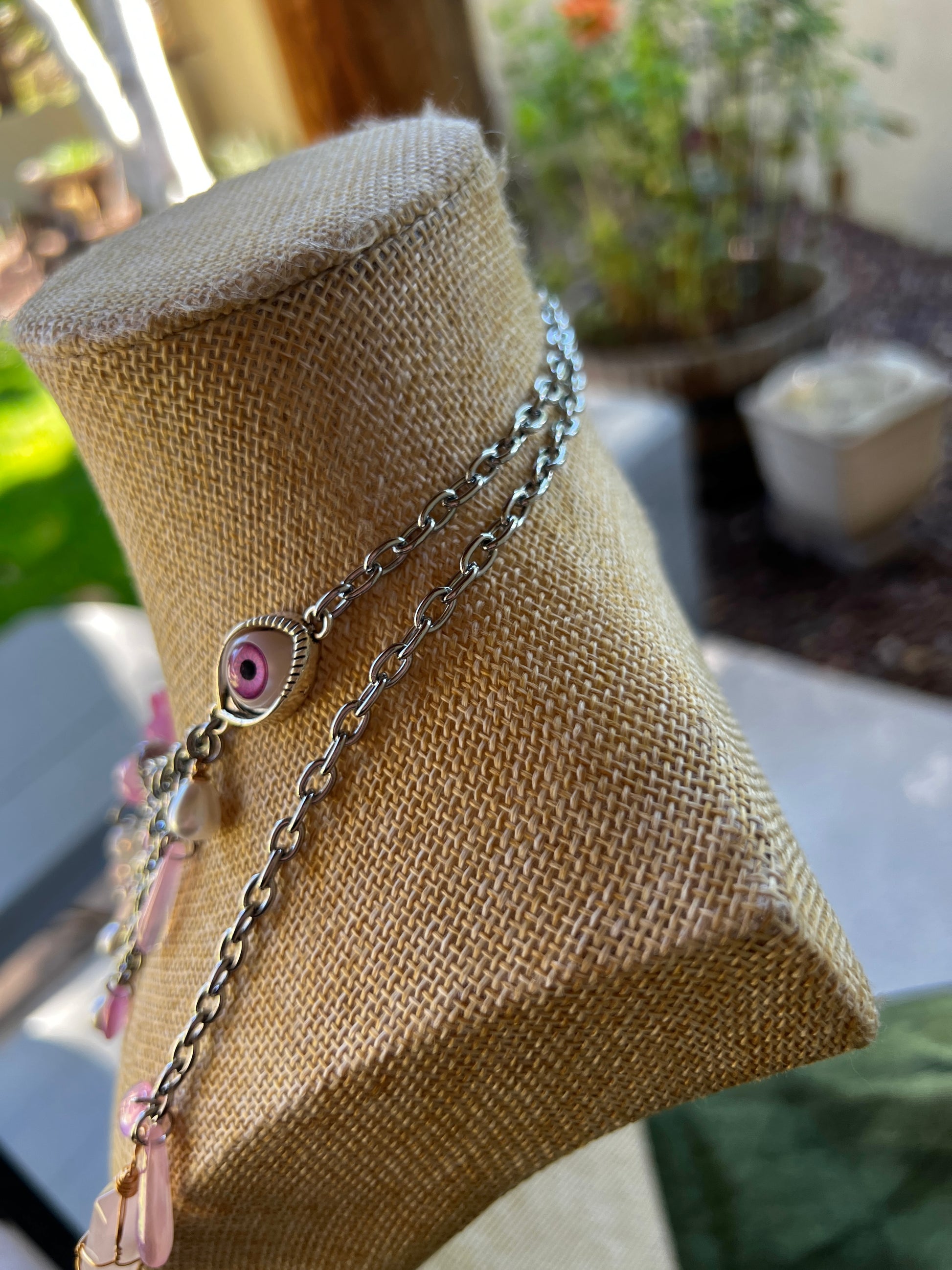 - 25+ inches - glass and stone beads - stainless steel chain and hardware - one size fits all - sturdy across the nose and behind the ears - glass charms - aura quartz crystal - center of this piece sits on top of the nose