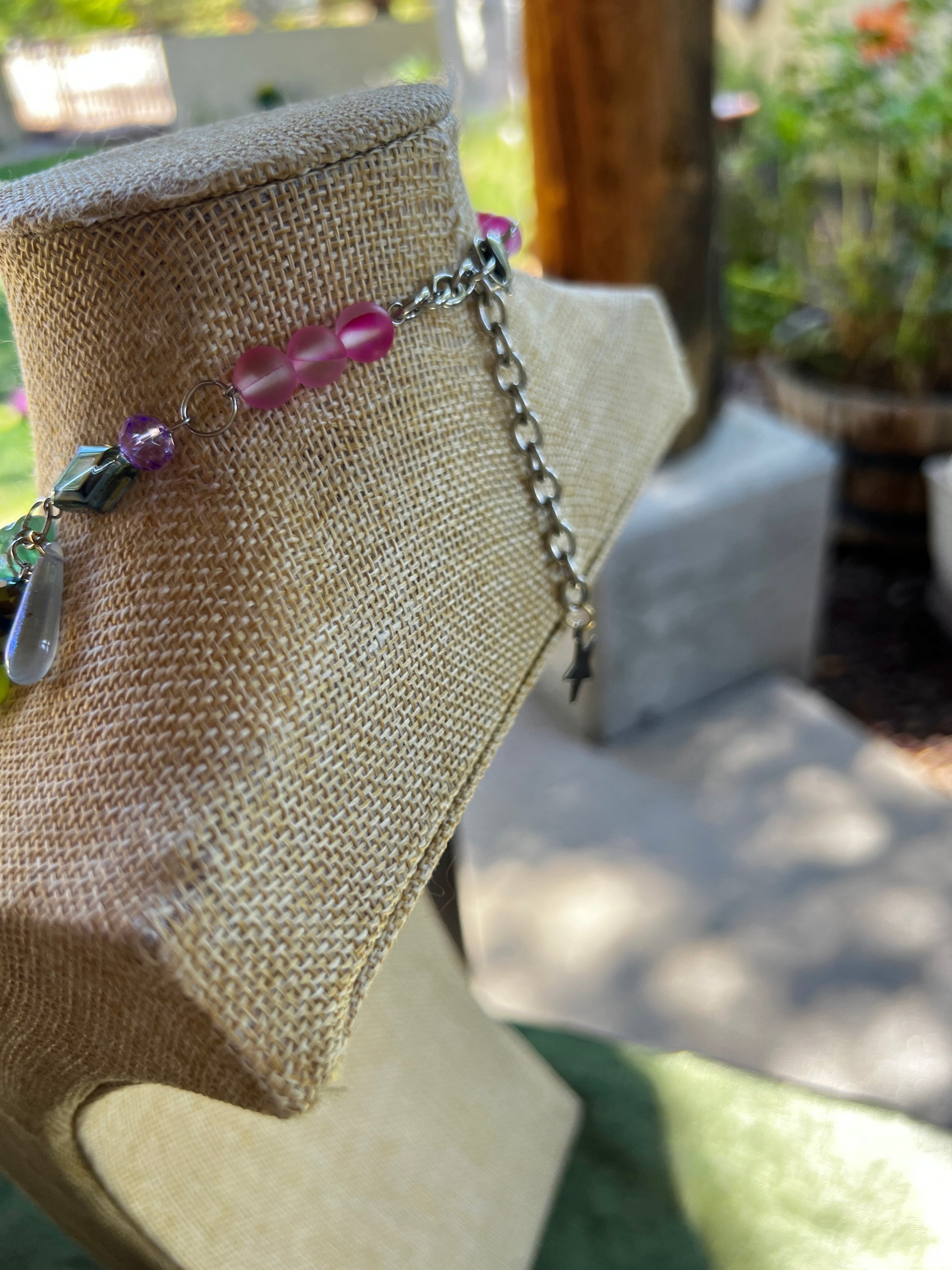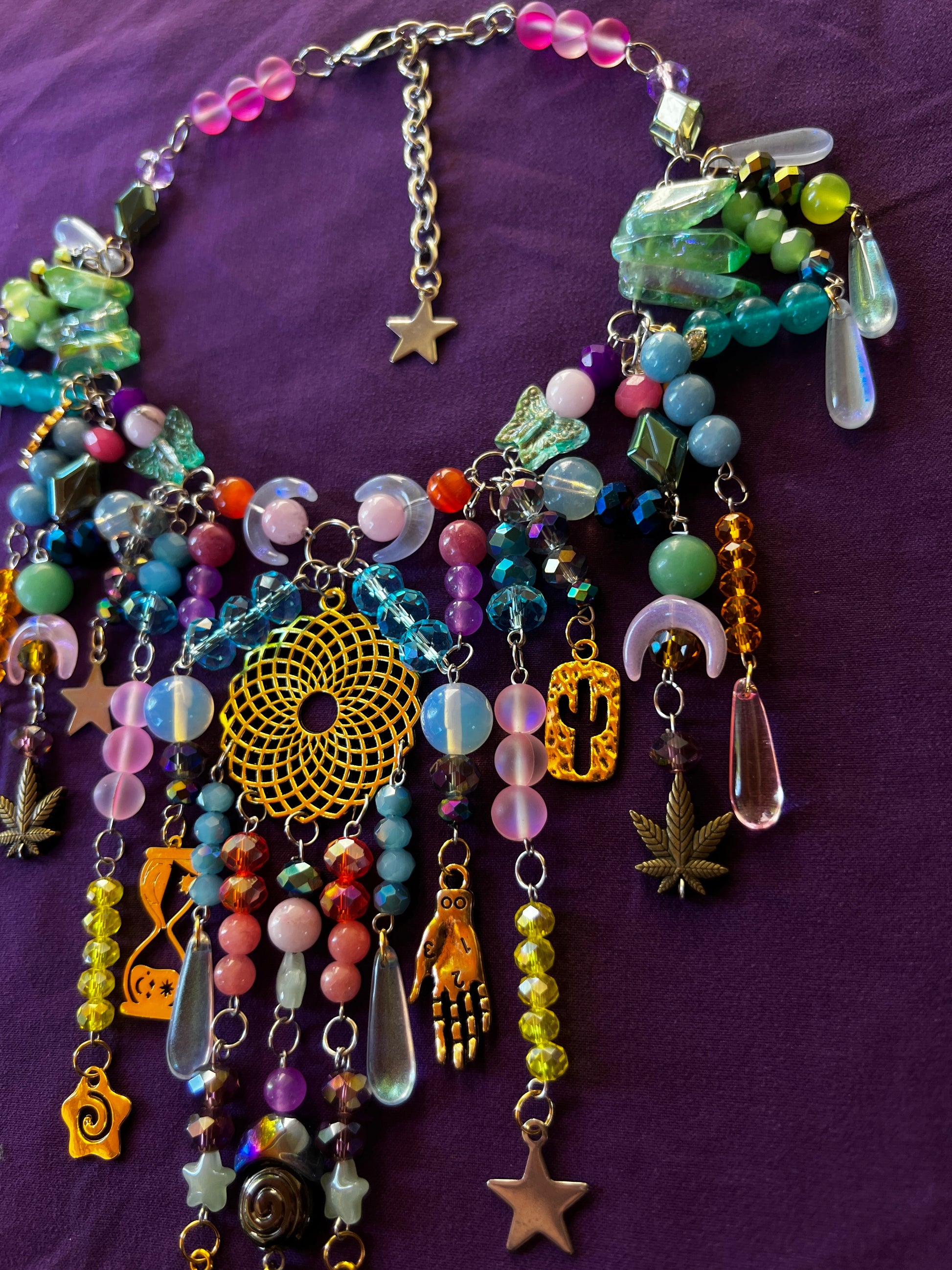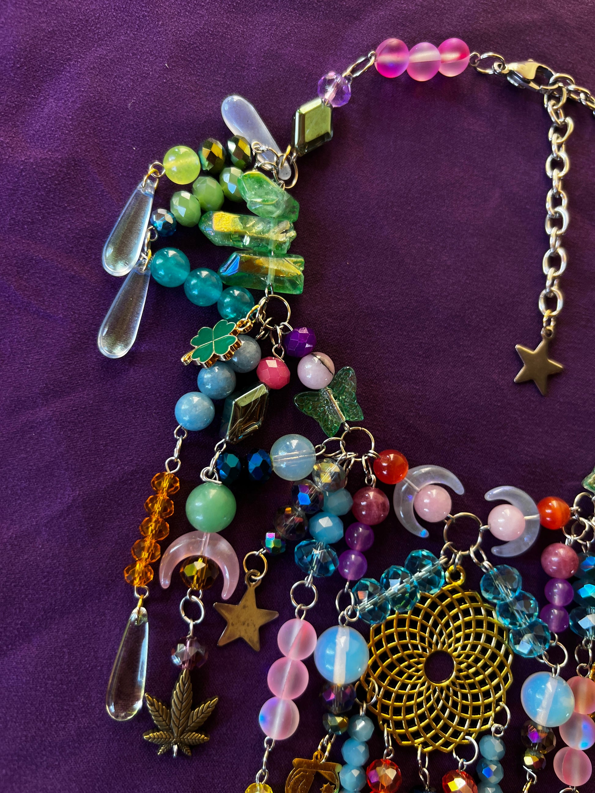 - 16-19 inches - glass and stone beads - stainless steel chain and hardware - adjustable sizing - glass and steel charms - aura quartz crystals