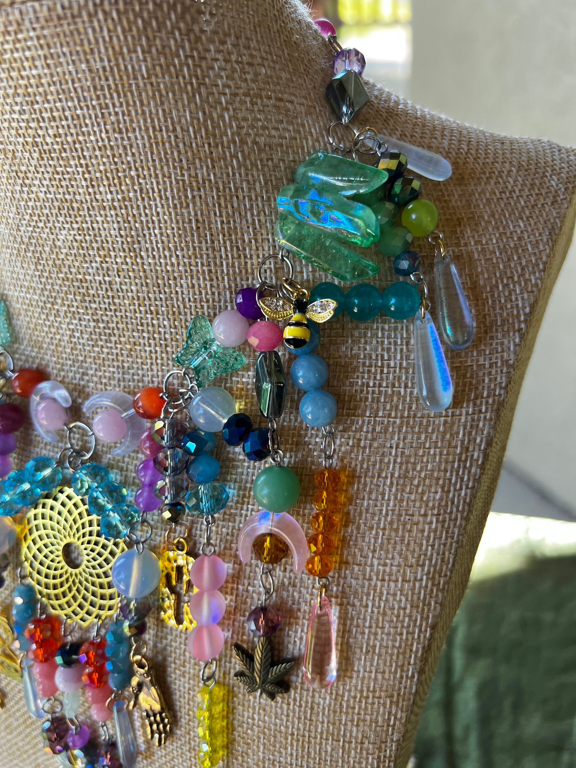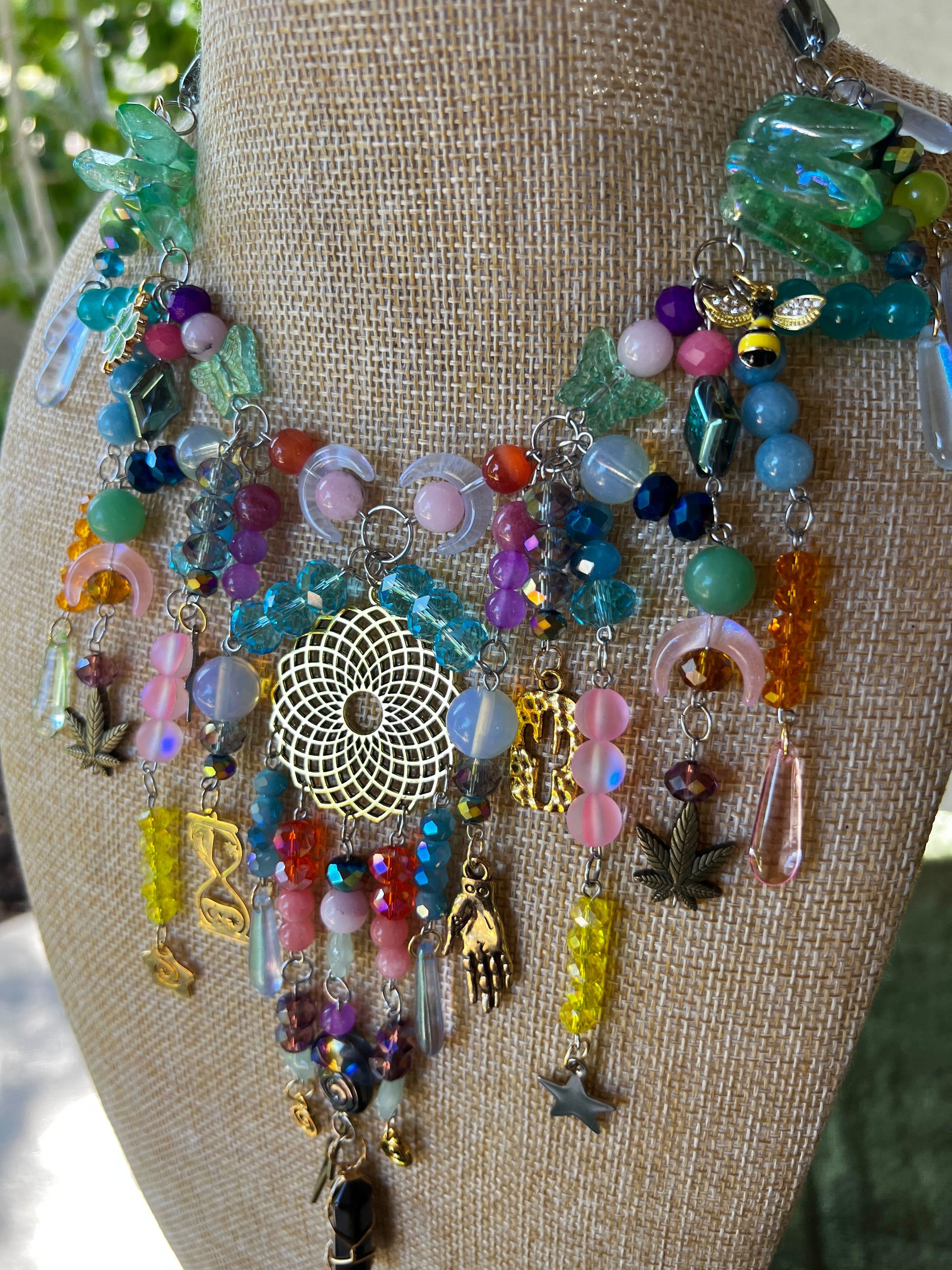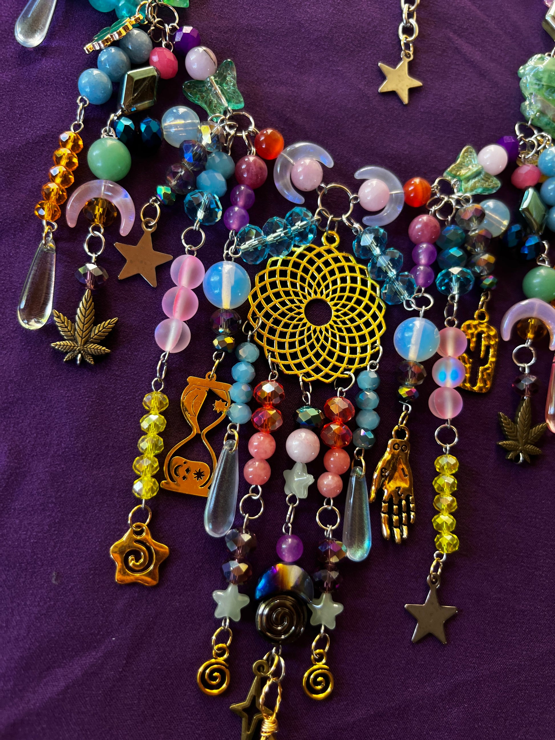 - 16-19 inches - glass and stone beads - stainless steel chain and hardware - adjustable sizing - glass and steel charms - aura quartz crystals