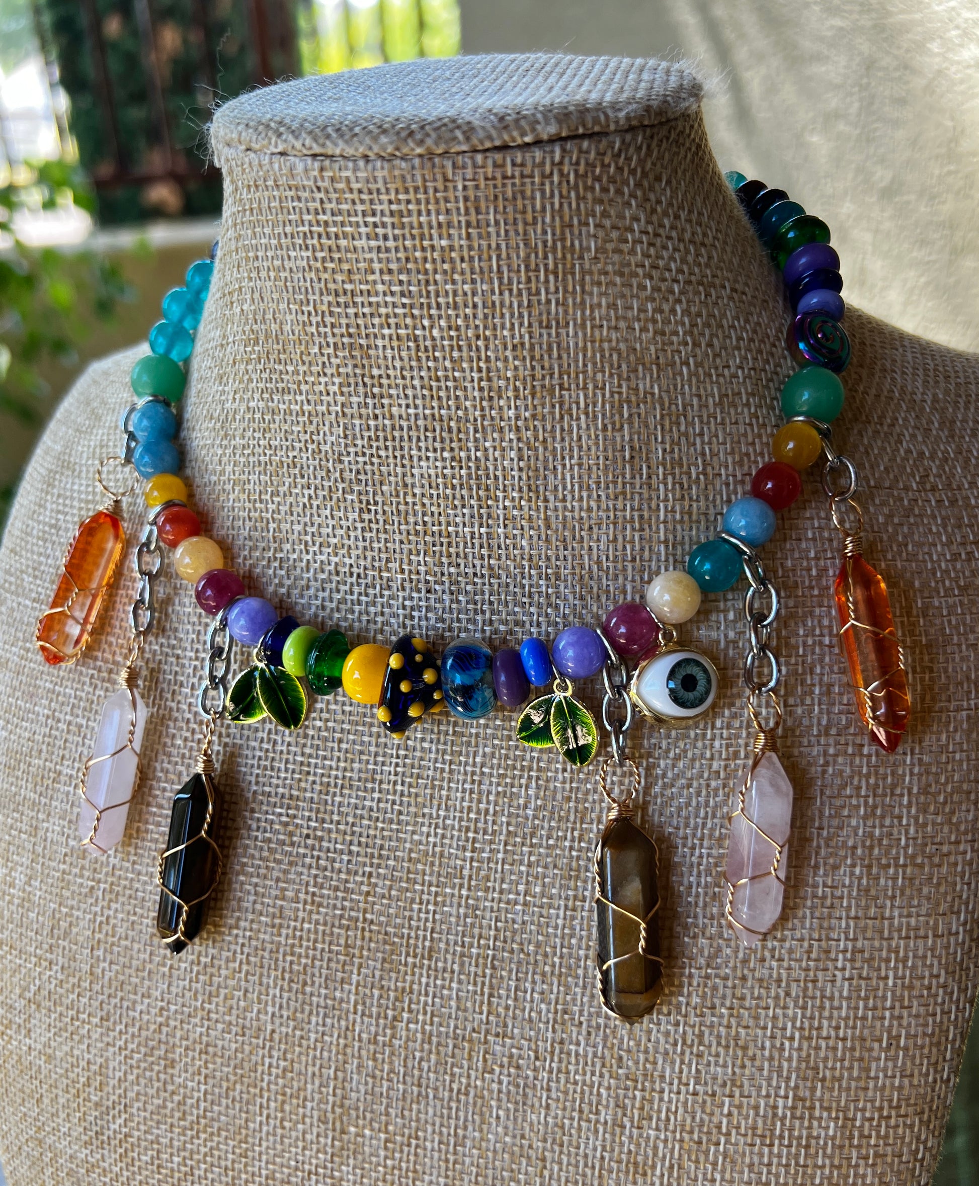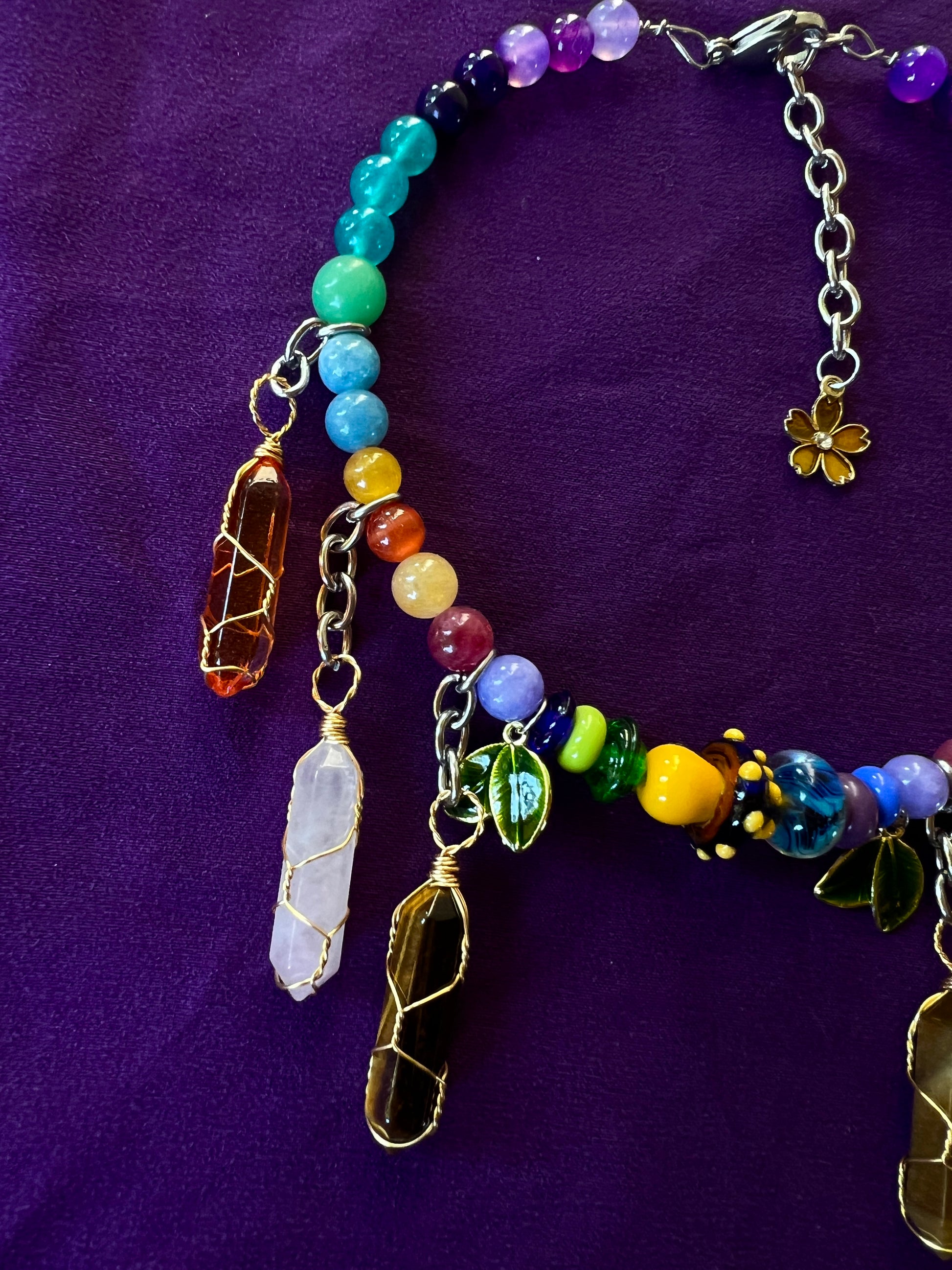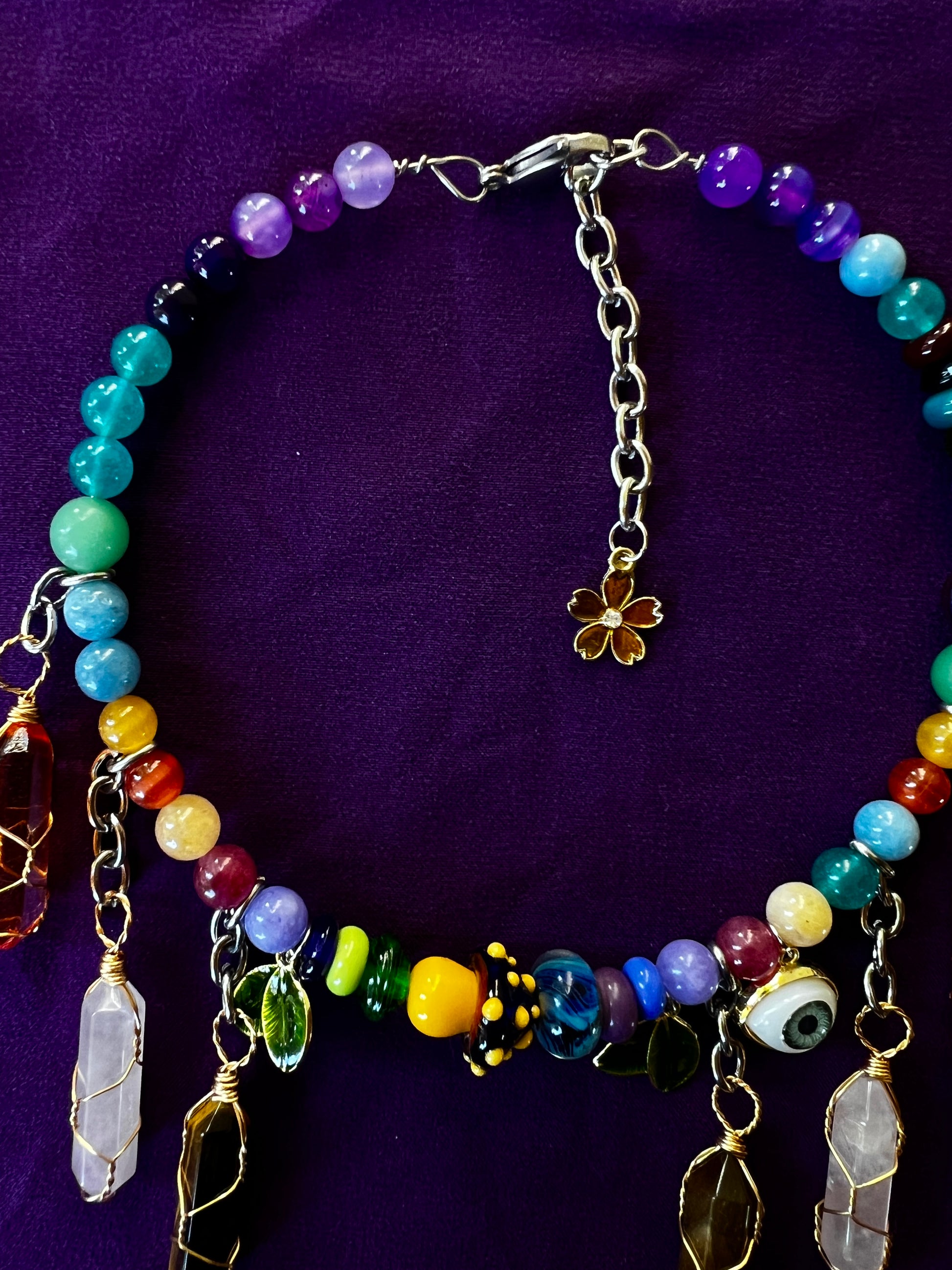 - 15-17 inches - glass and stone beads - stainless steel chain and hardware - adjustable sizing - glass and steel charms
