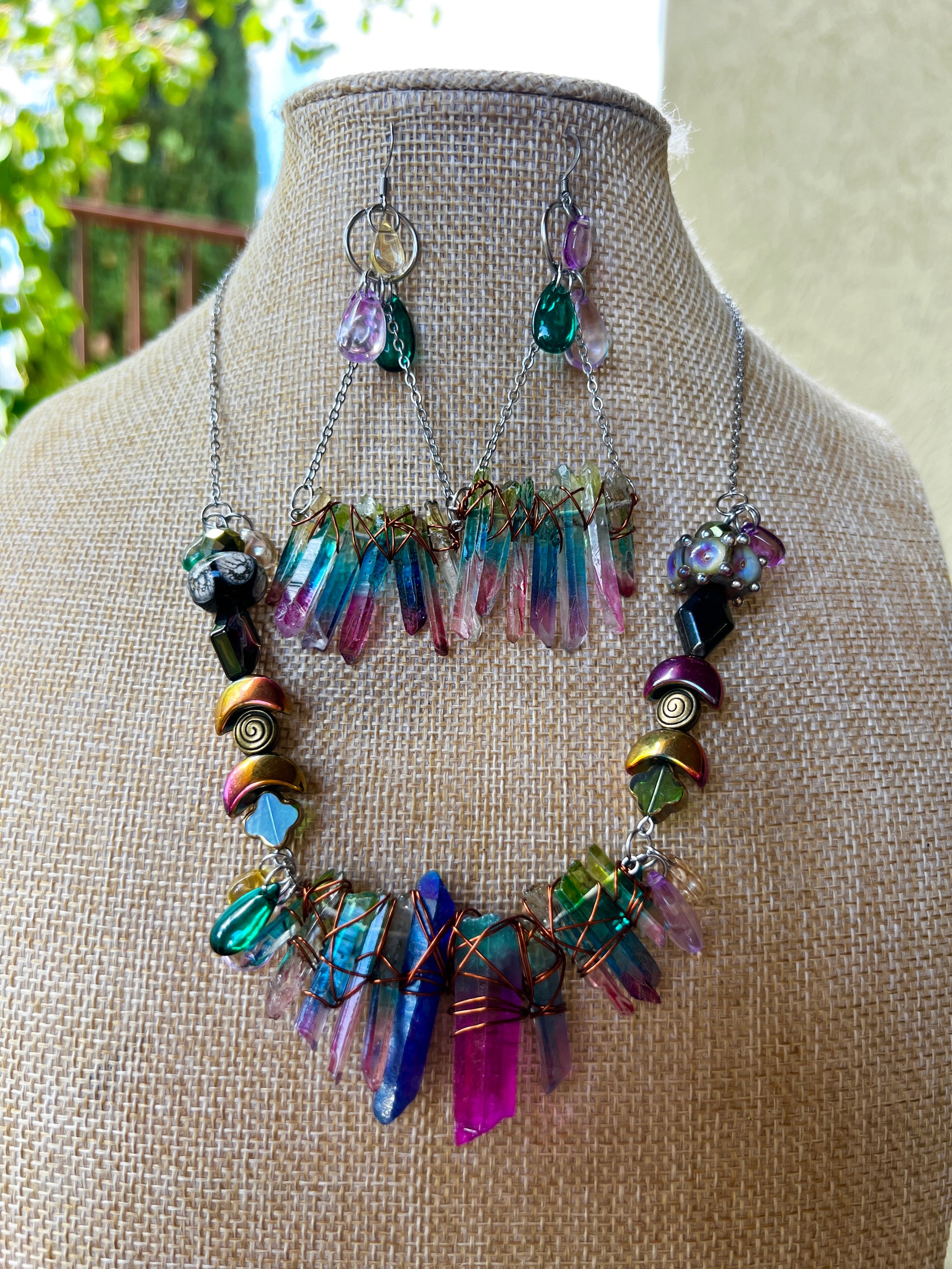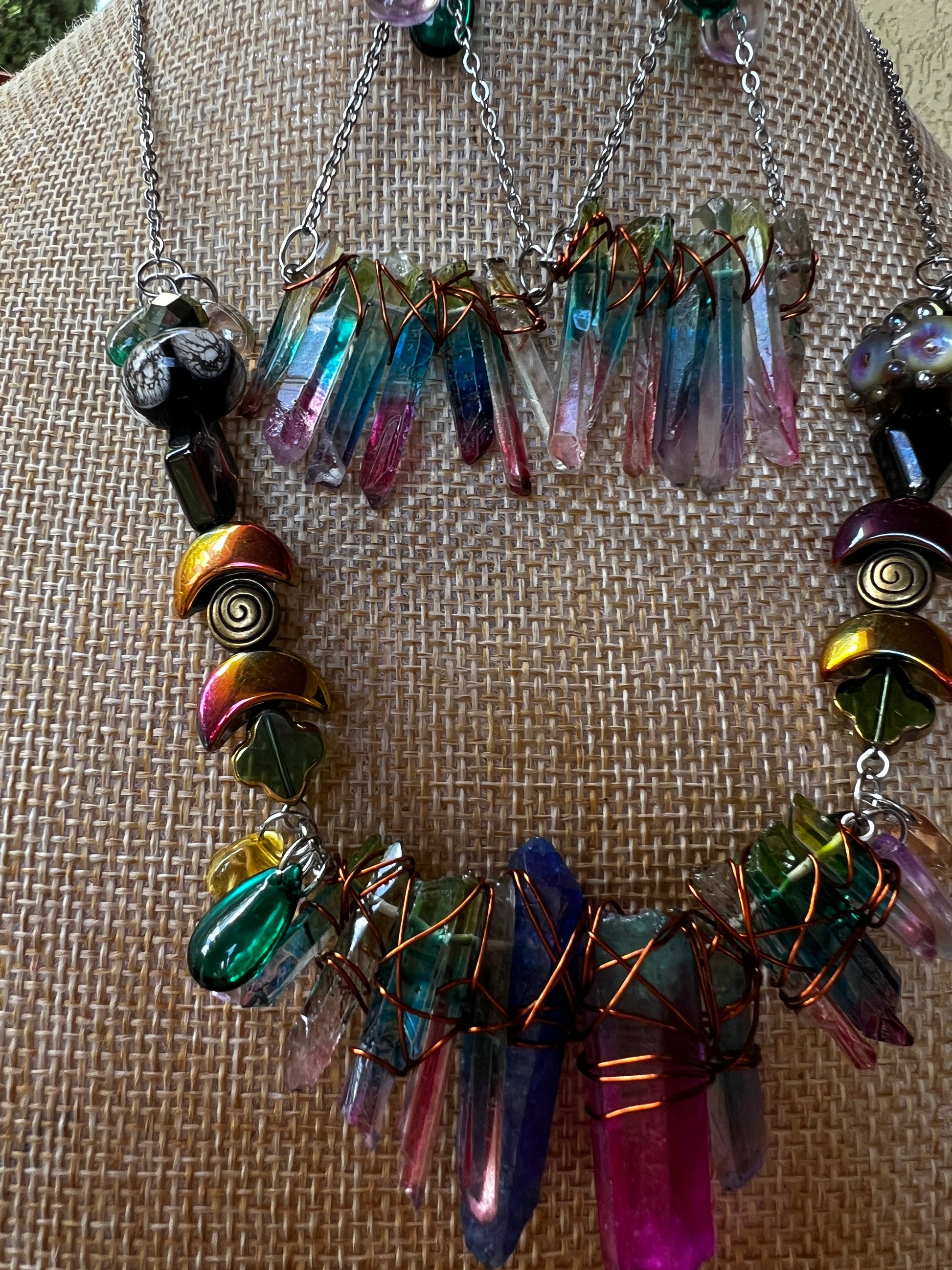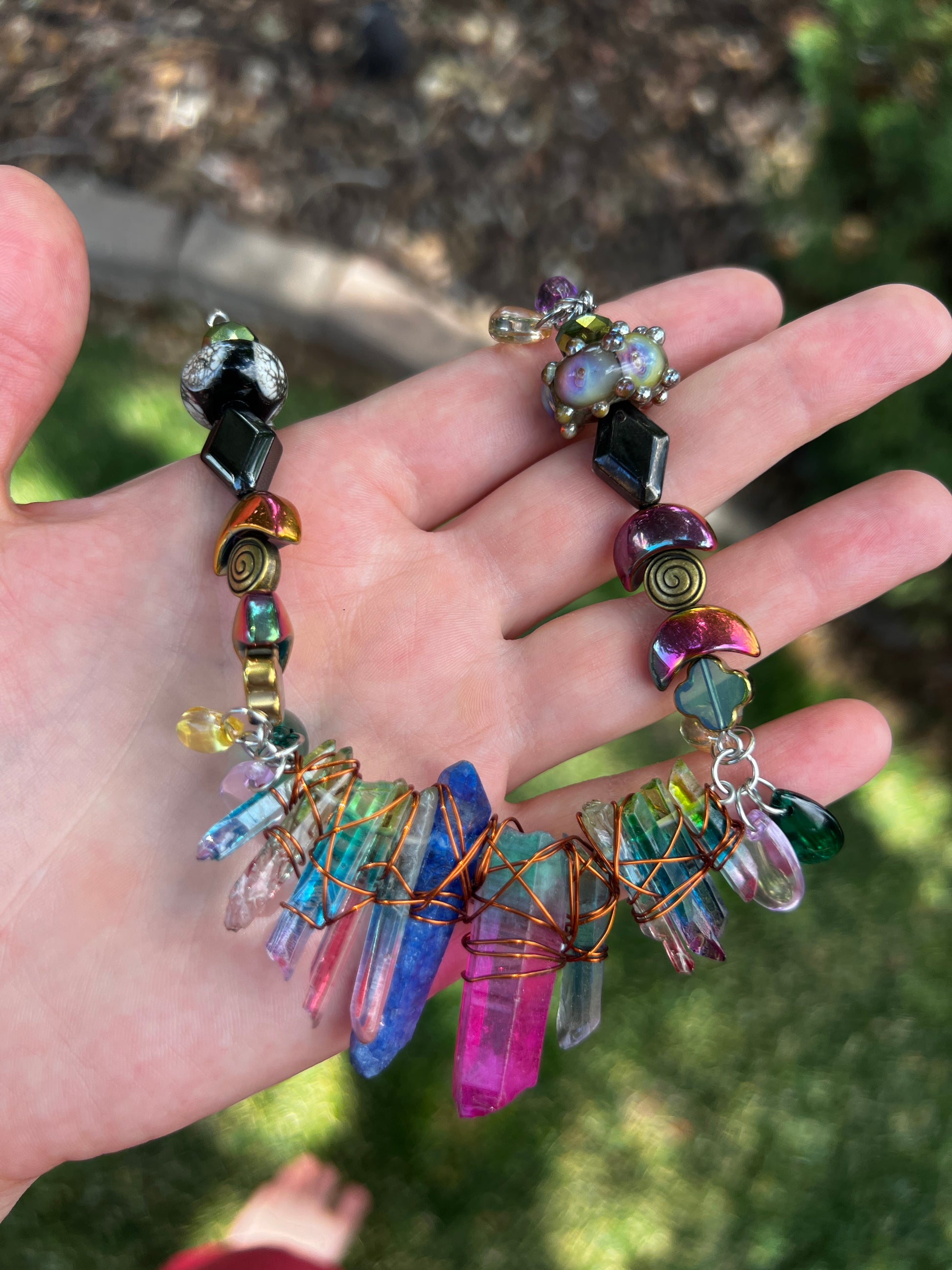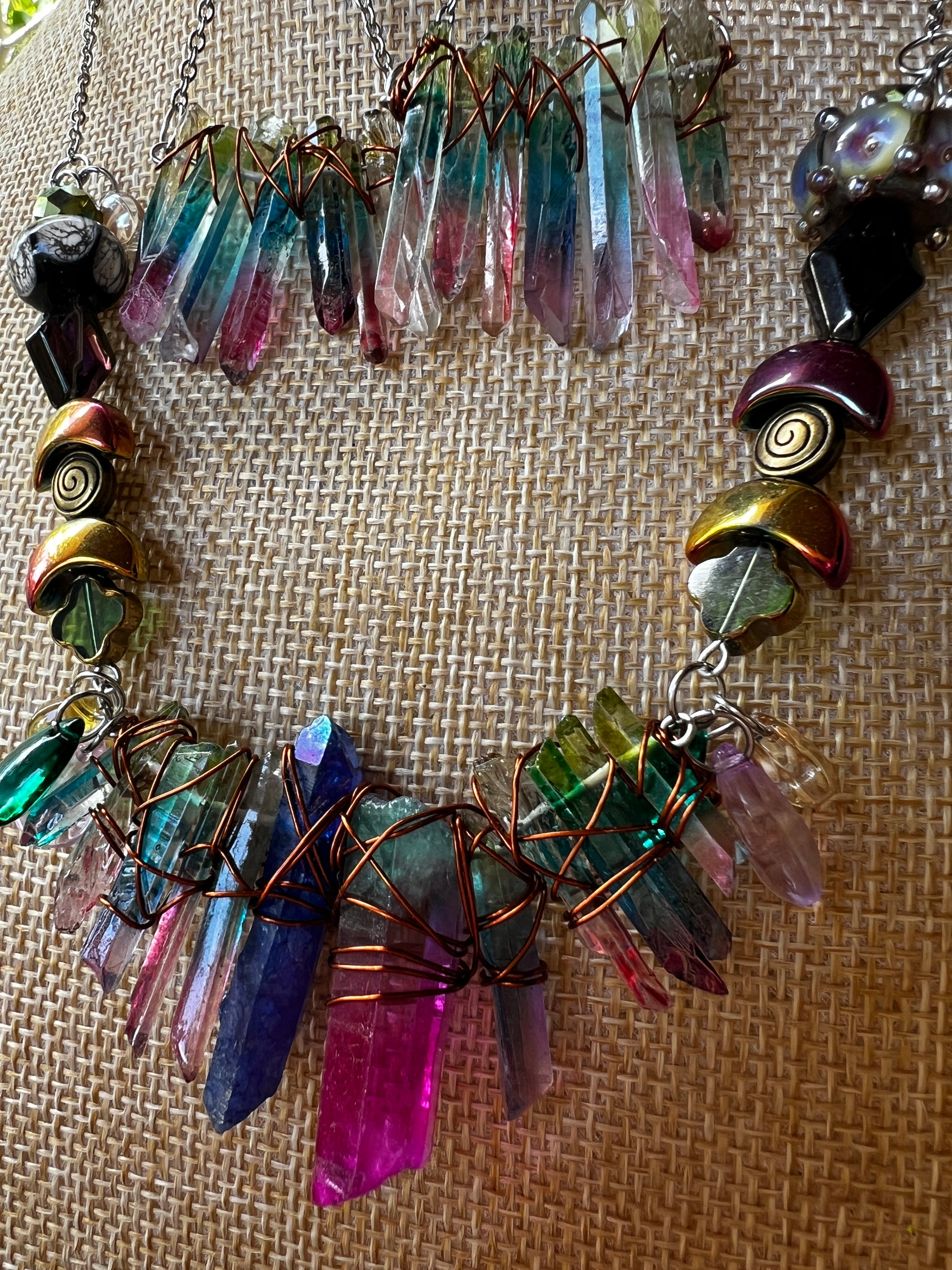 - 18 inches - stainless steel chain and hardware - glass beads - mix of new, handmade and reclaimed charms and beads - hand wrapped aura quartz crystals