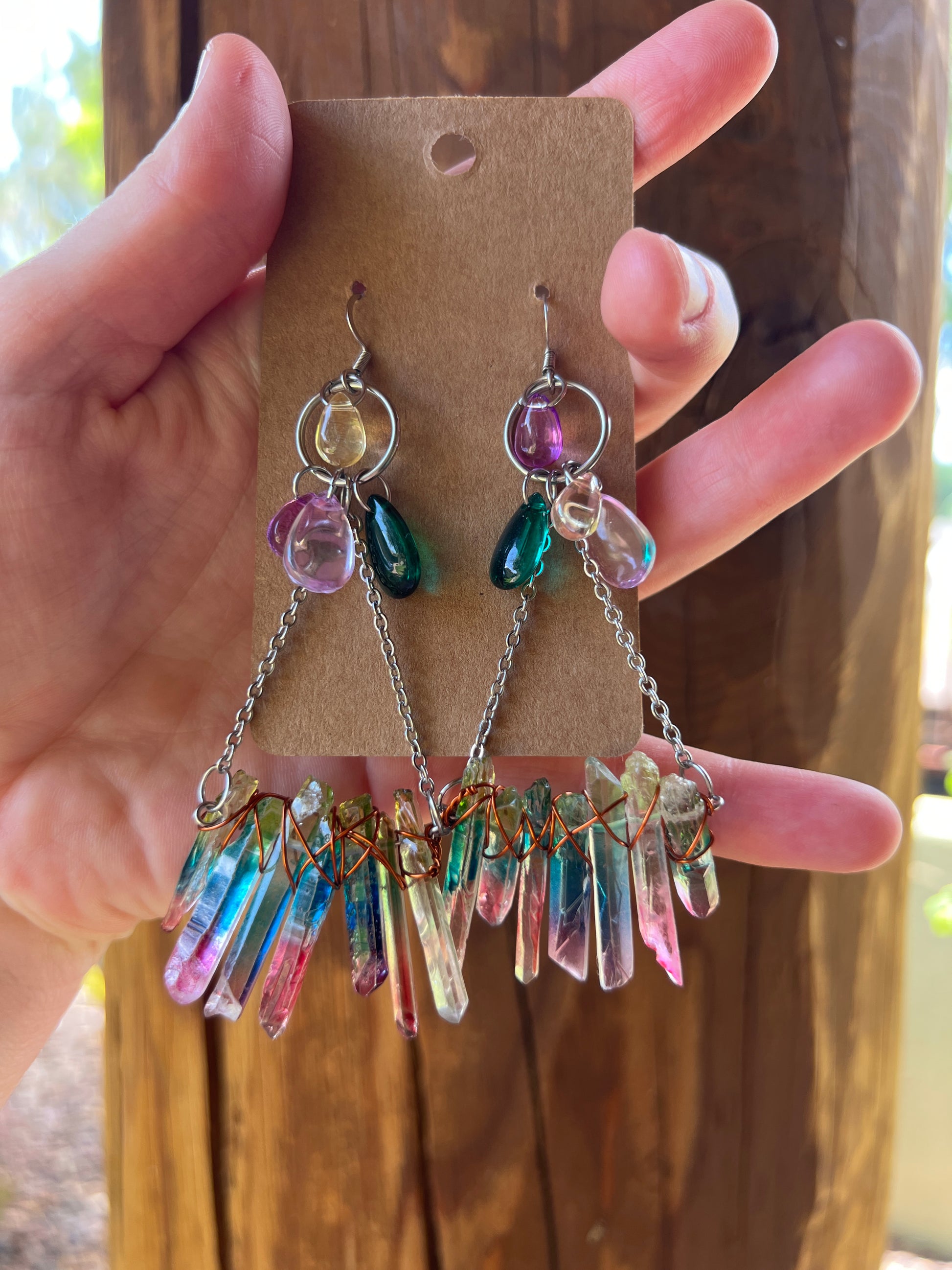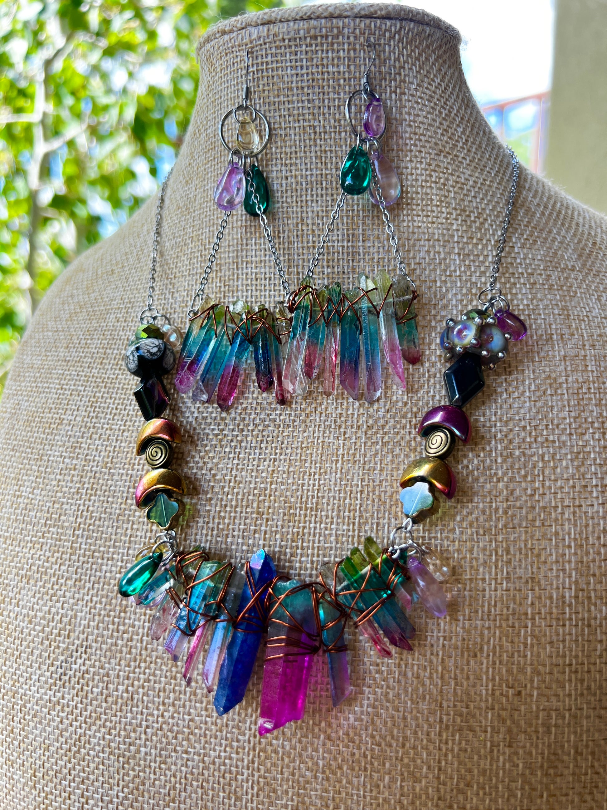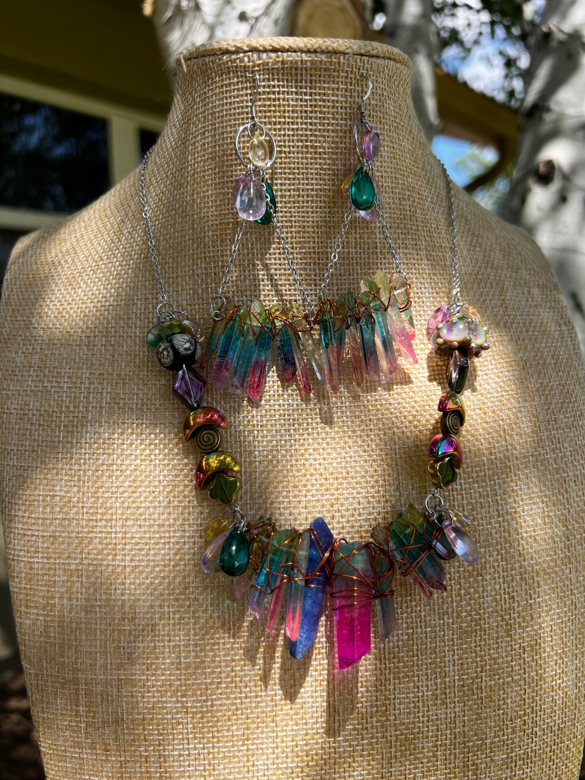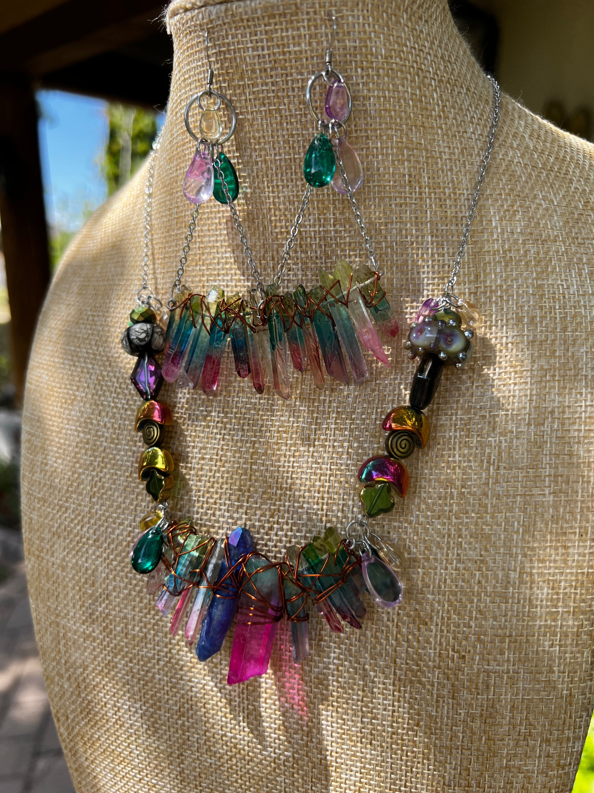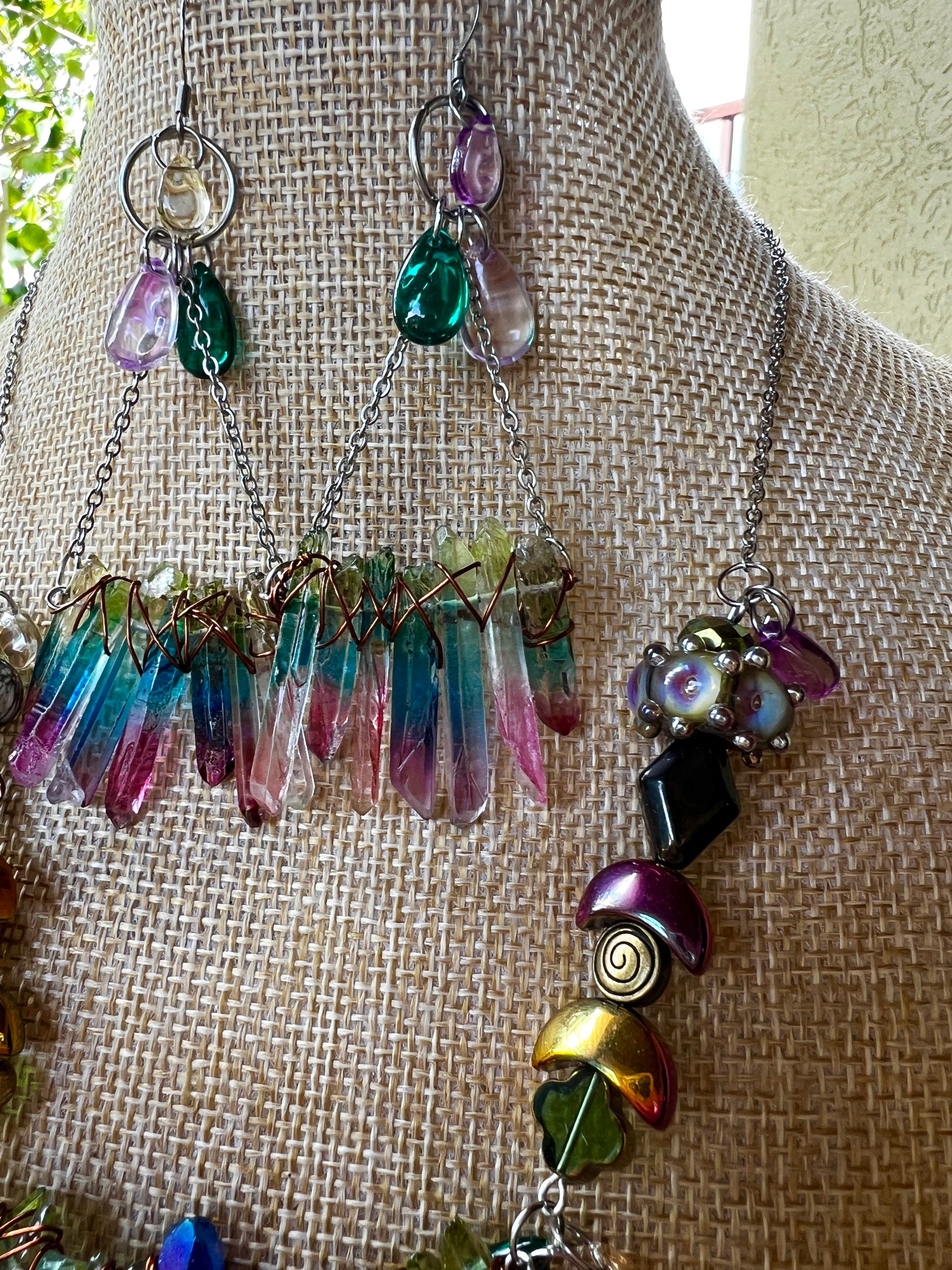 - 18 inches - stainless steel chain and hardware - glass beads - mix of new, handmade and reclaimed charms and beads - hand wrapped aura quartz crystals