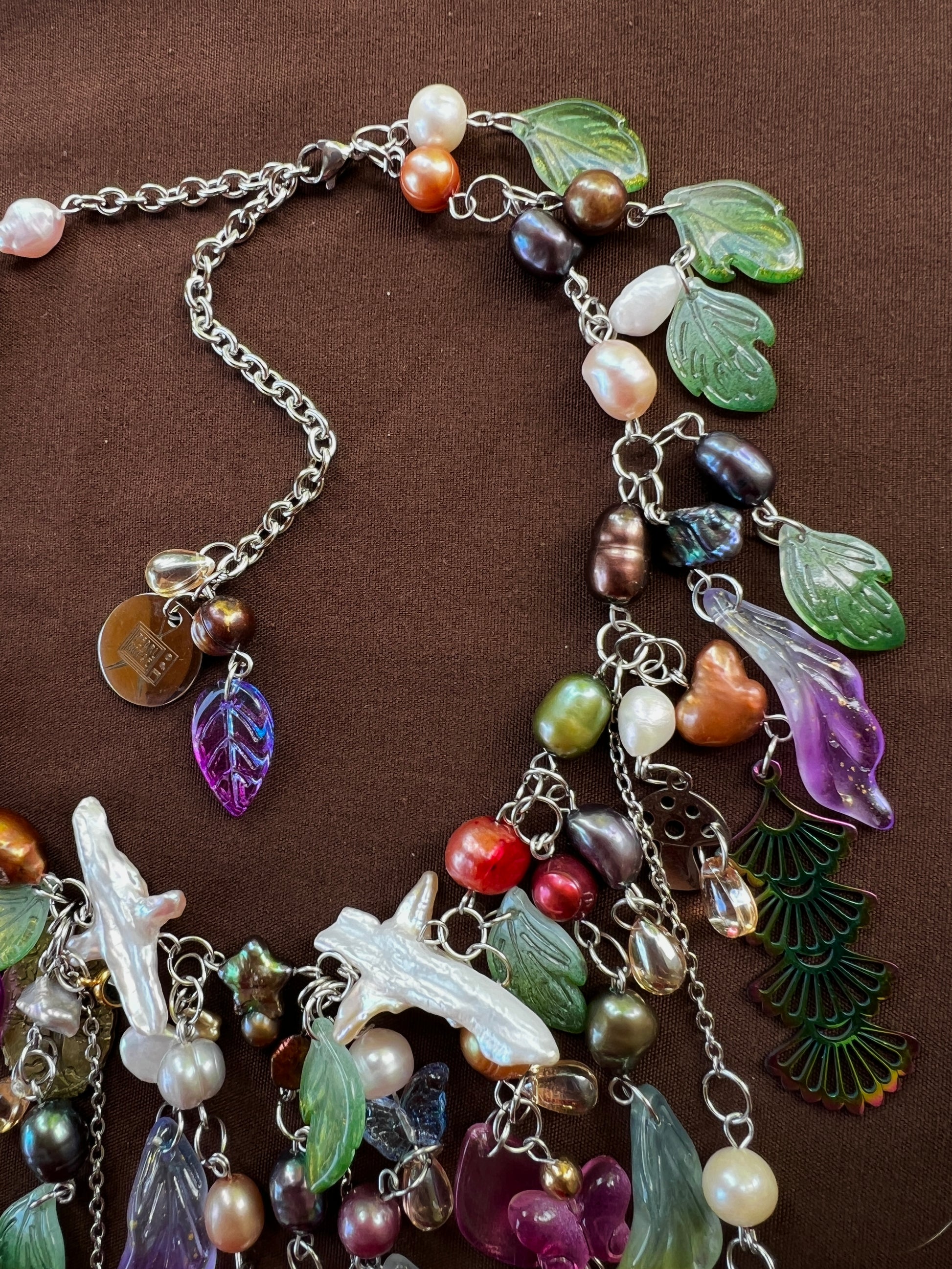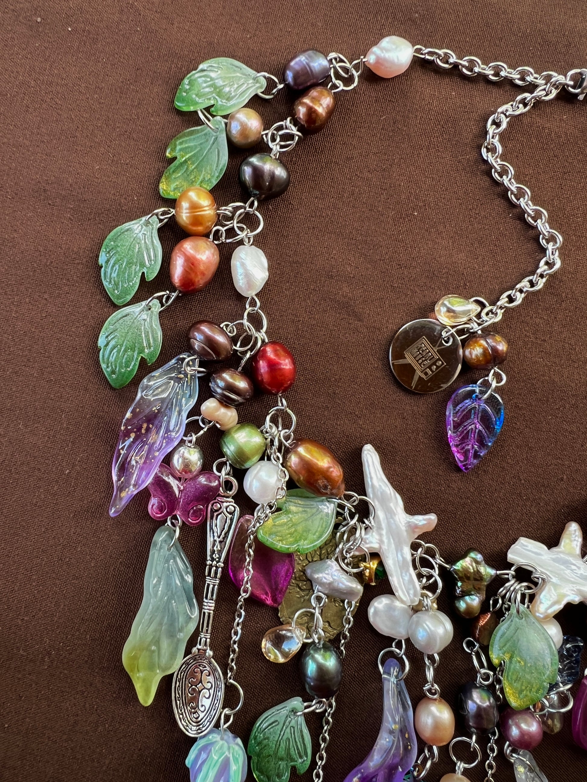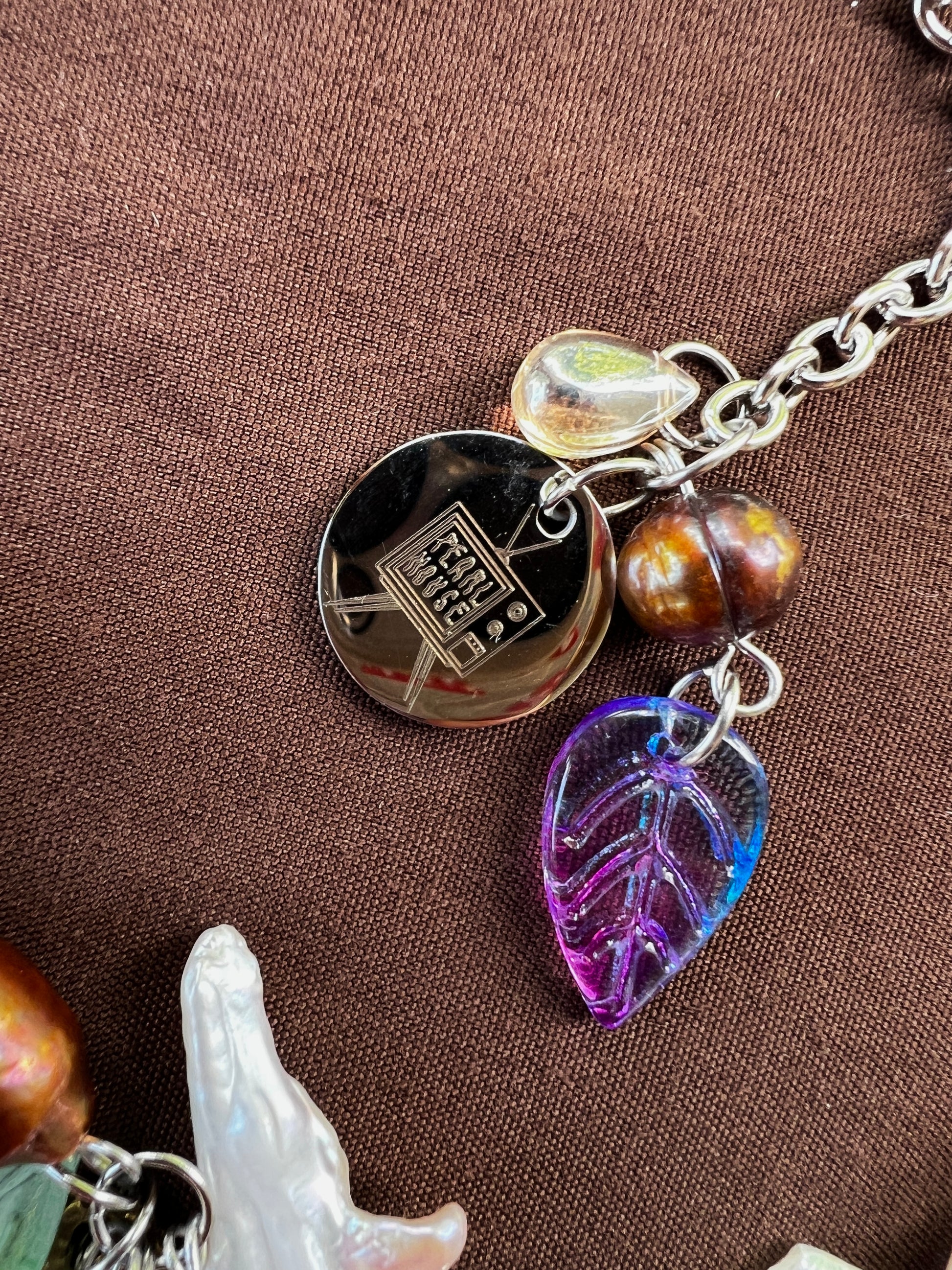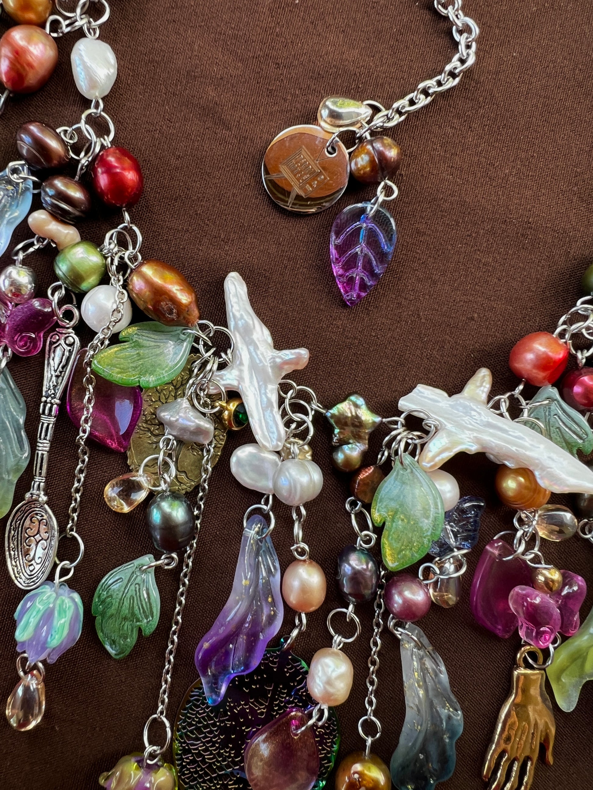 - 15-18 inches - stainless steel chain and hardware - glass and stone beads - mix of new, handmade and reclaimed charms and beads - reclaimed freshwater pearls