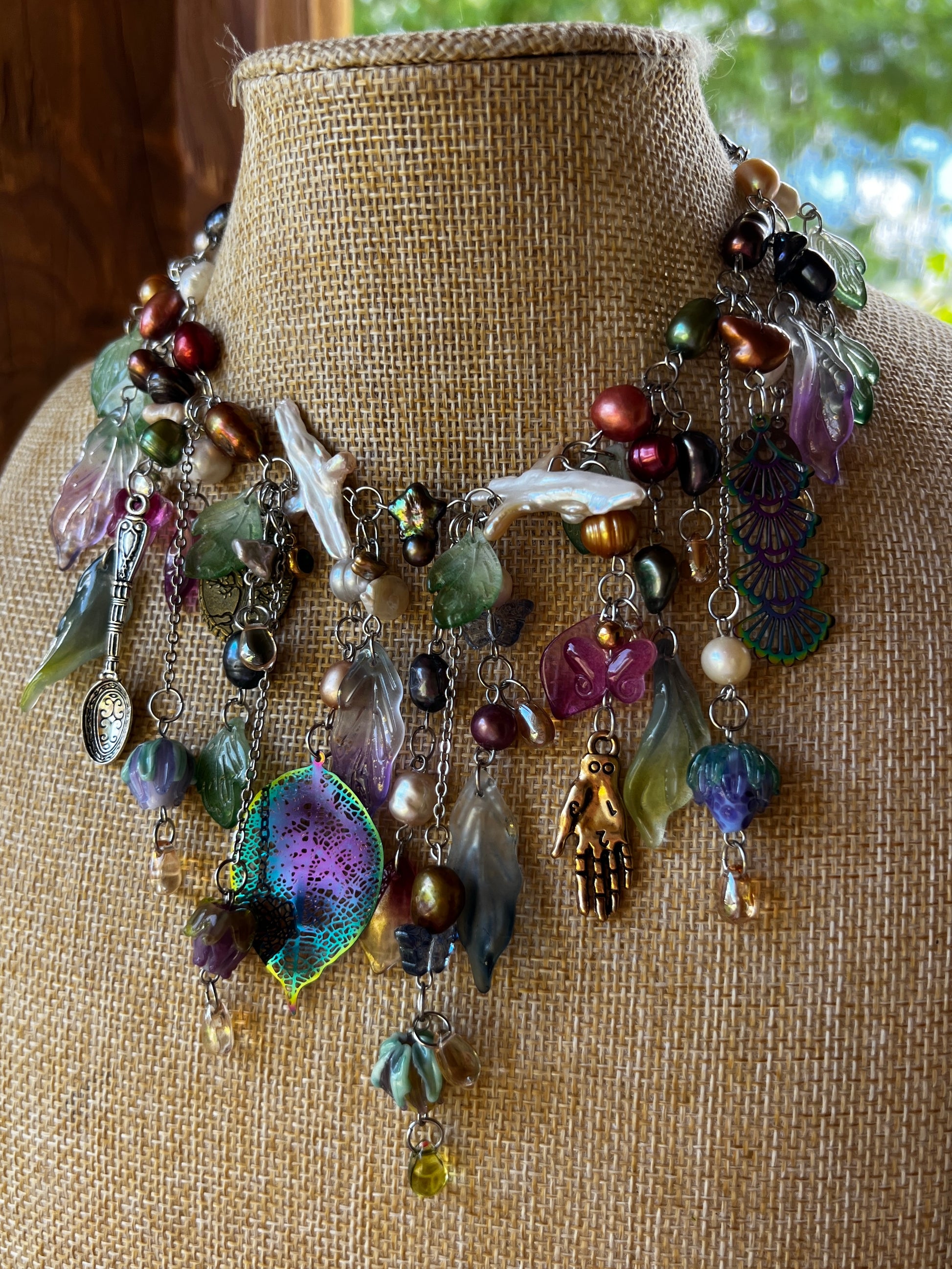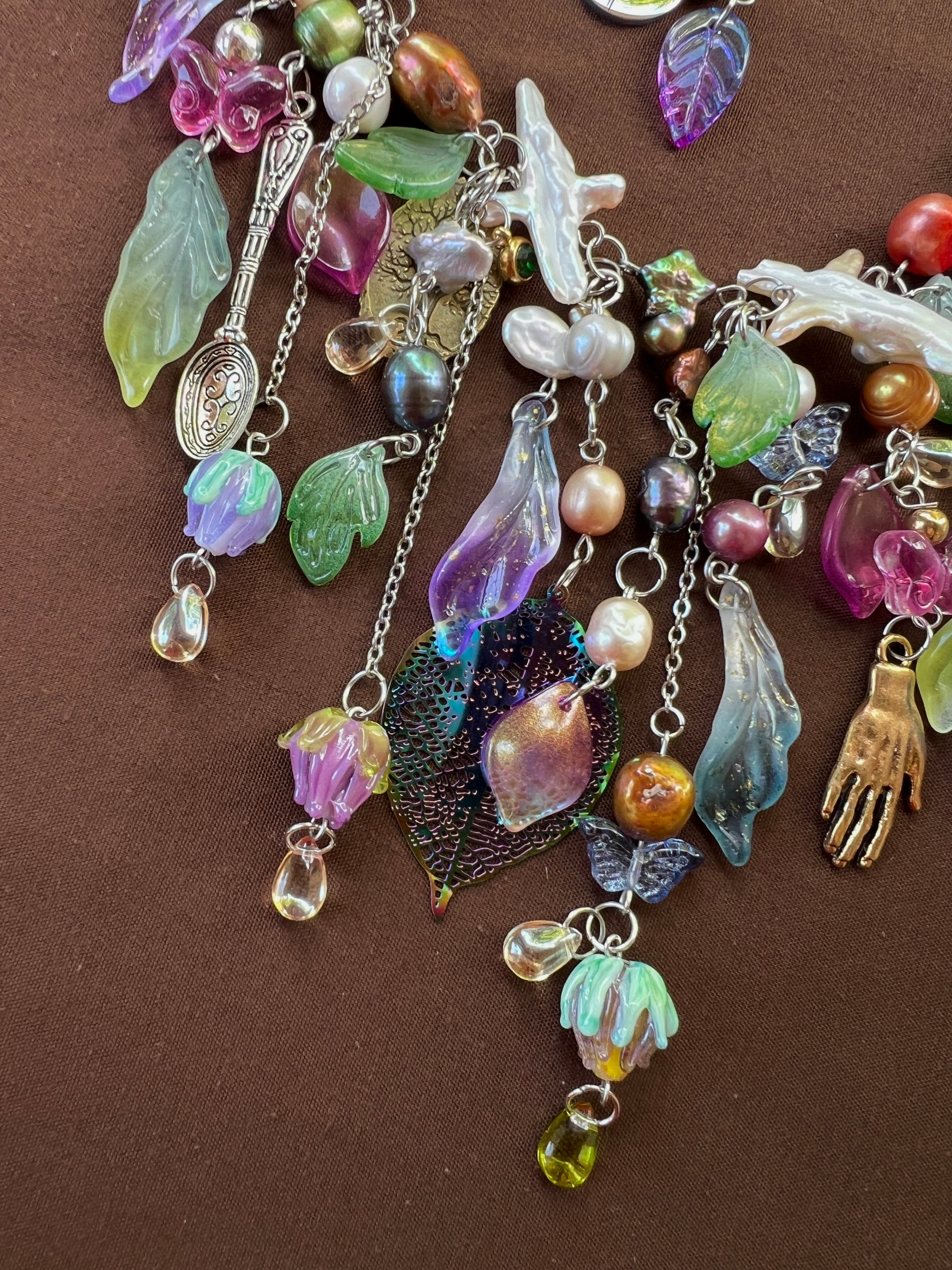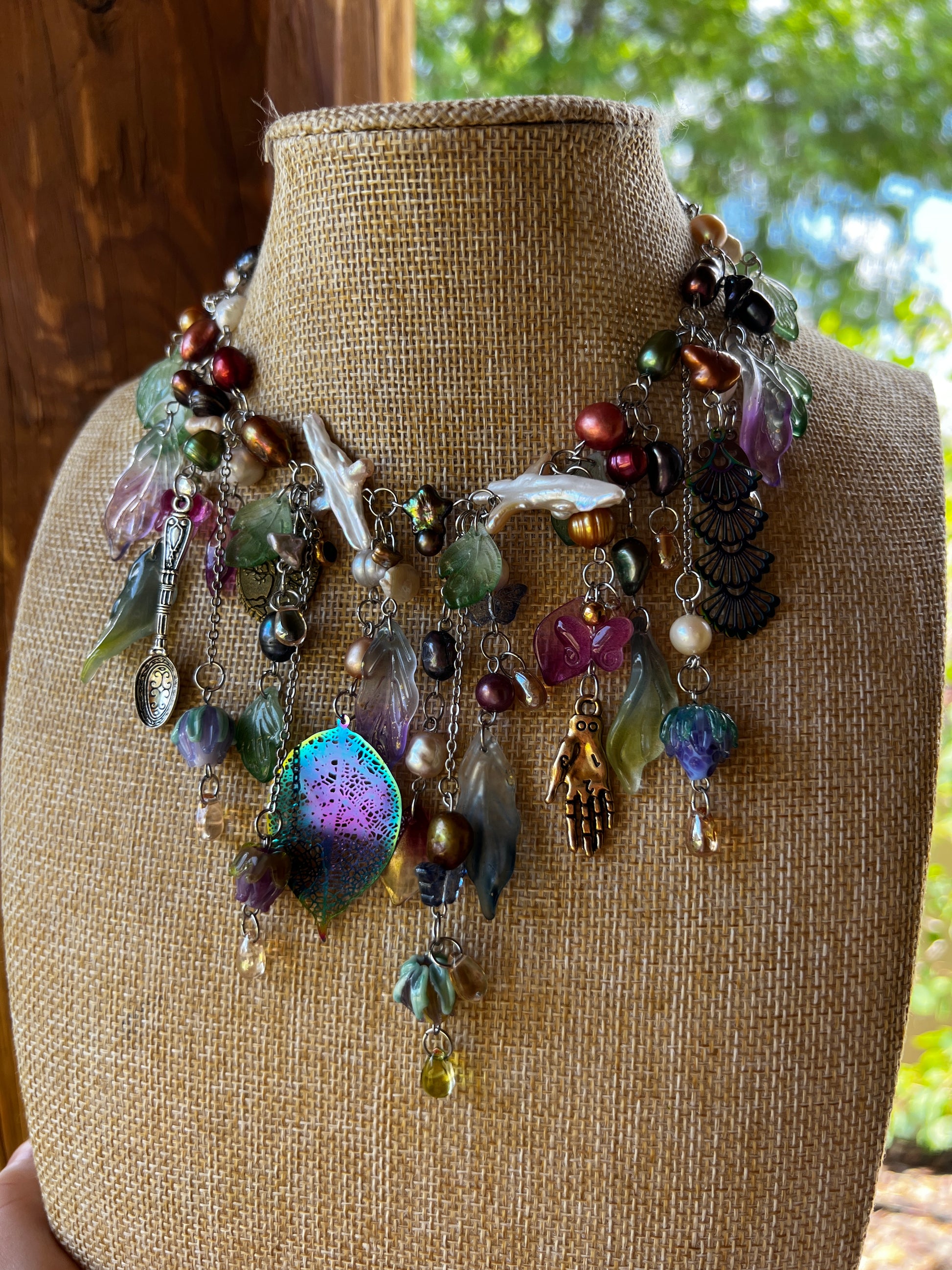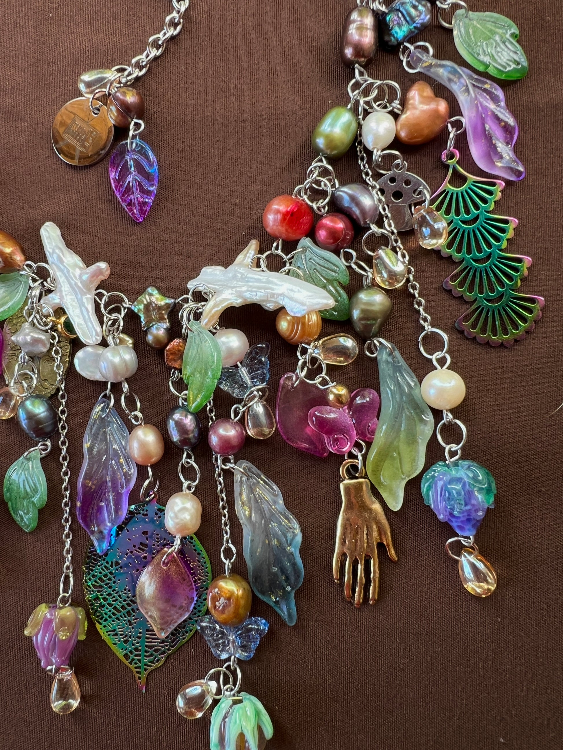 - 15-18 inches - stainless steel chain and hardware - glass and stone beads - mix of new, handmade and reclaimed charms and beads - reclaimed freshwater pearls