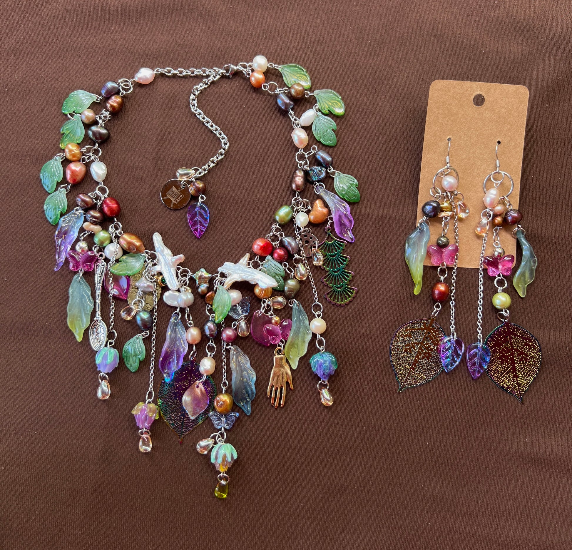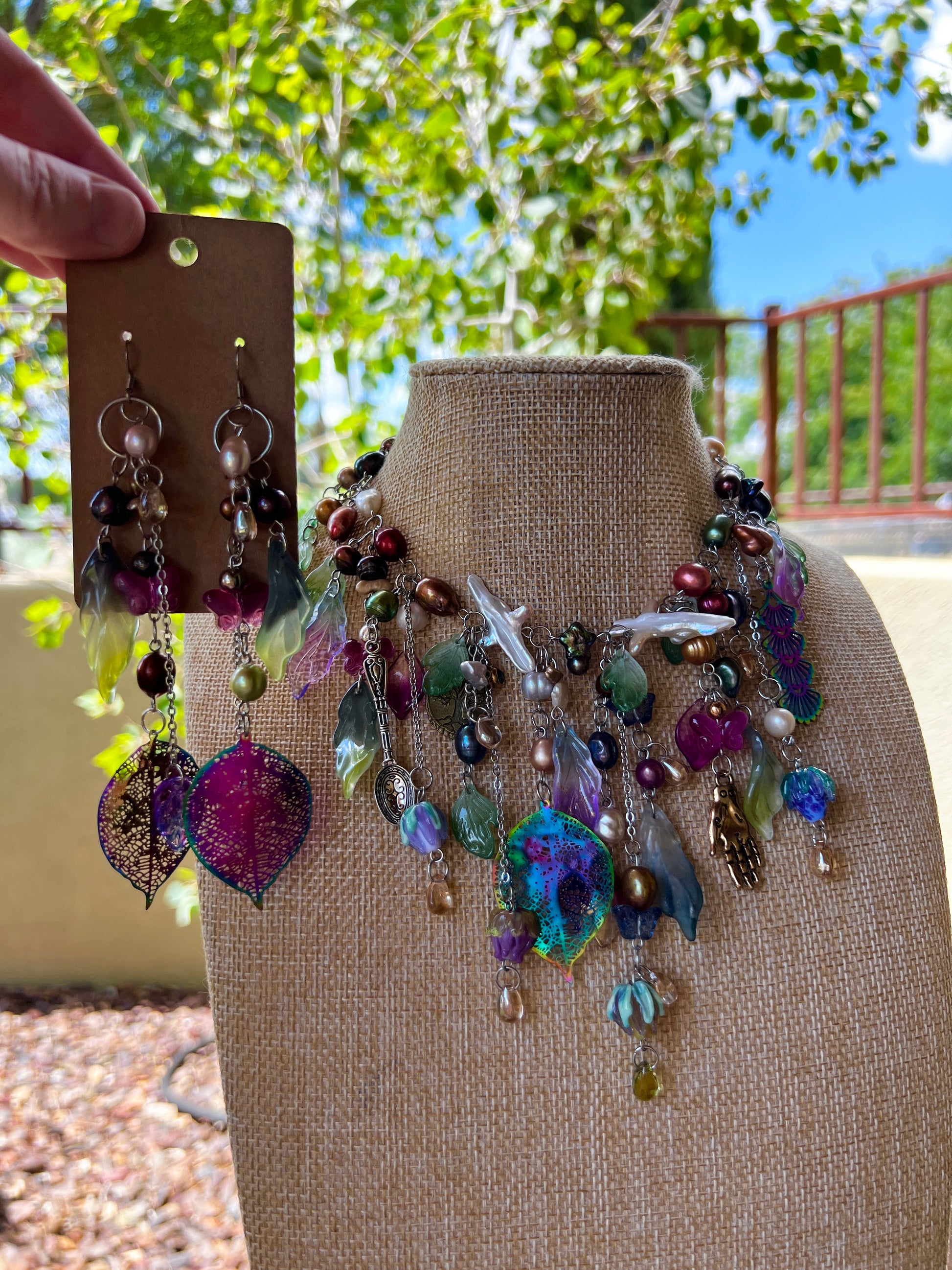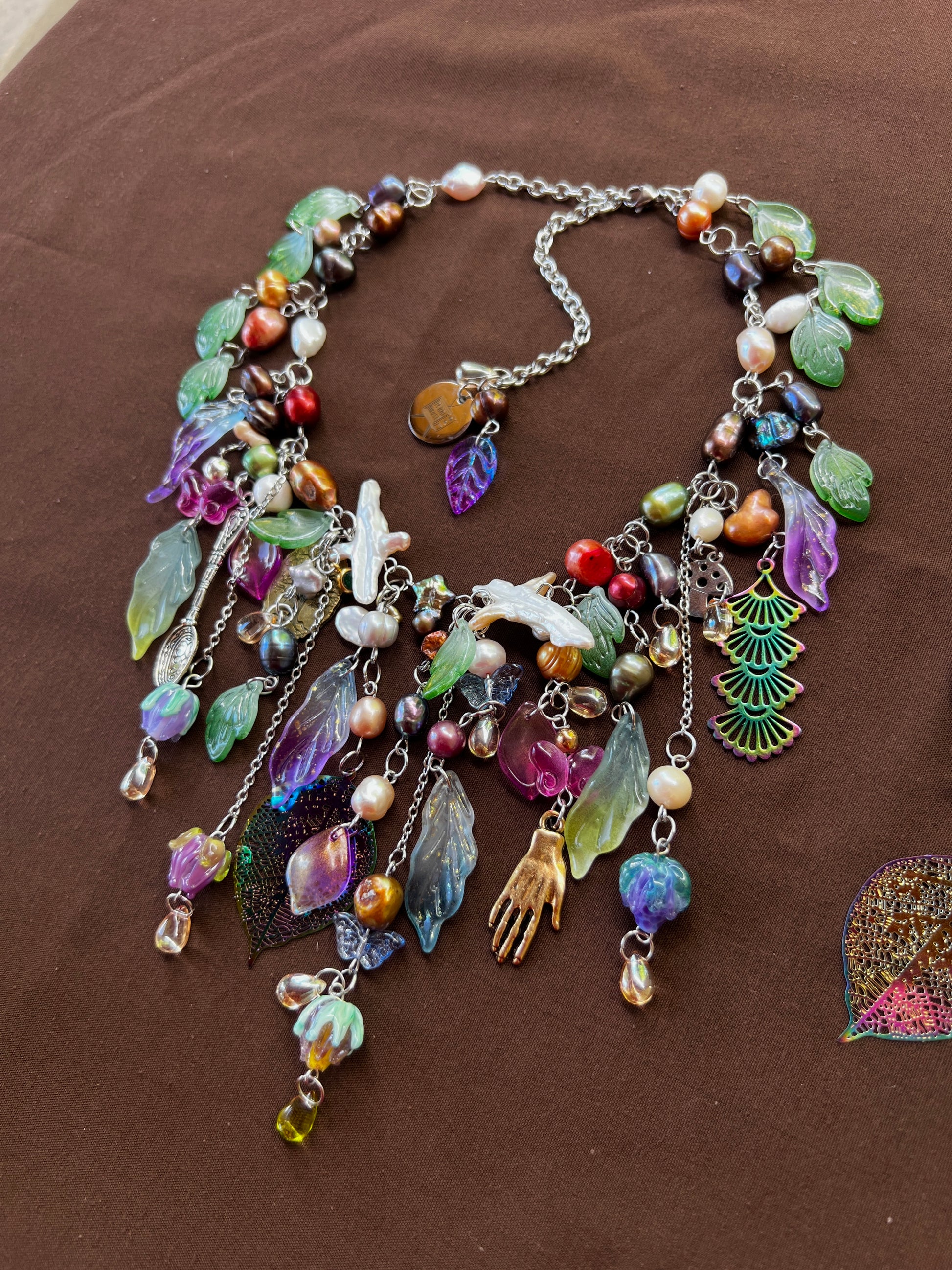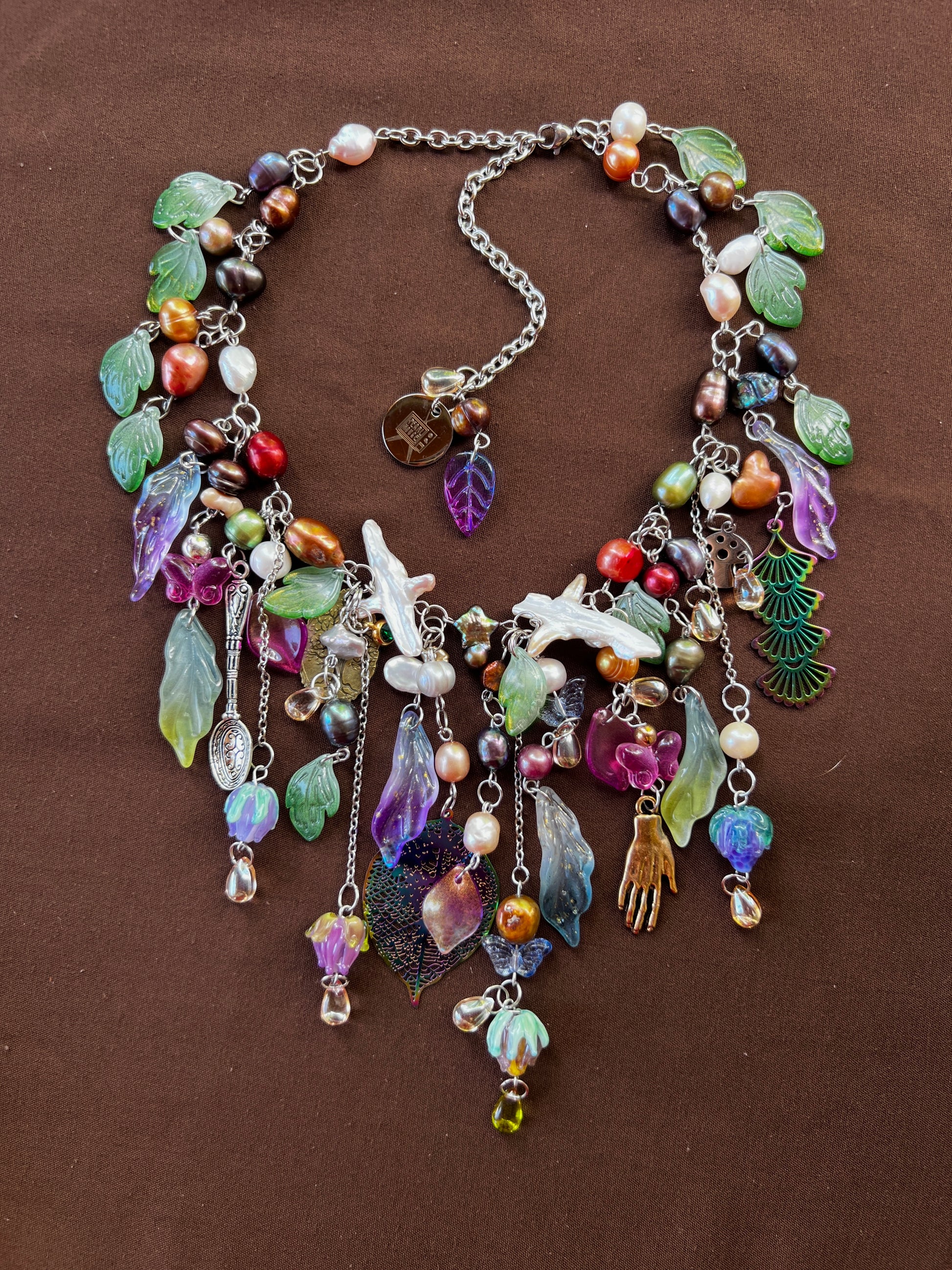 - 15-18 inches - stainless steel chain and hardware - glass and stone beads - mix of new, handmade and reclaimed charms and beads - reclaimed freshwater pearls