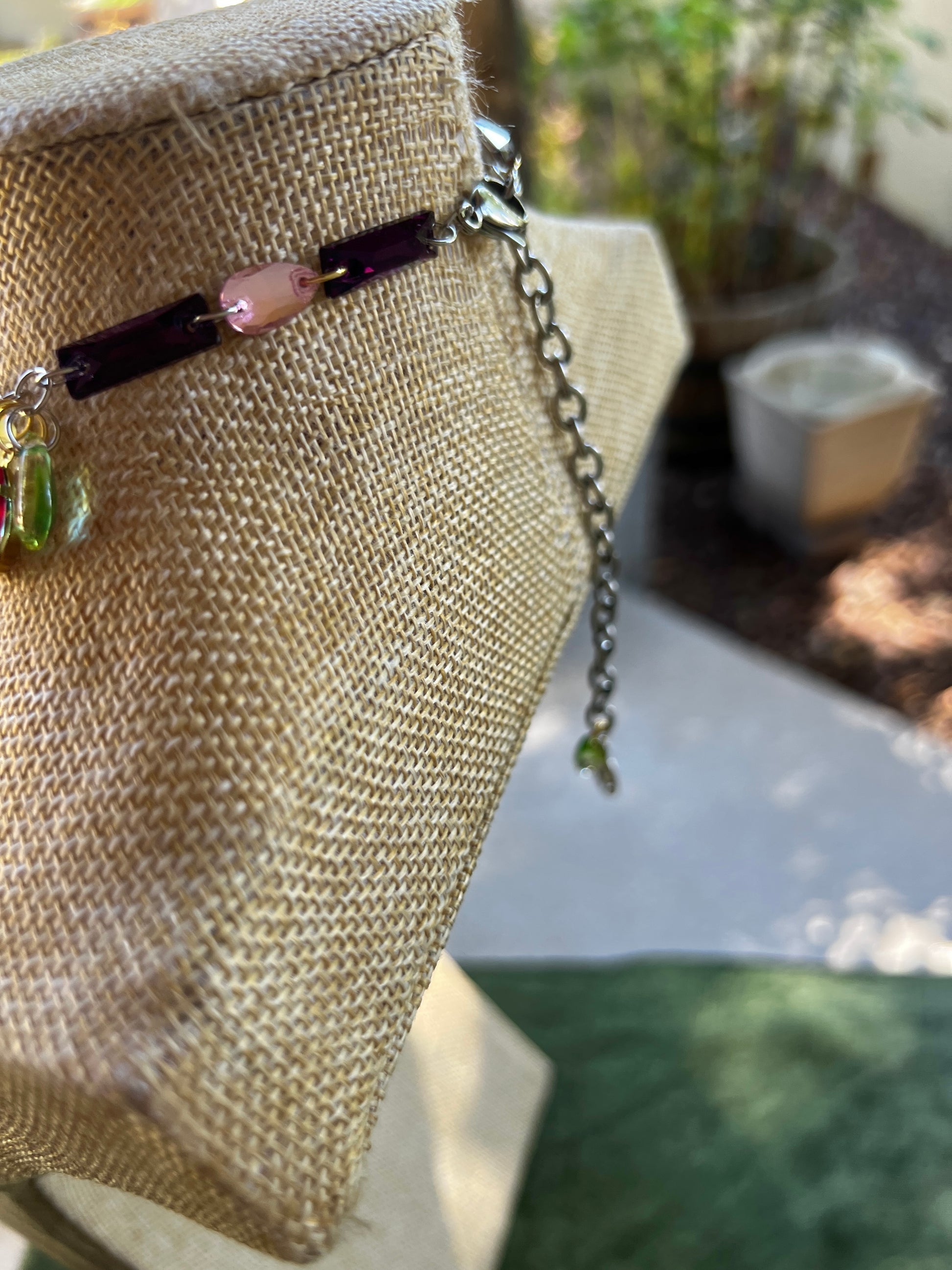 - 12.5-14 inches - glass crystals - stainless steel chain and hardware - glass, gold plate and stainless steel charms