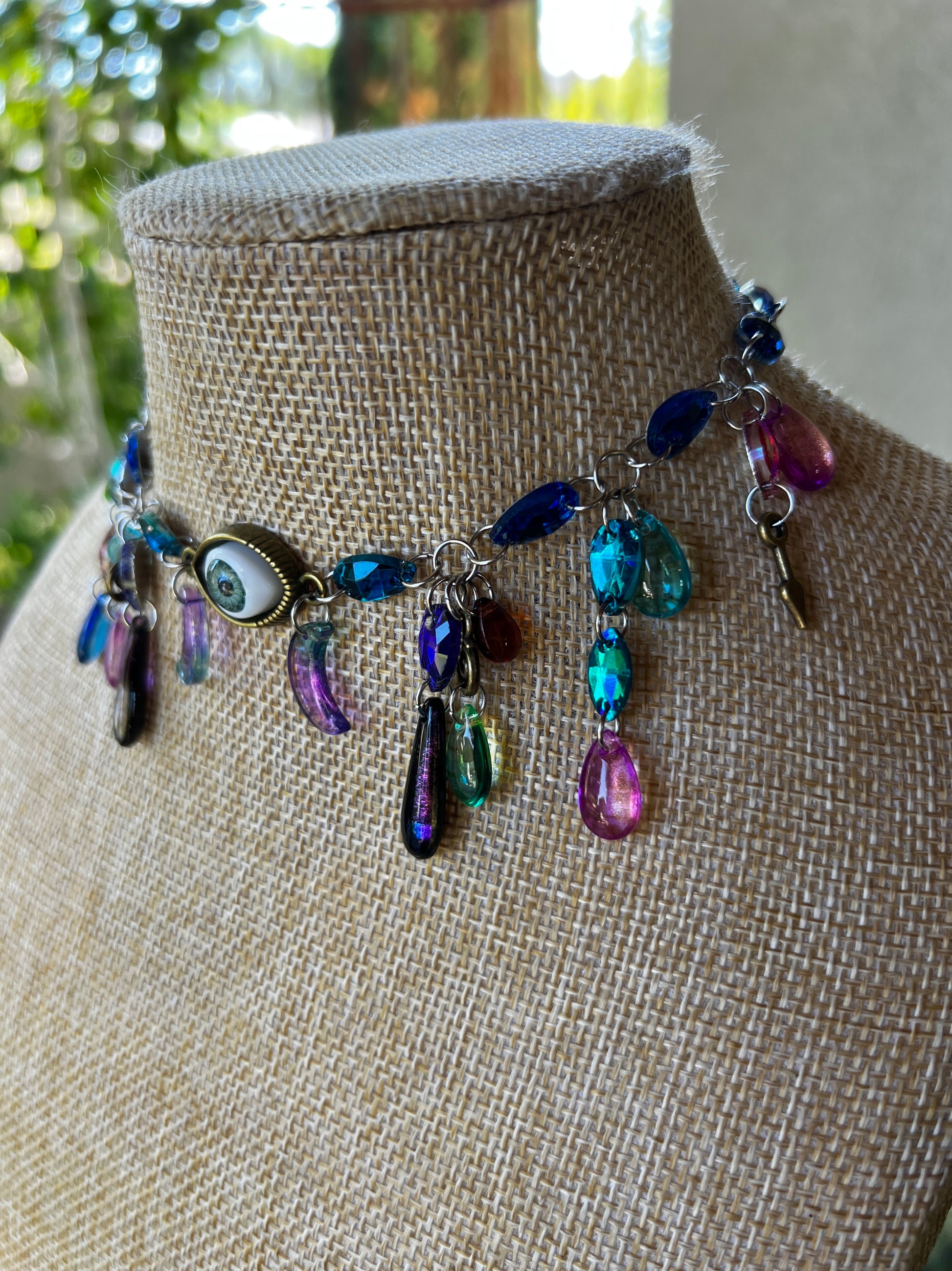 - 12.5-14 inches - glass crystals - stainless steel chain and hardware - glass, gold plate and stainless steel charms