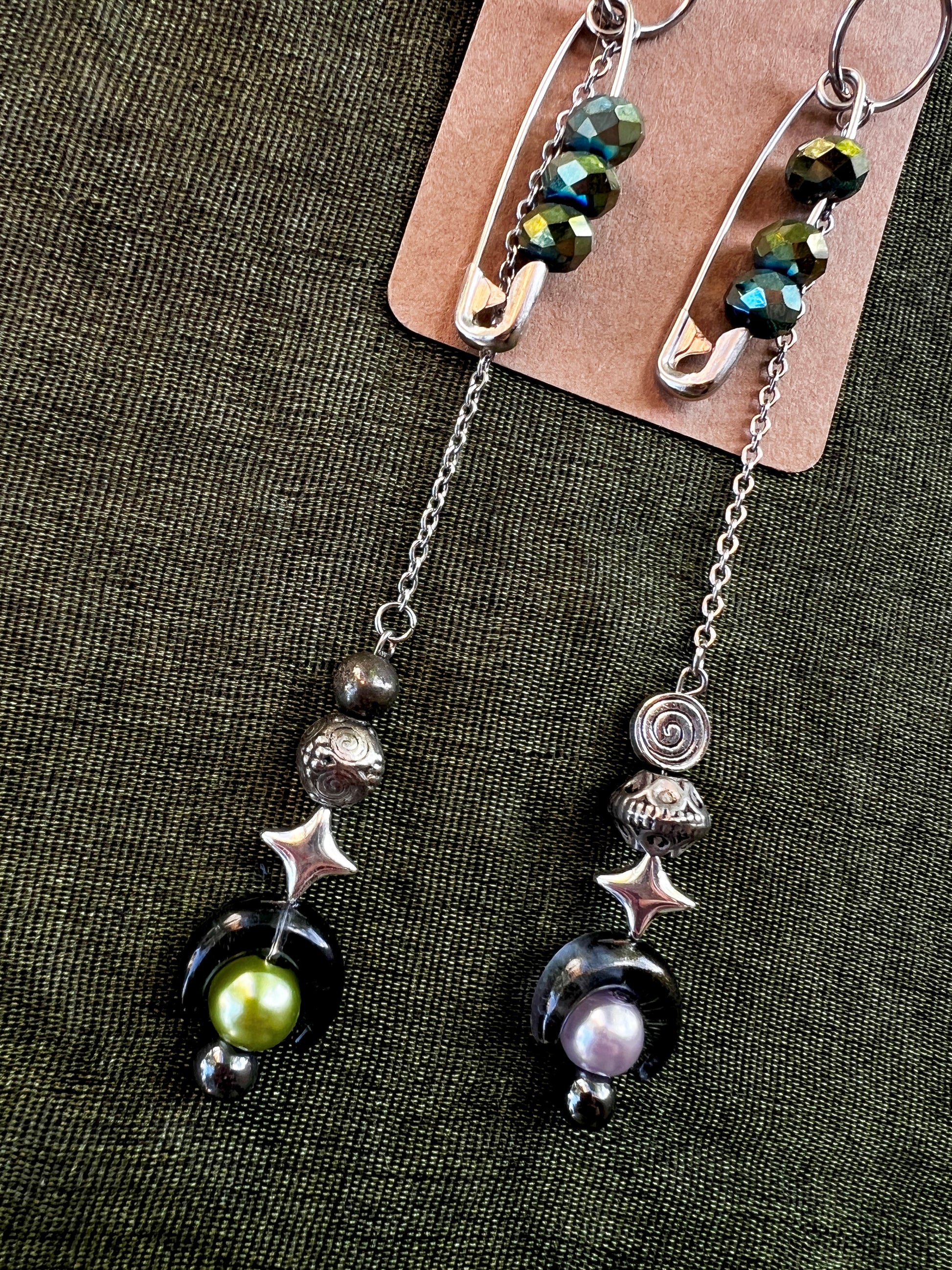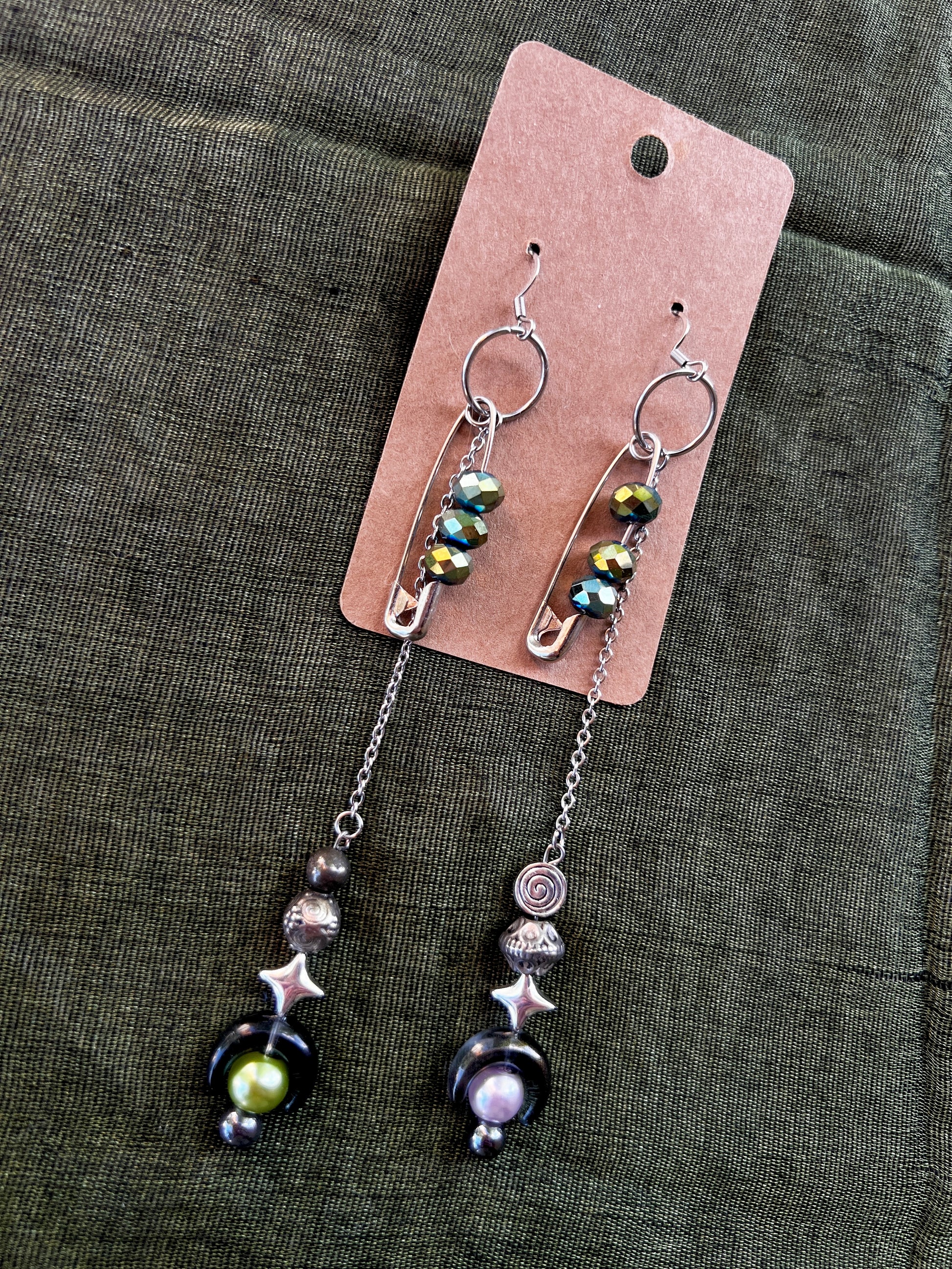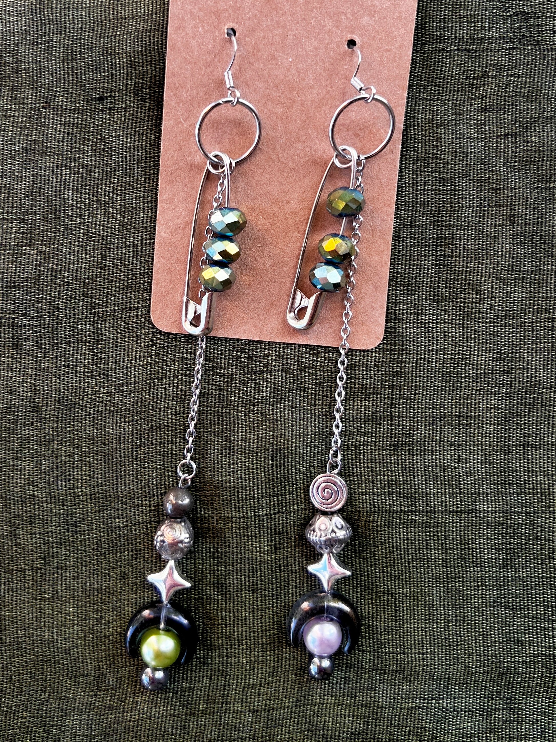- stainless steel hardware and hooks - 3.5 inches - steel charms - glass and reclaimed metal beads - reclaimed safety pins