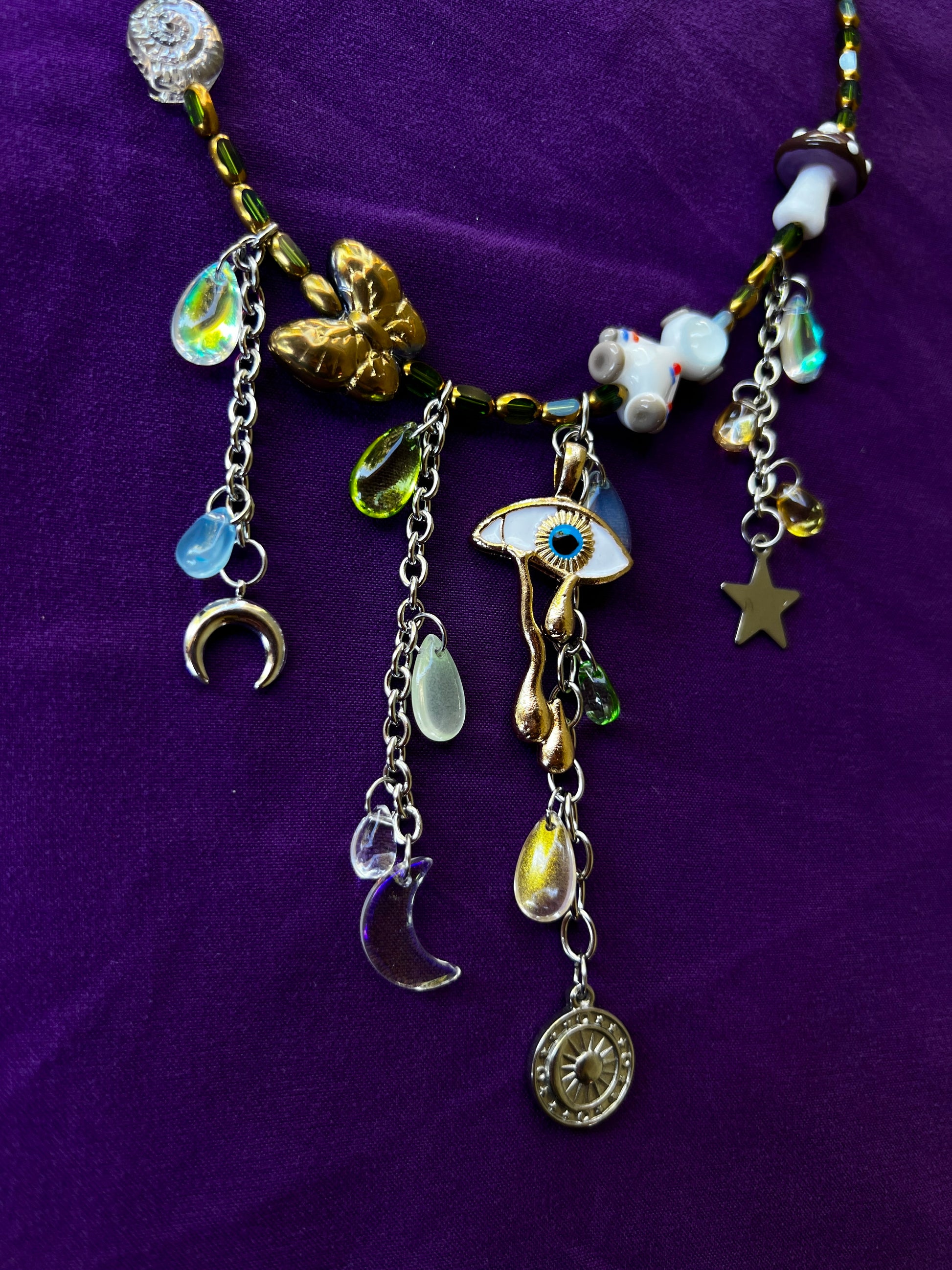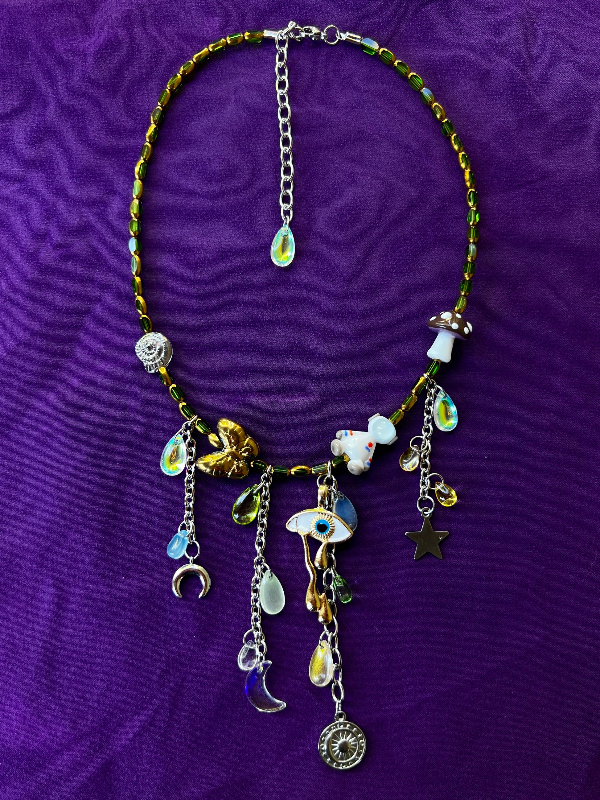 - 15-18 inches - new and reclaimed beads - glass and ceramic beads - stainless steel chain and hardware - handmade astronaut bead - steel, gold plate and glass charms