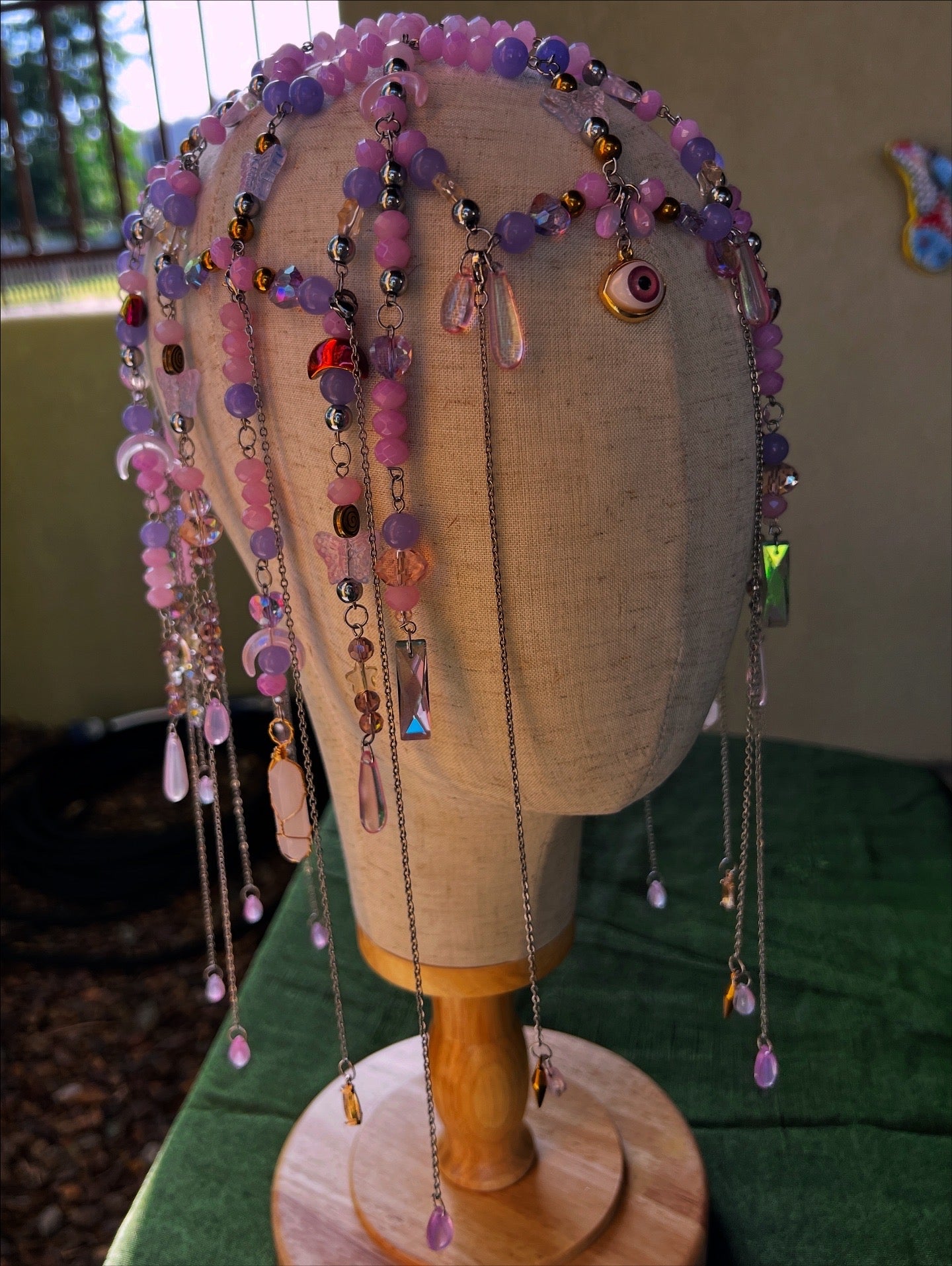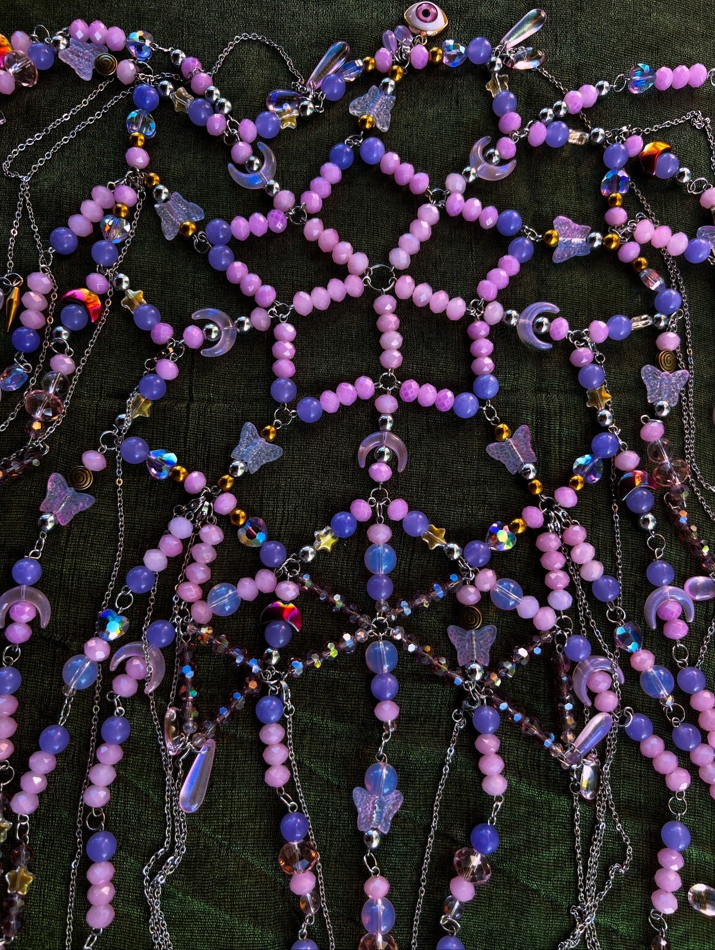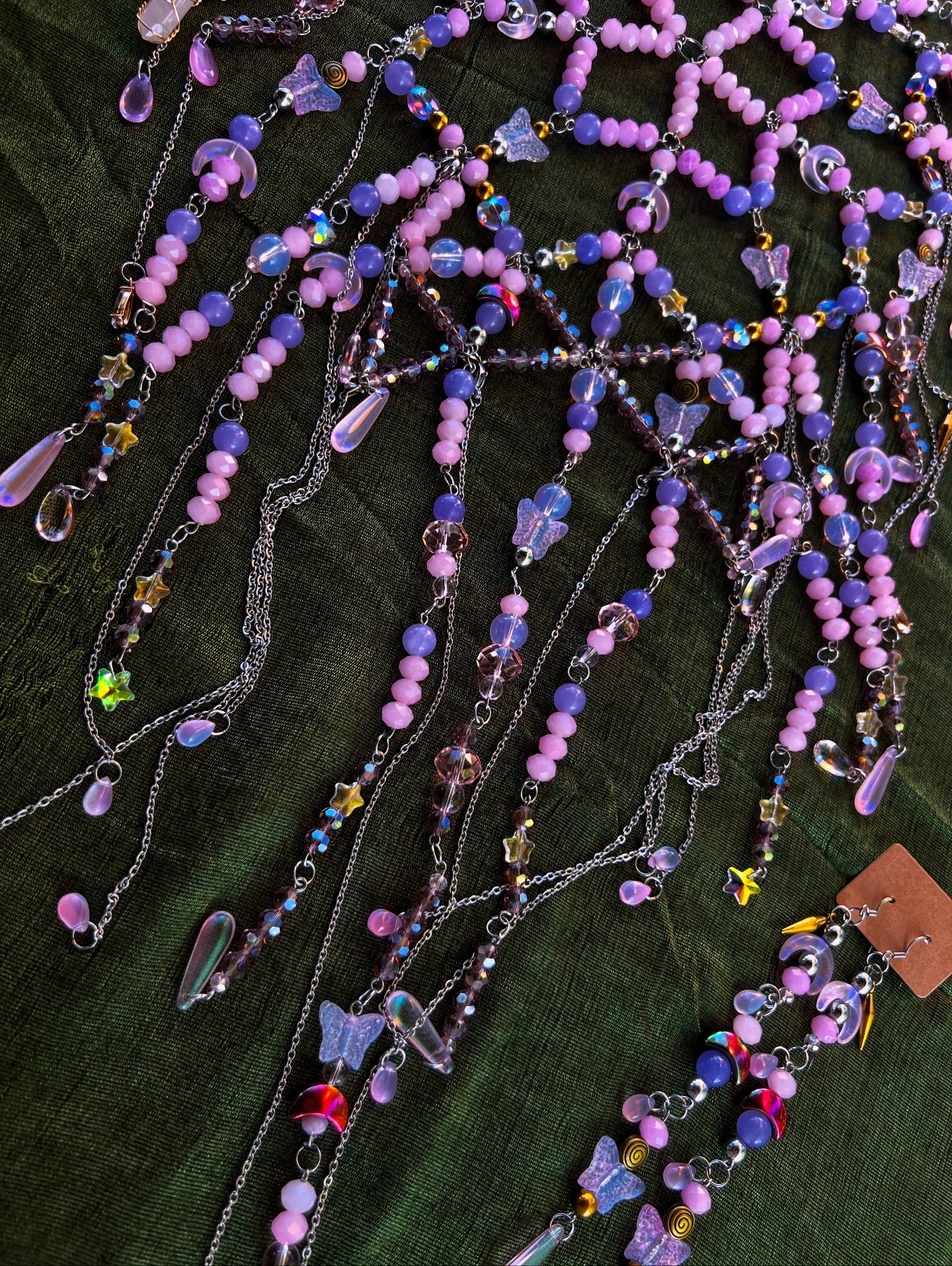 - stainless steel chain and hardware - glass beads - glass and stainless steel charms - removable center eye and small dangly chains - one size fits all