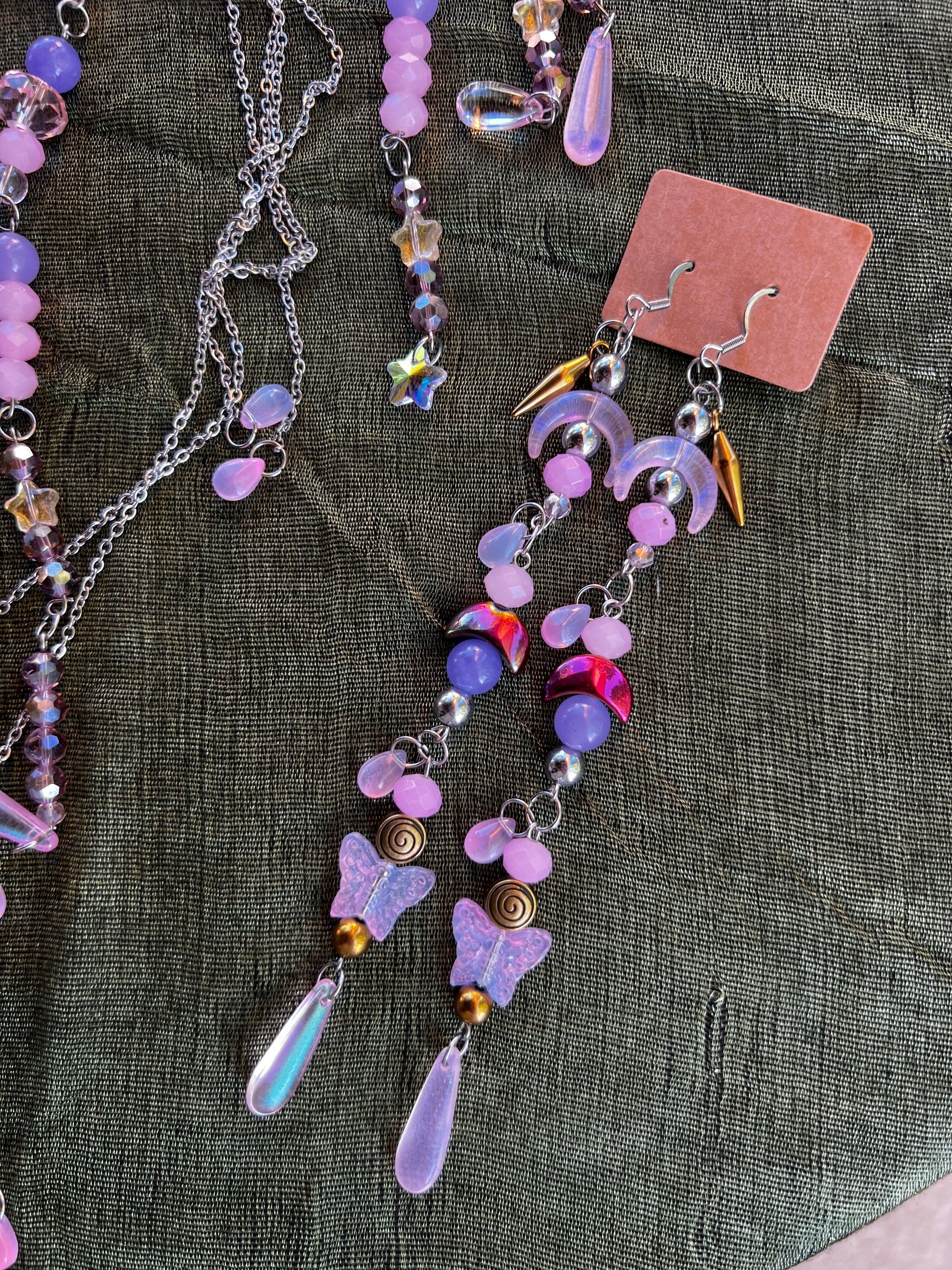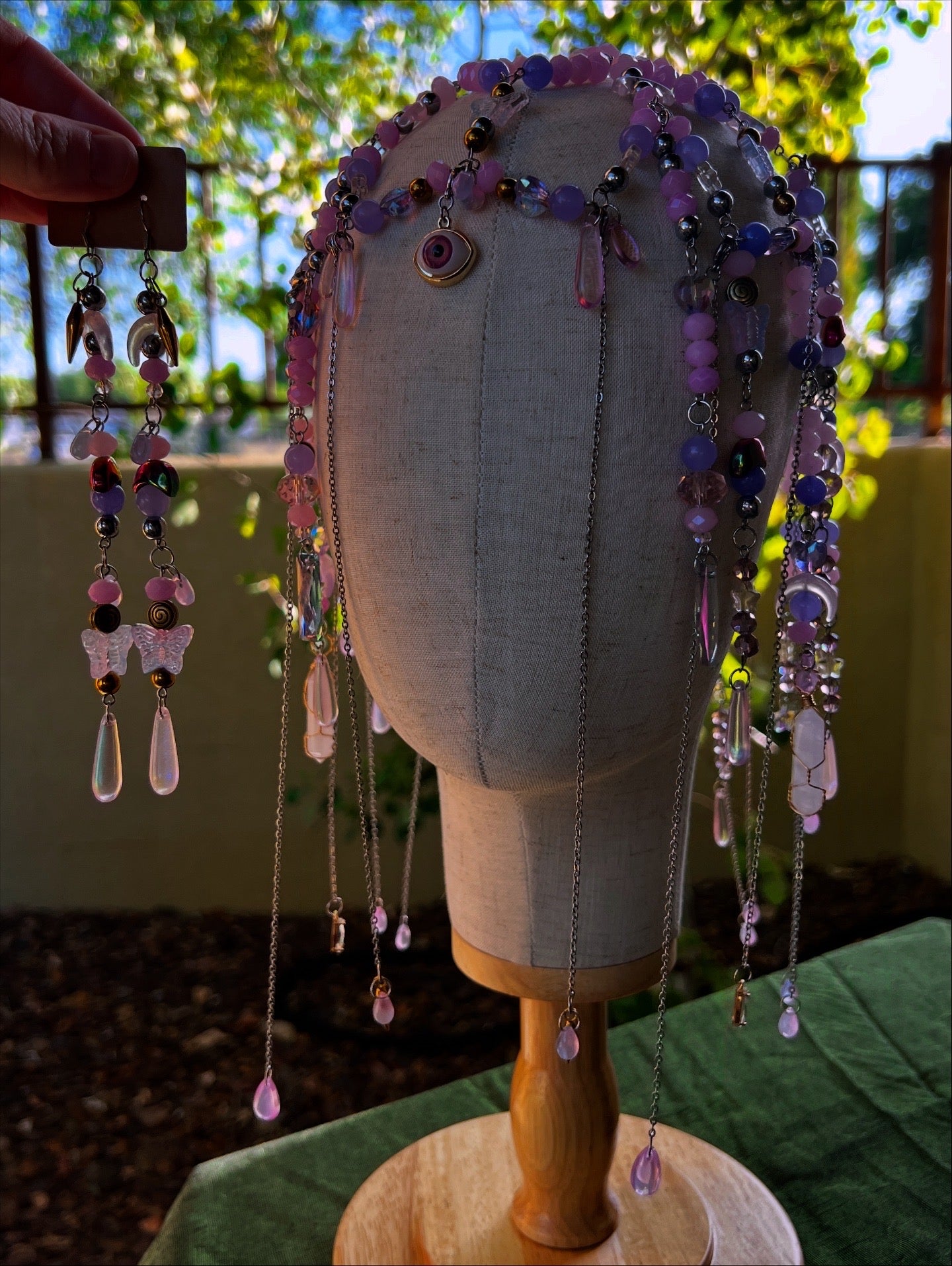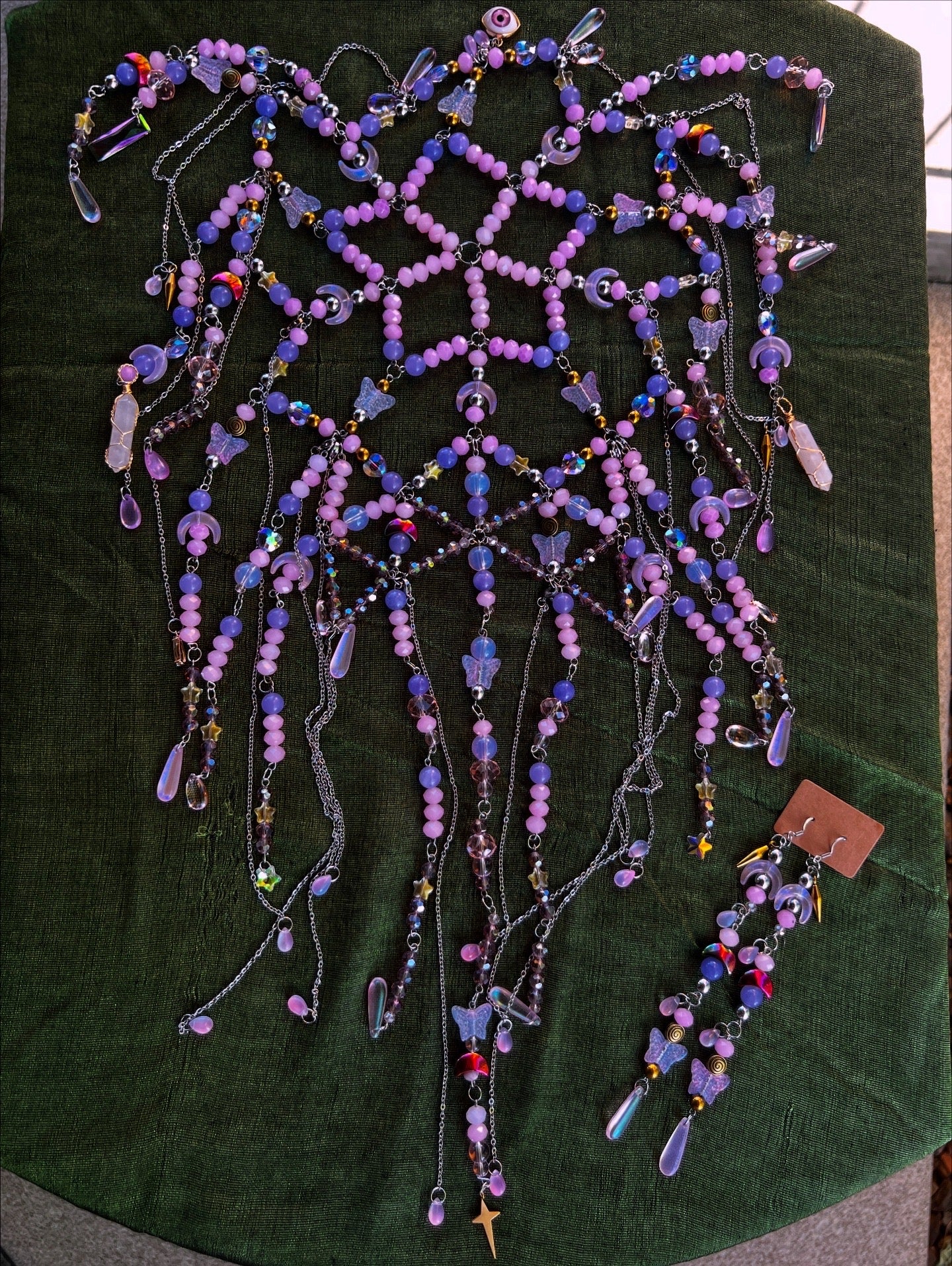 - stainless steel chain and hardware - glass beads - glass and stainless steel charms - removable center eye and small dangly chains - one size fits all
