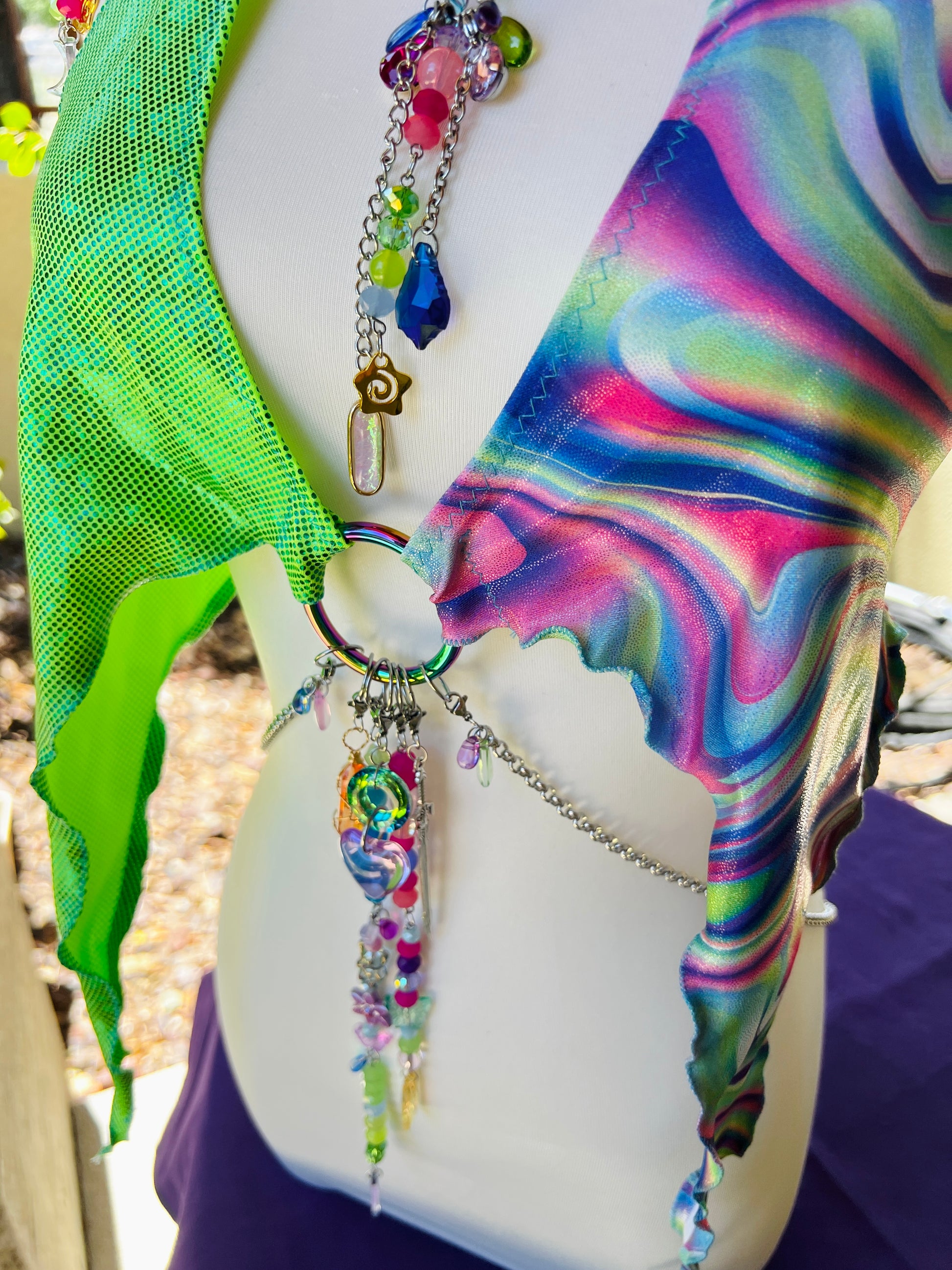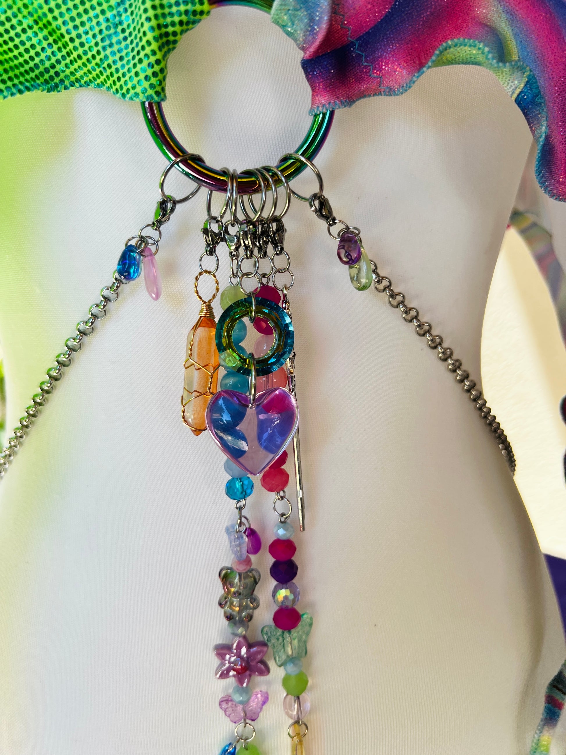 The Goddess Speaks Beaded Halter Top - Mr.Wacko Collaboration - size Large spandex O ring Halter Top + earrings + removable chains & charms + cosmic drip chain + crystal choker