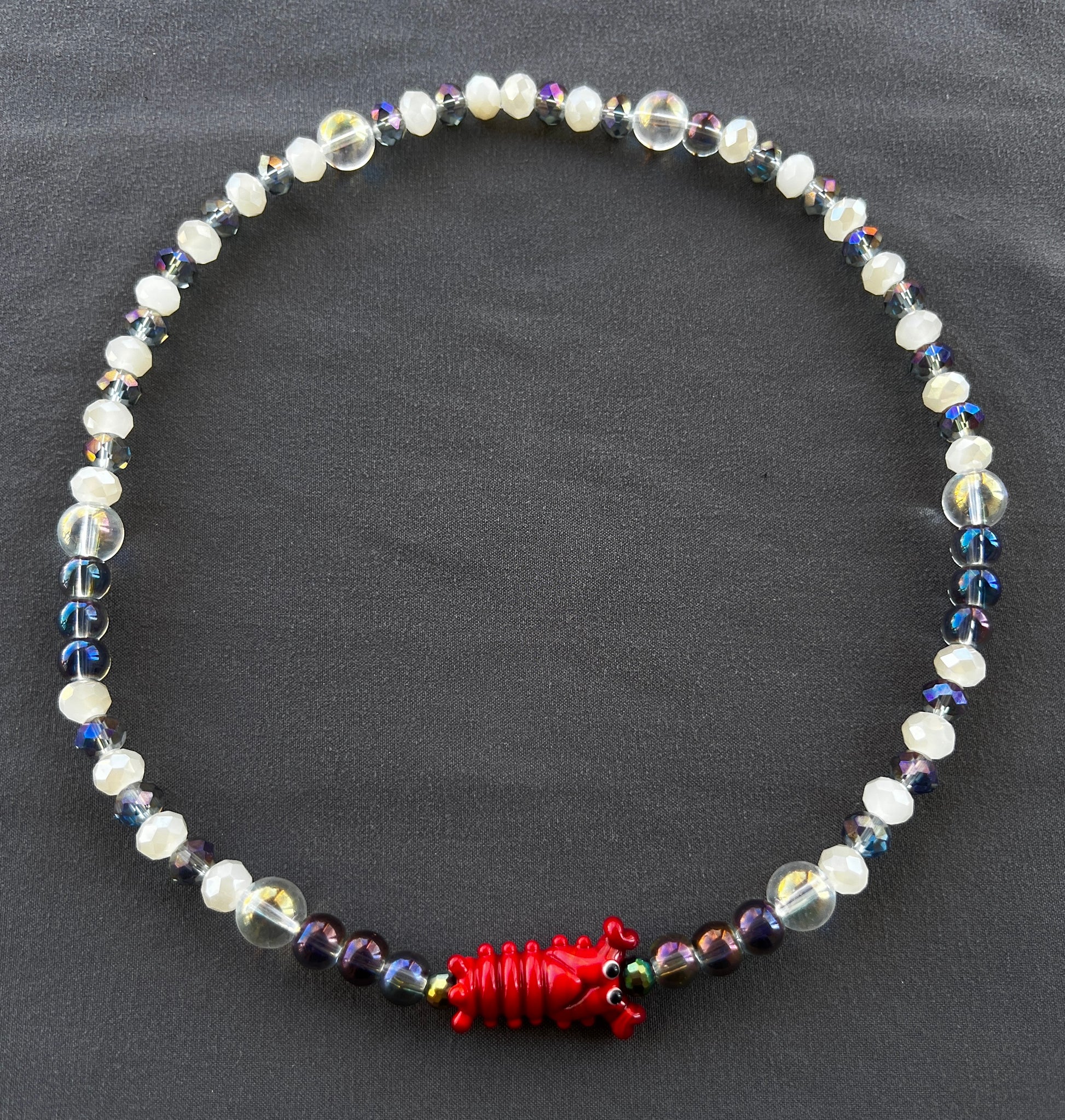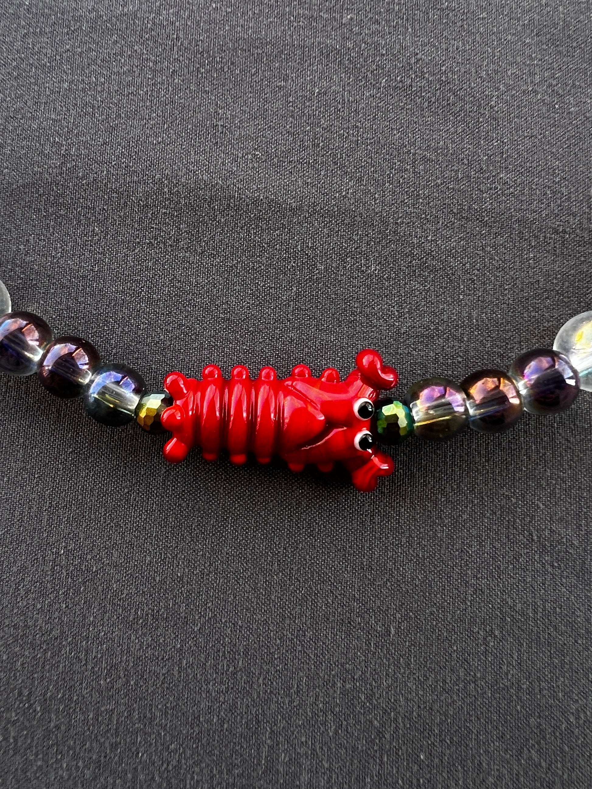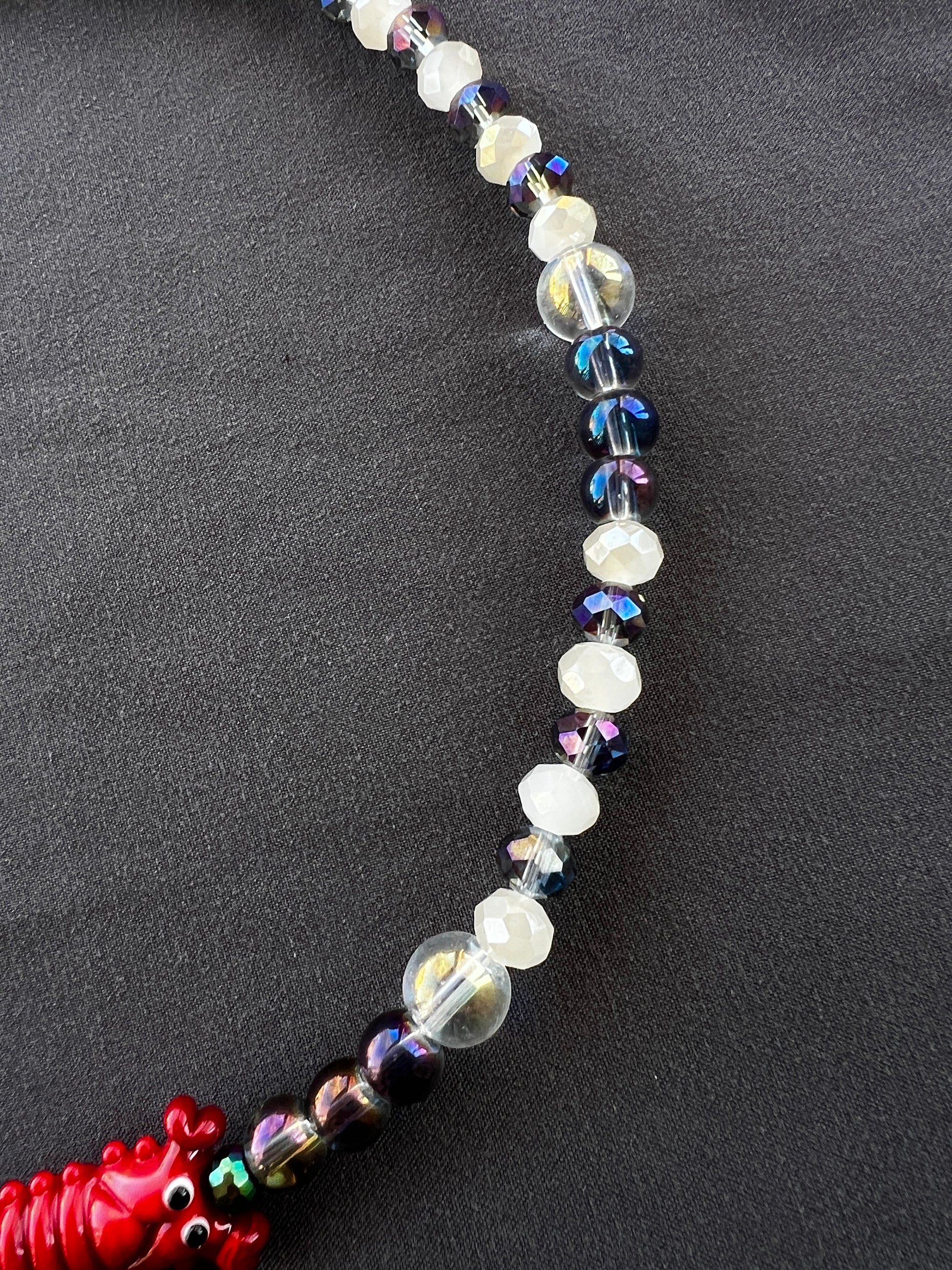 - one size fits all - 17-22 inches - gentle strong stretch rolls over the top of the head - perfect for active movement - glass beads - handmade glass lobster center piece bead