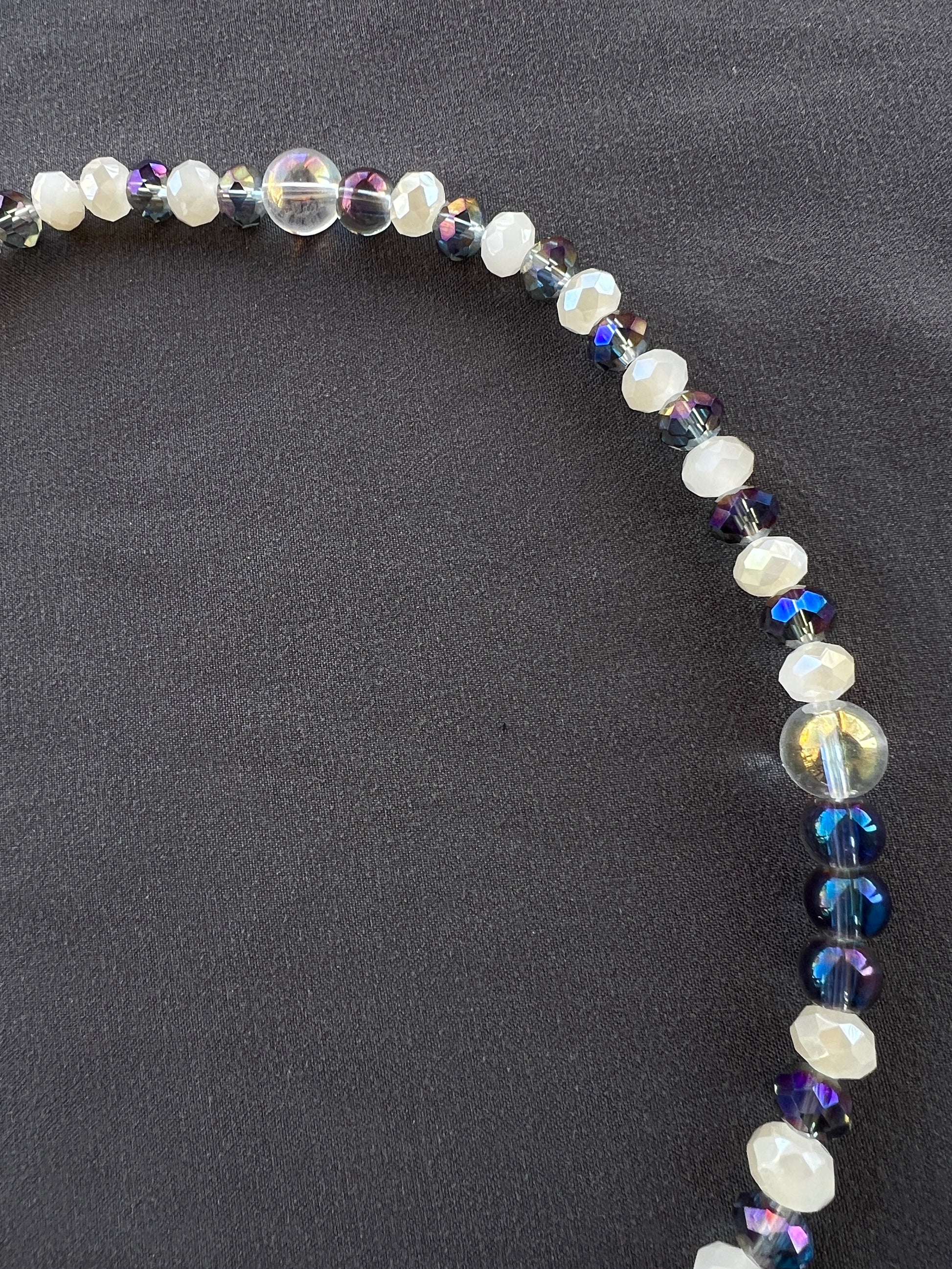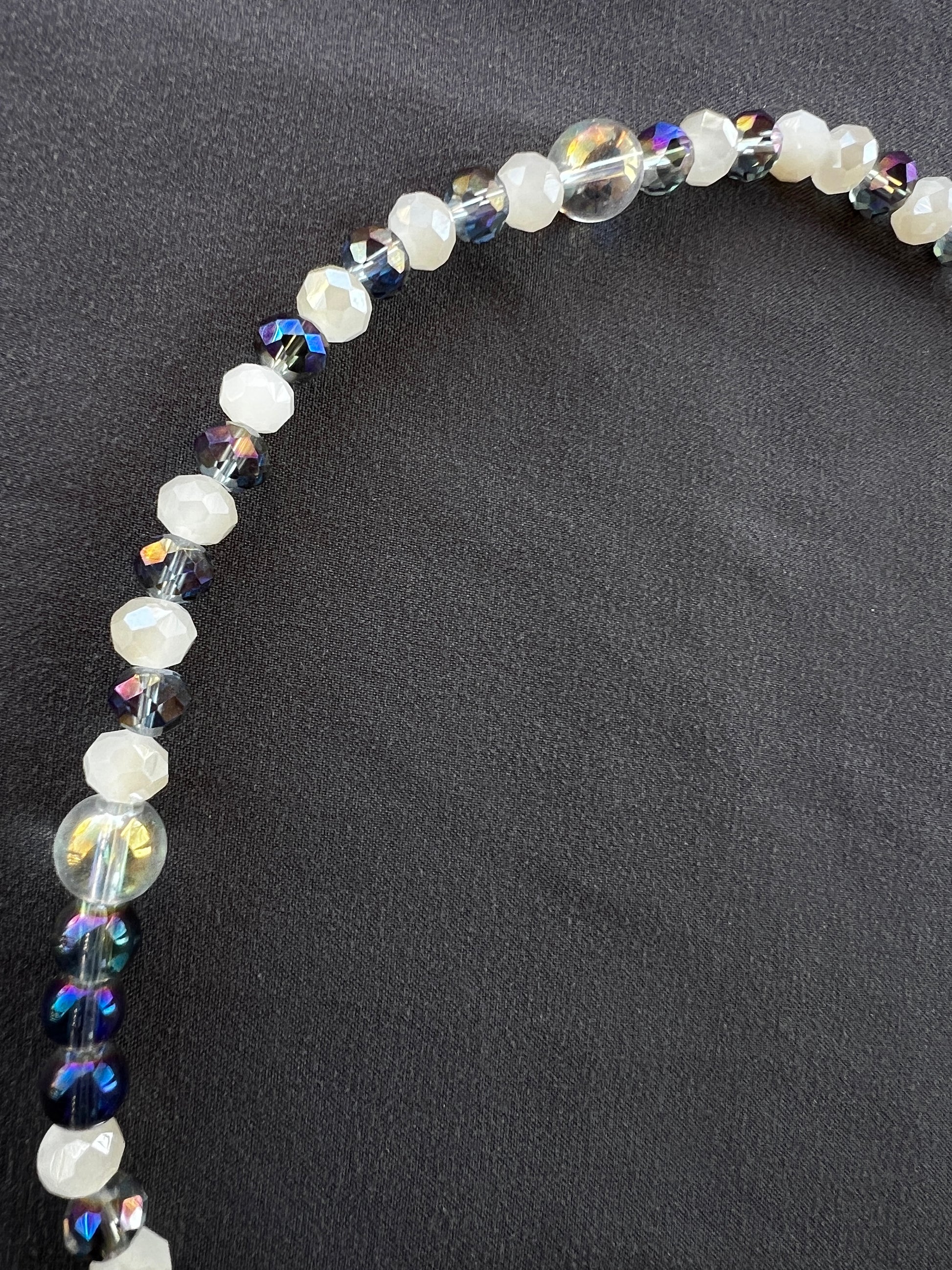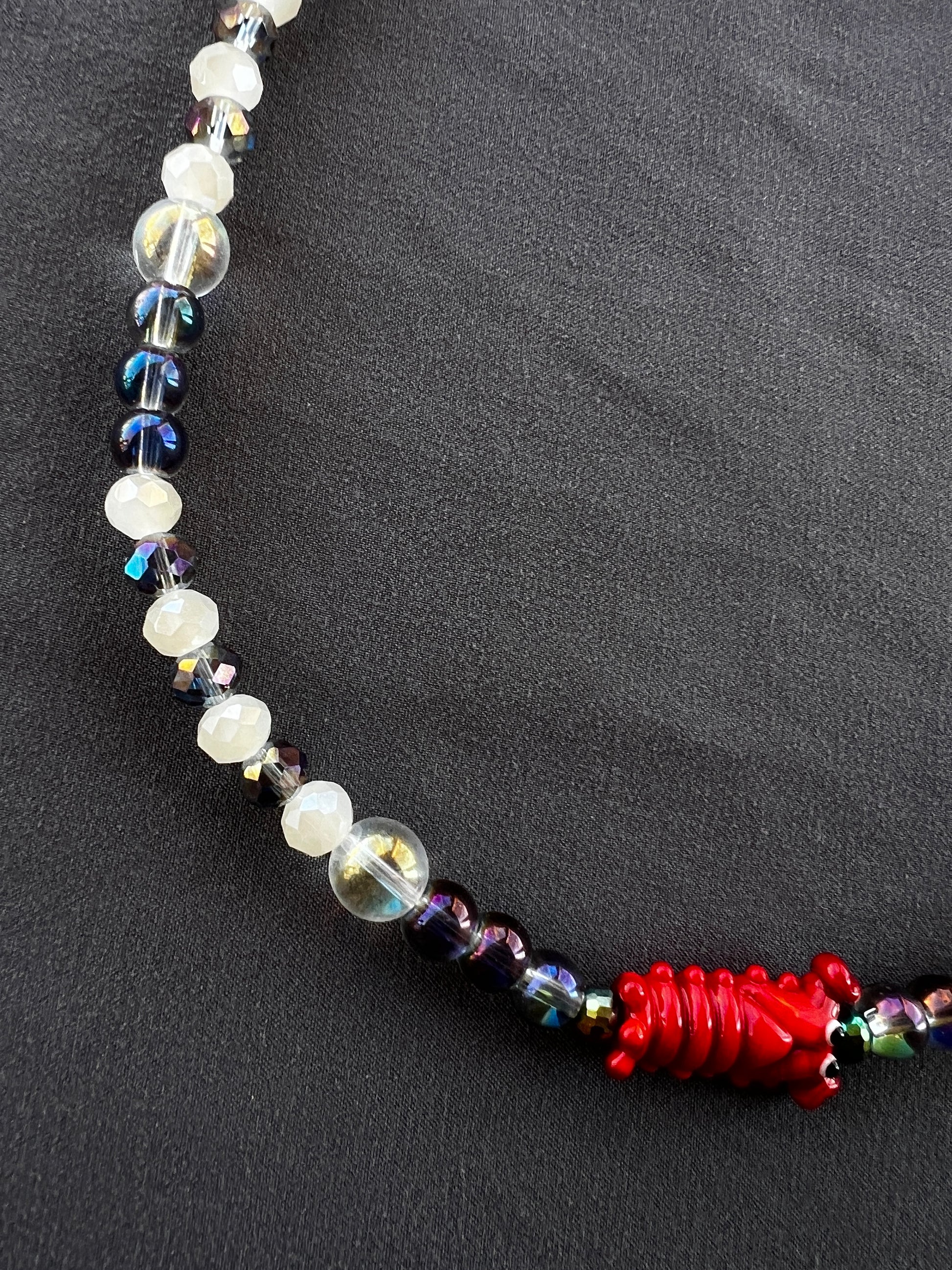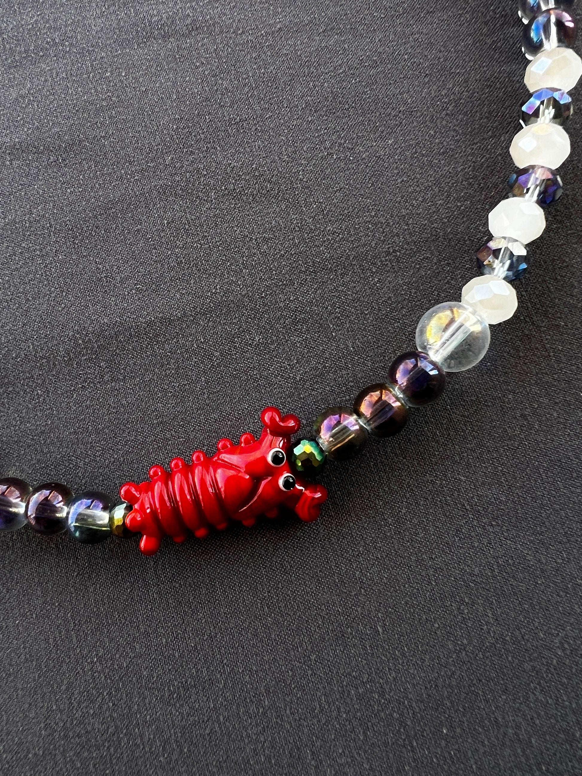 - one size fits all - 17-22 inches - gentle strong stretch rolls over the top of the head - perfect for active movement - glass beads - handmade glass lobster center piece bead
