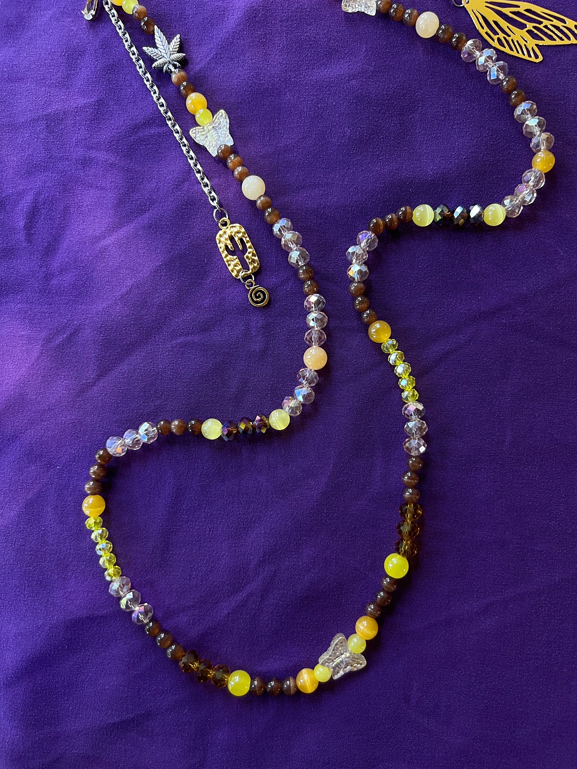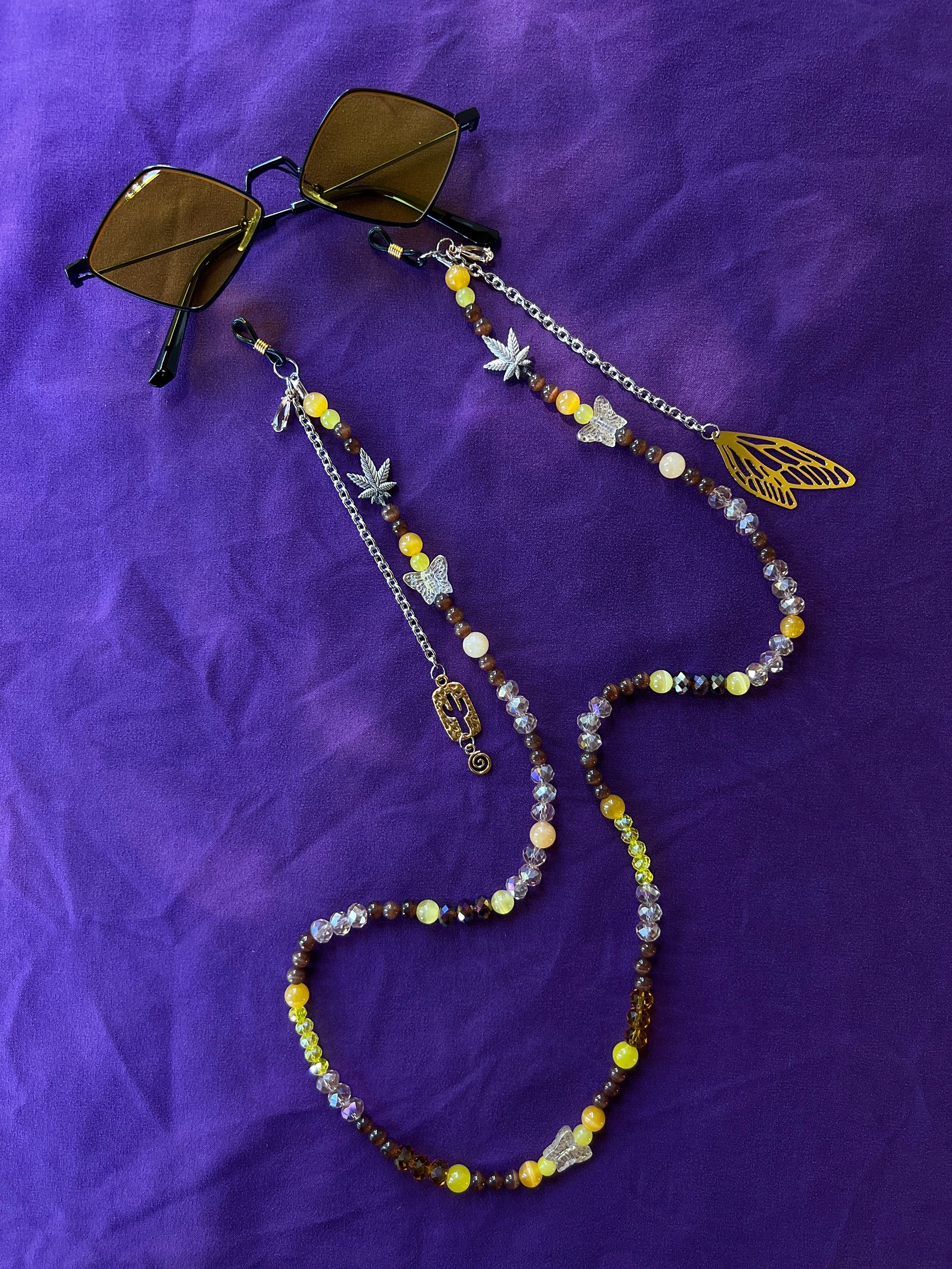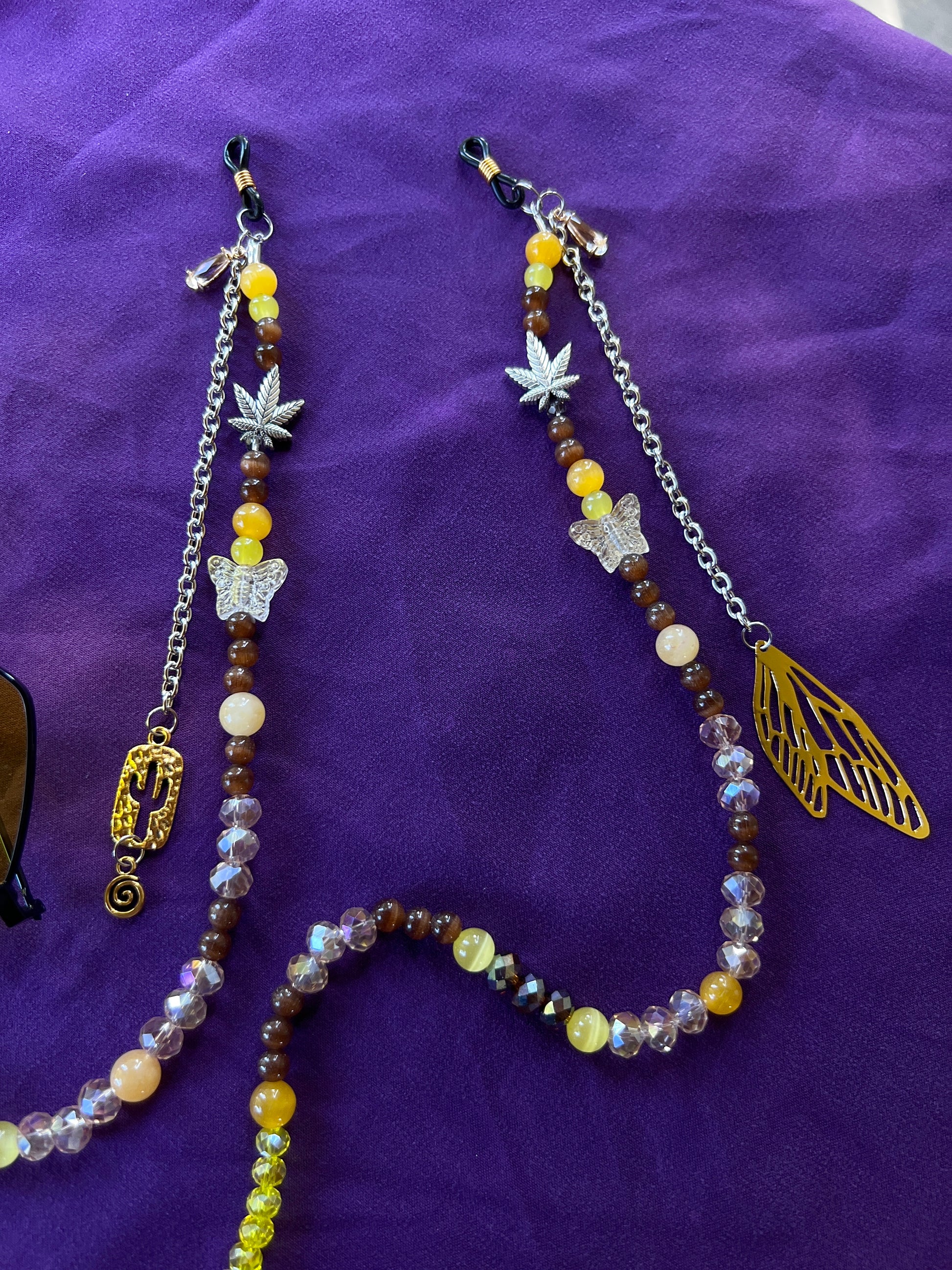 - one size fits all - new and reclaimed beads - glass and ceramic beads - stainless steel chain and hardware - glass and steel charms - rubber adjustable glasses loops - includes pictured sunglasses and glasses chain