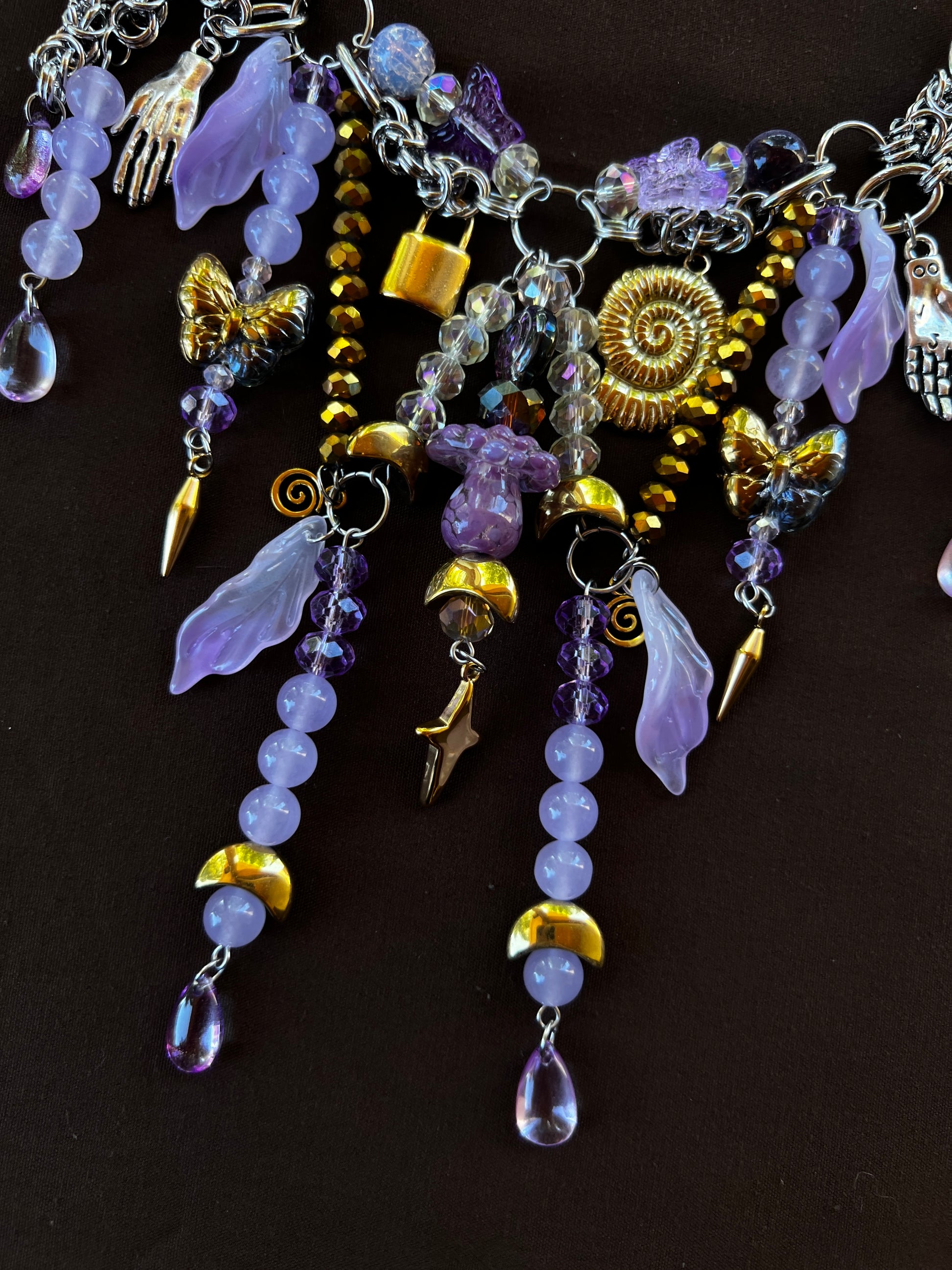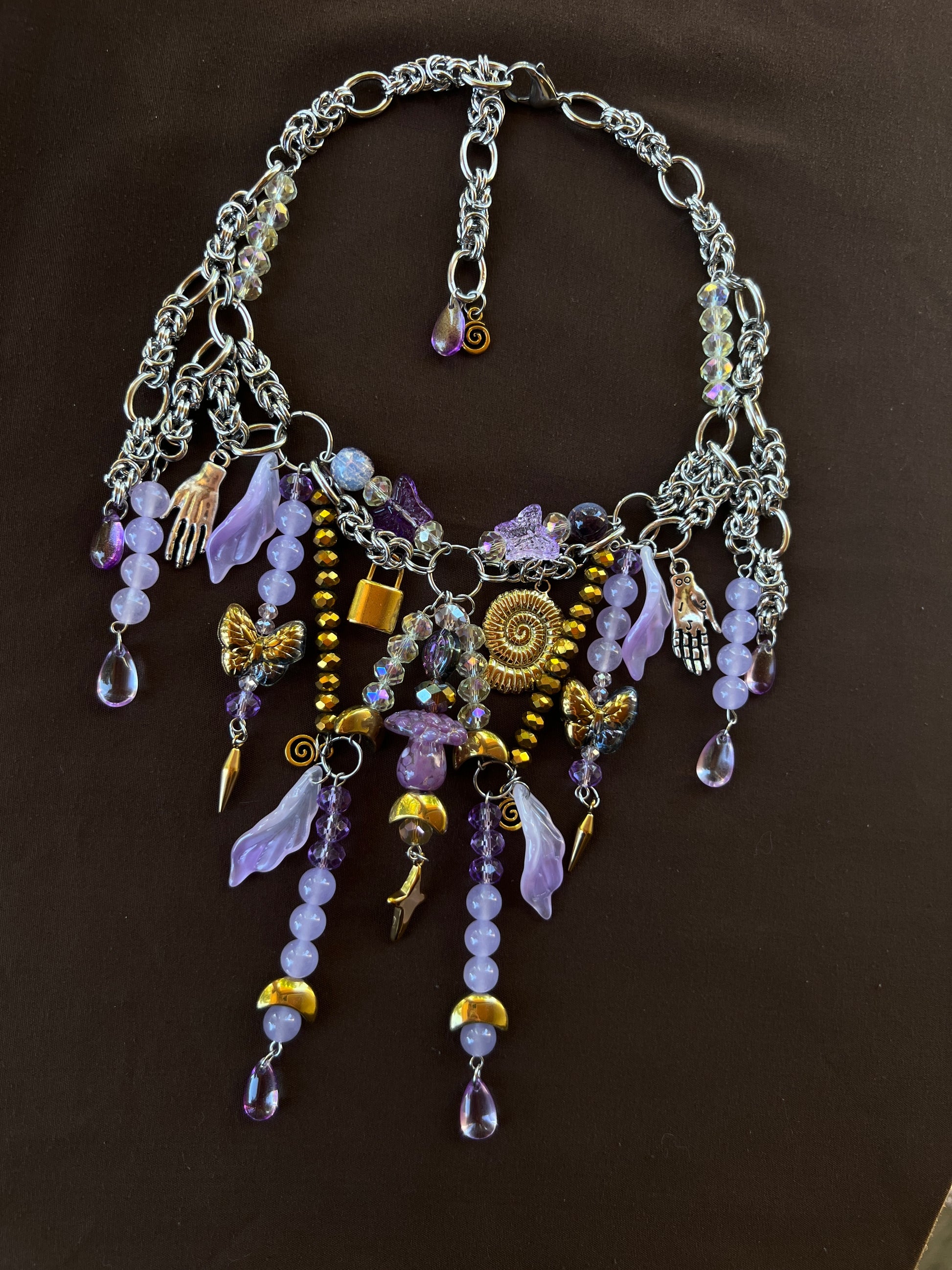 - 14-18 inches - glass and ceramic beads - stainless steel chain and hardware - glass, silver plate, amethyst and stainless charms - handmade glass mushroom